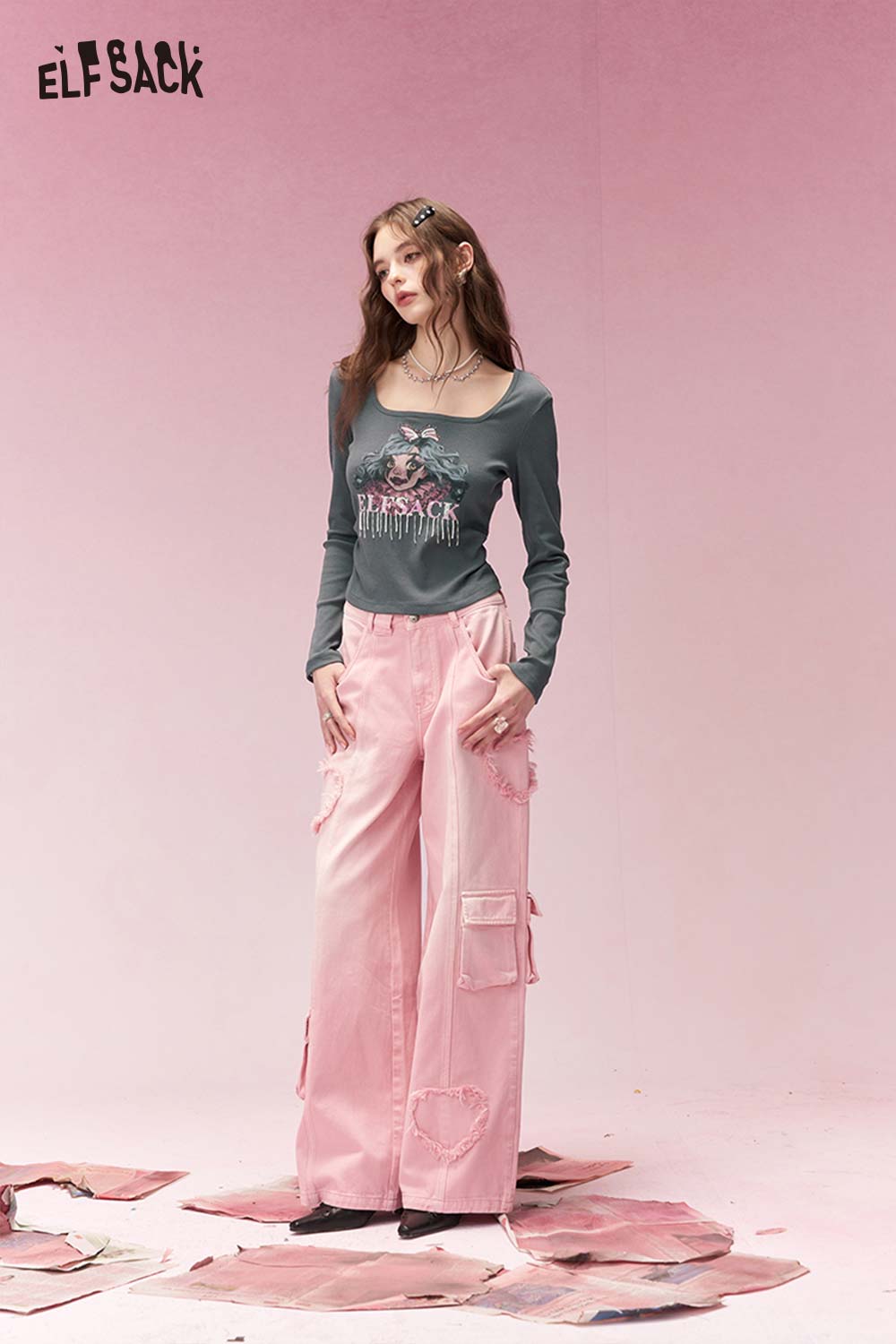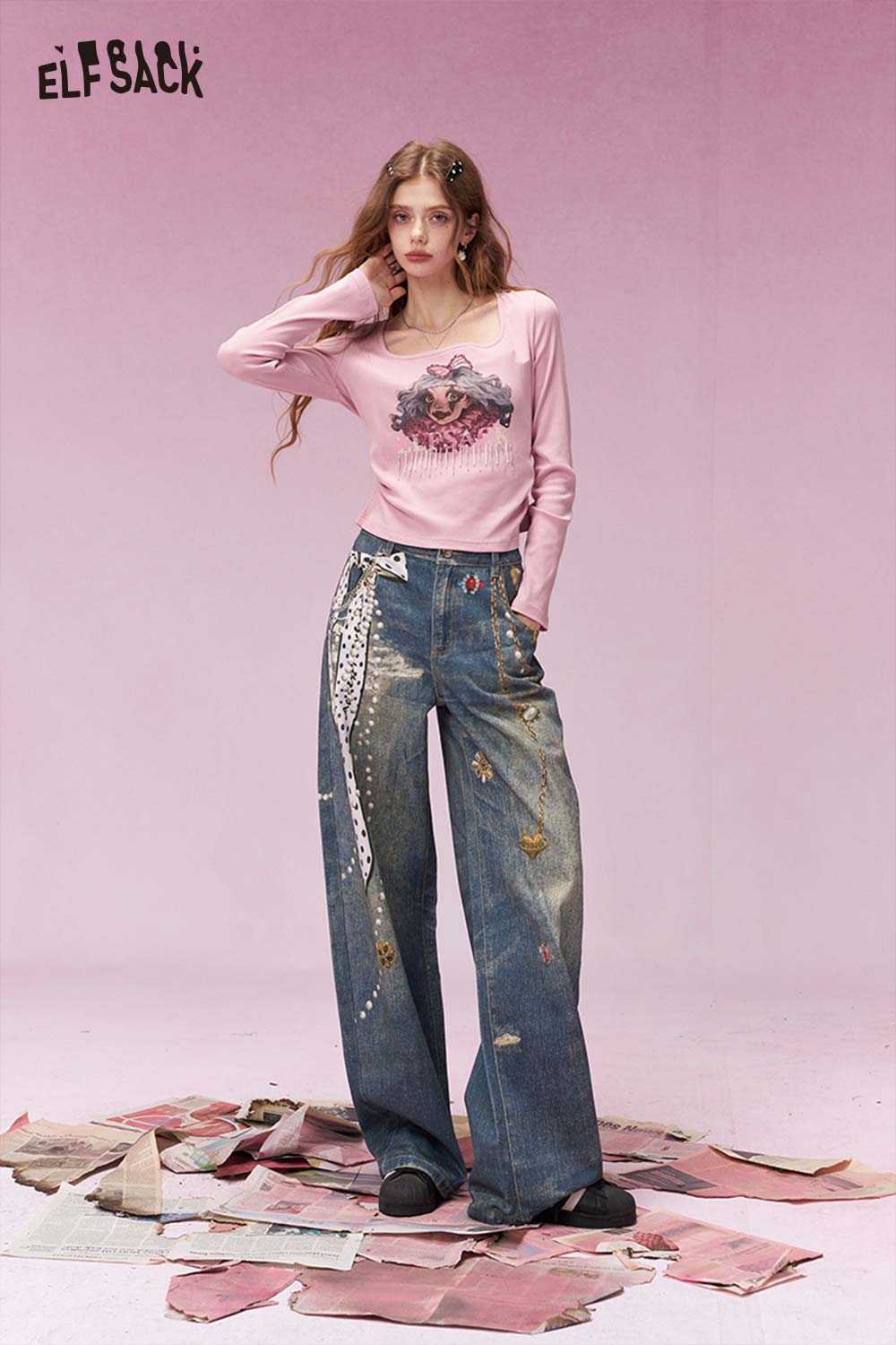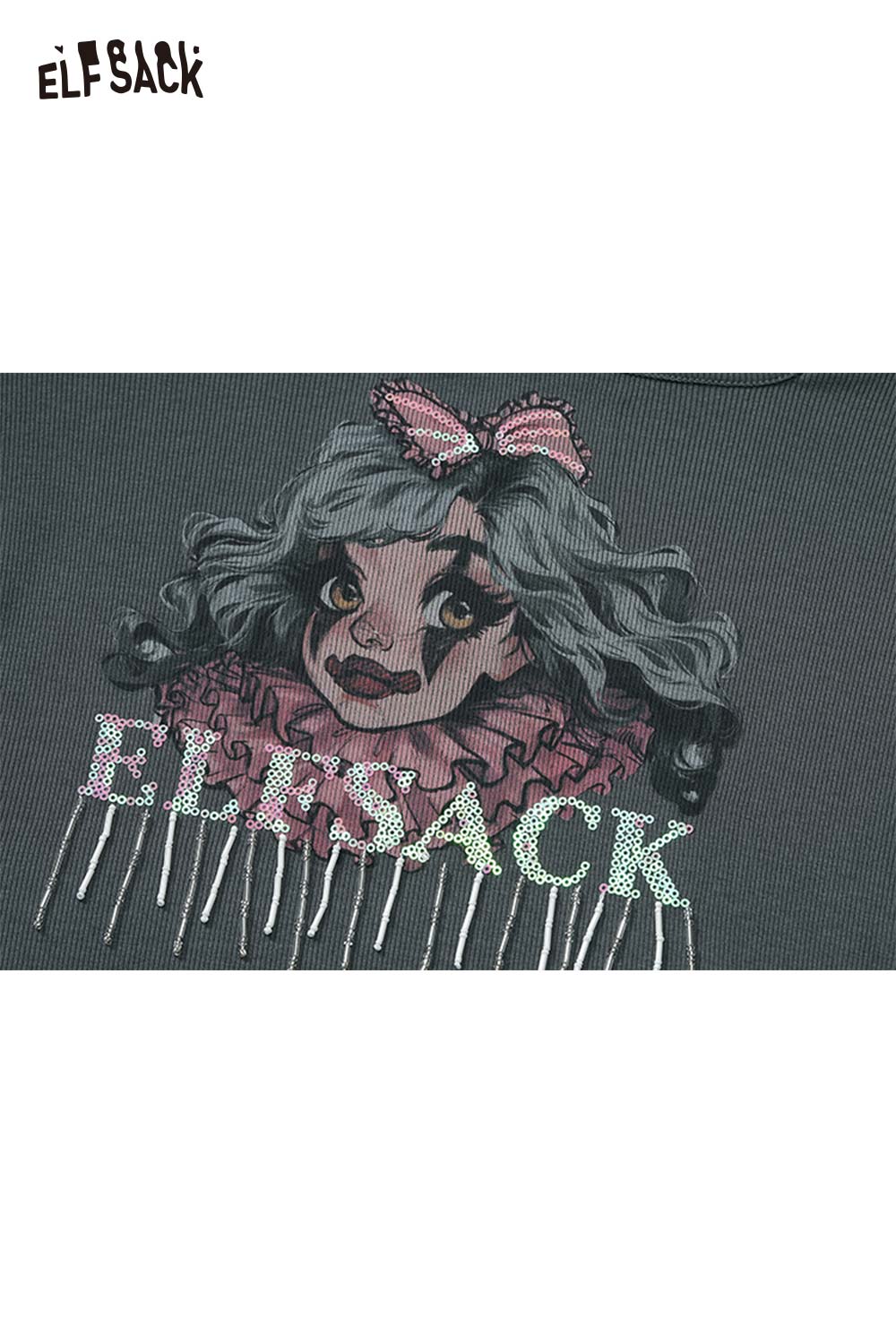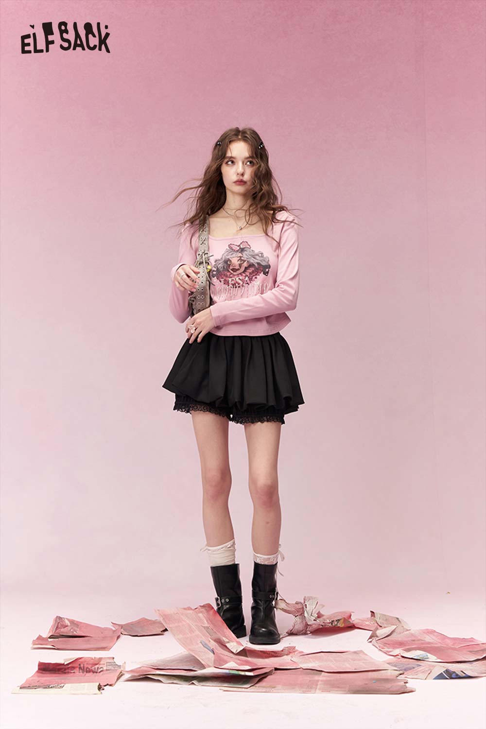 クールなピエロガールプリントスクエアネックシャーリングロングスリーブTシャツ