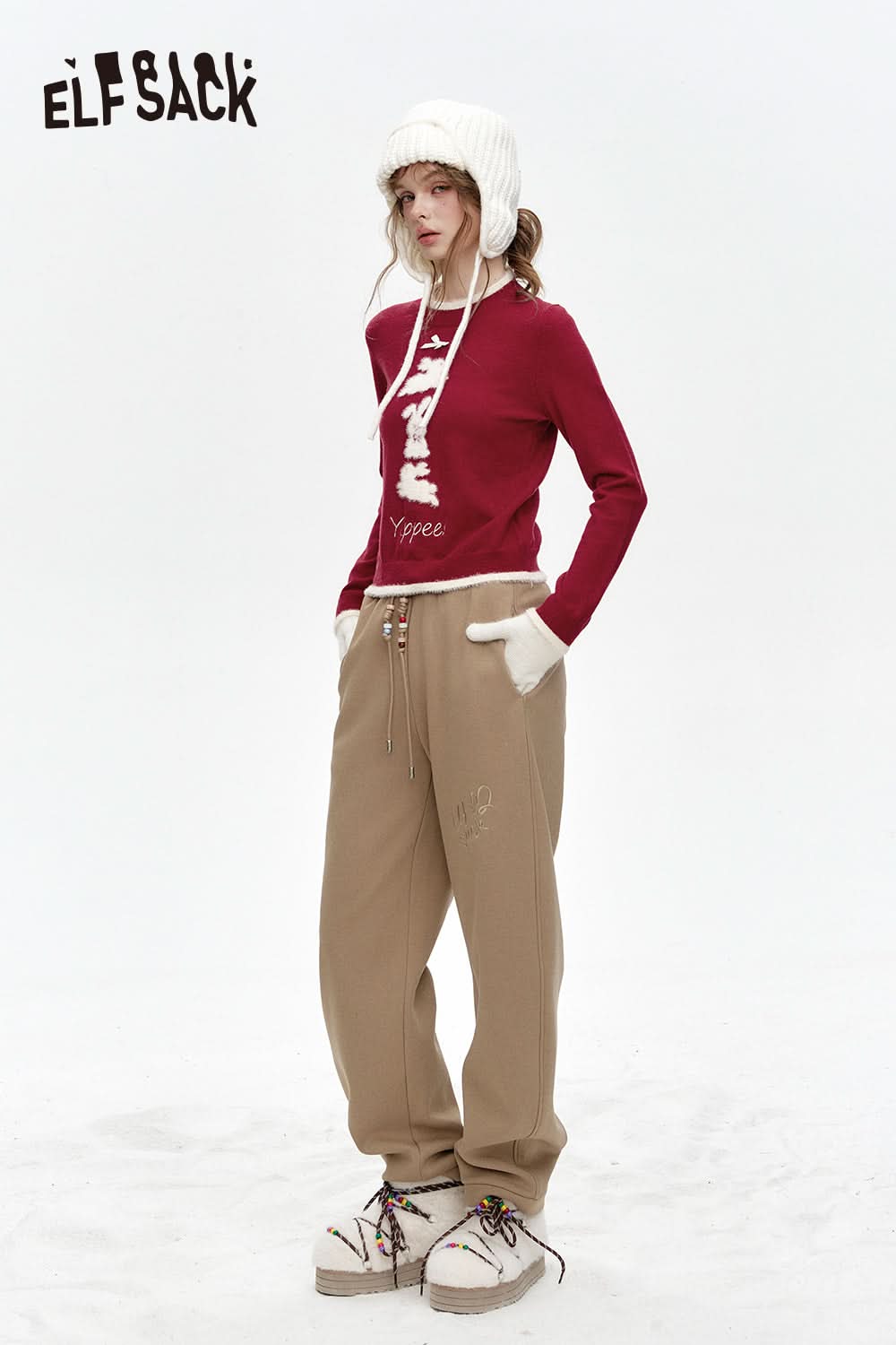 Crew neck faux plush bunny print short knitted pullover