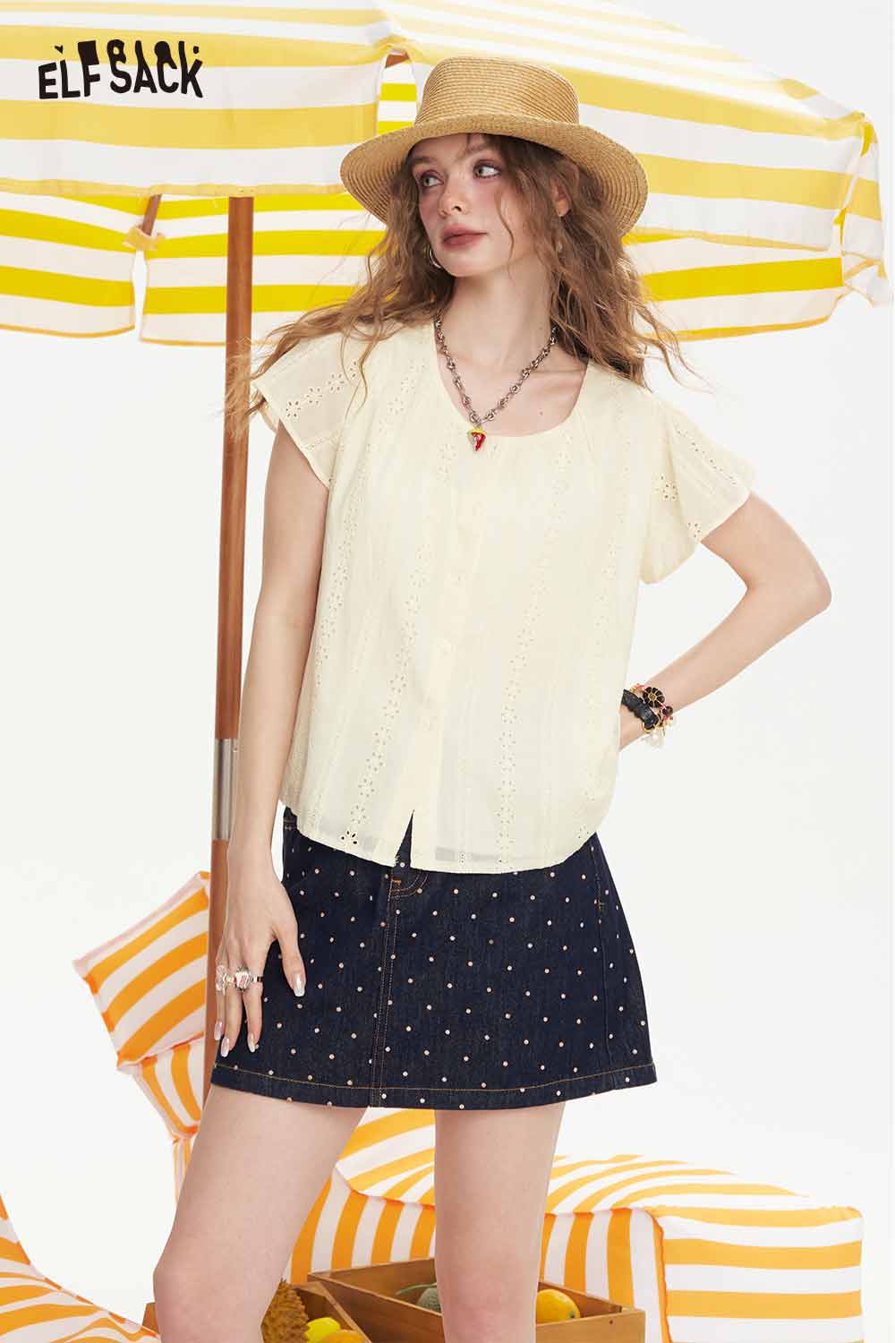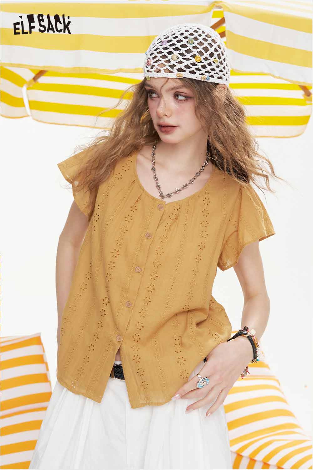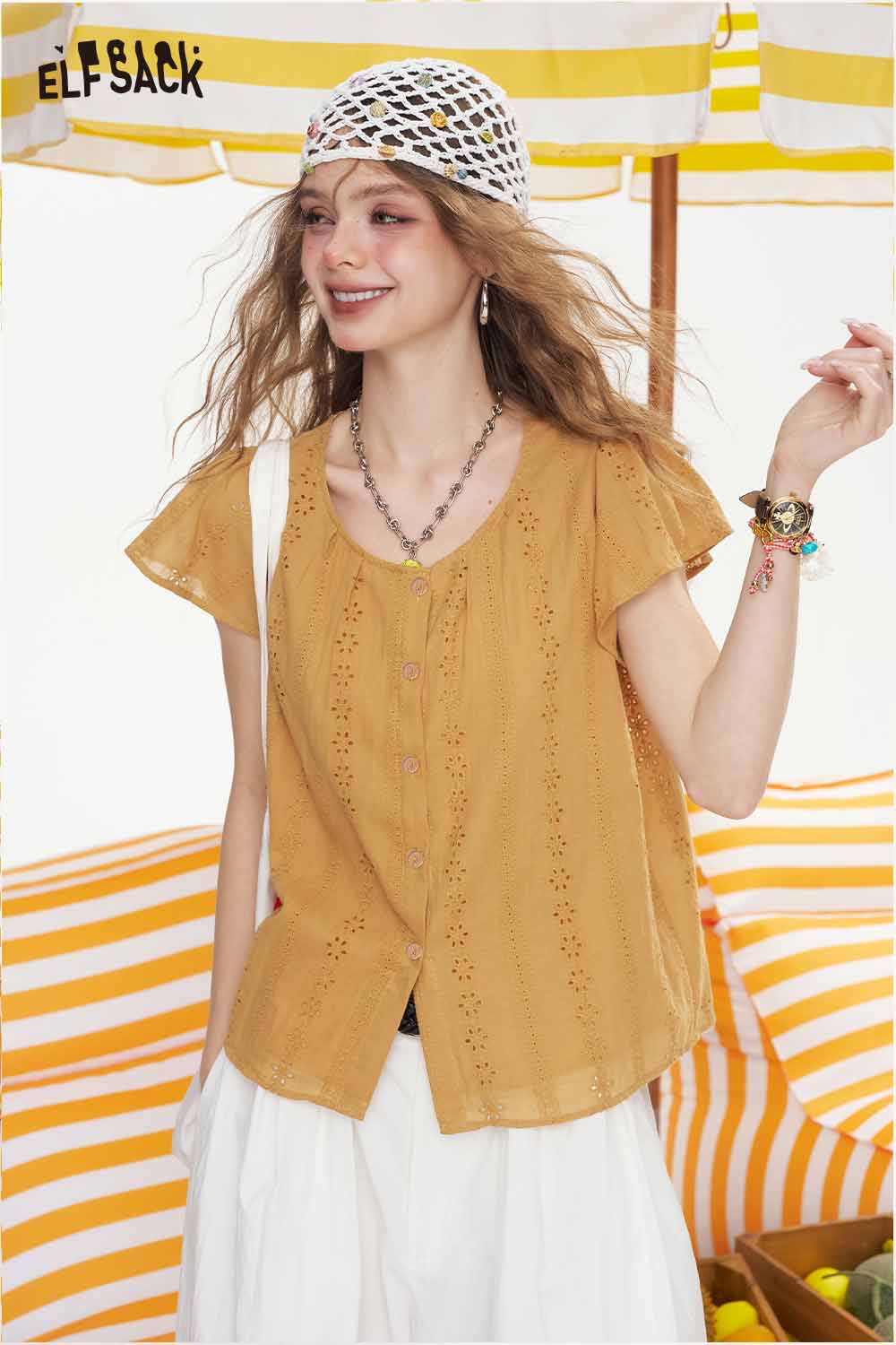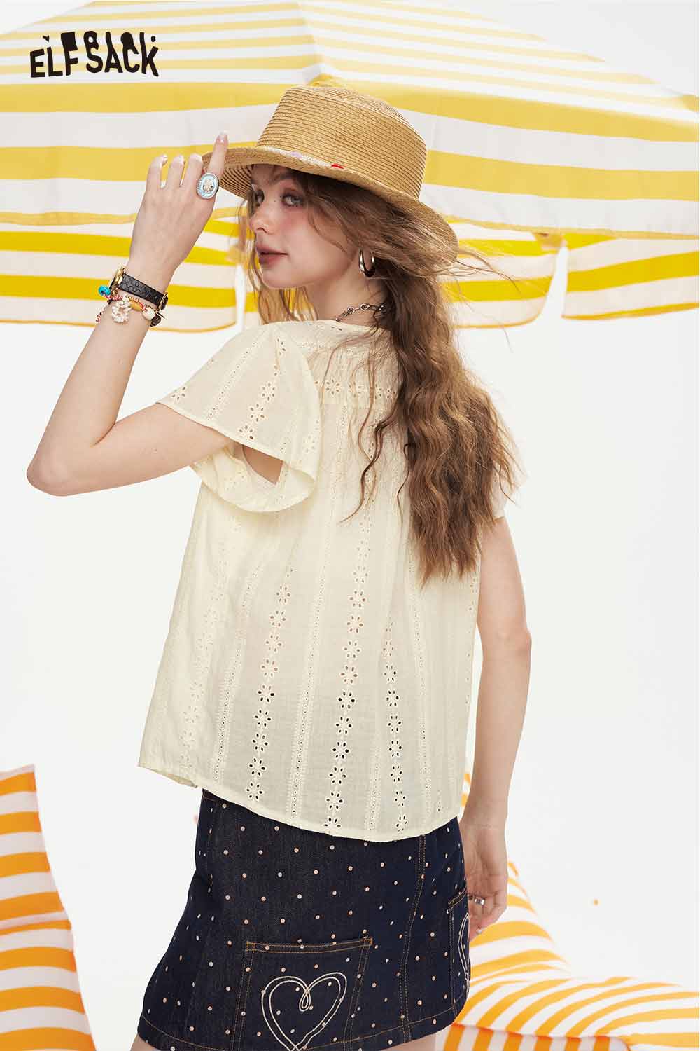 Loose Solid Crochet Cutout Flutter Sleeve Blouse