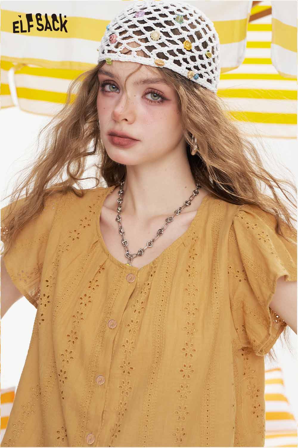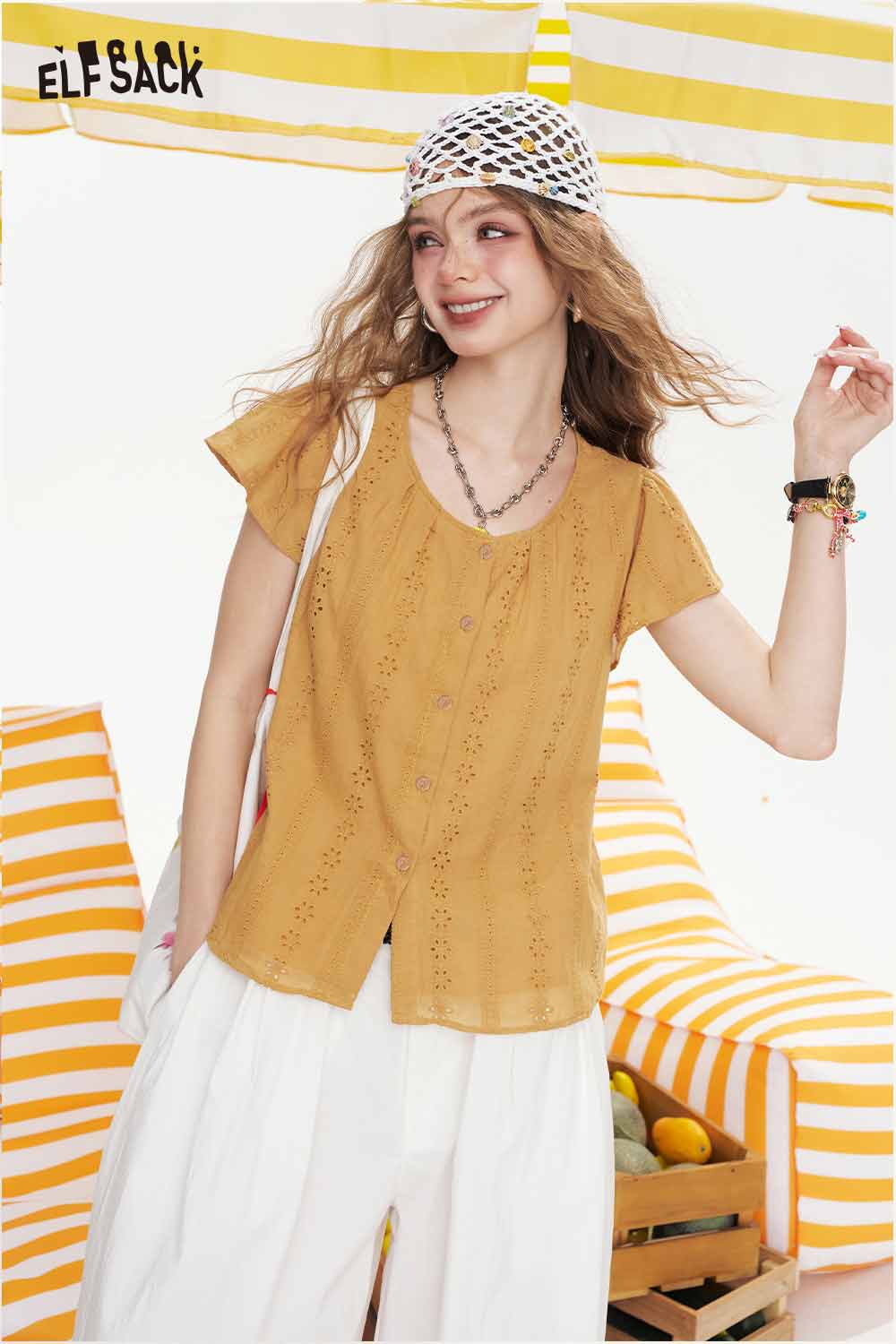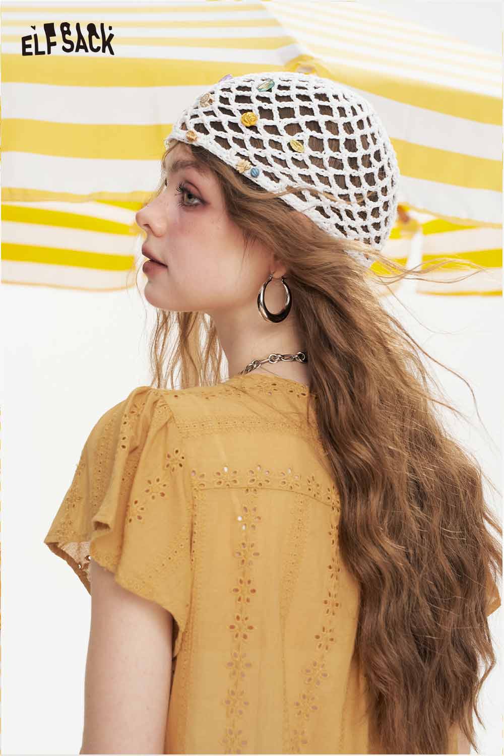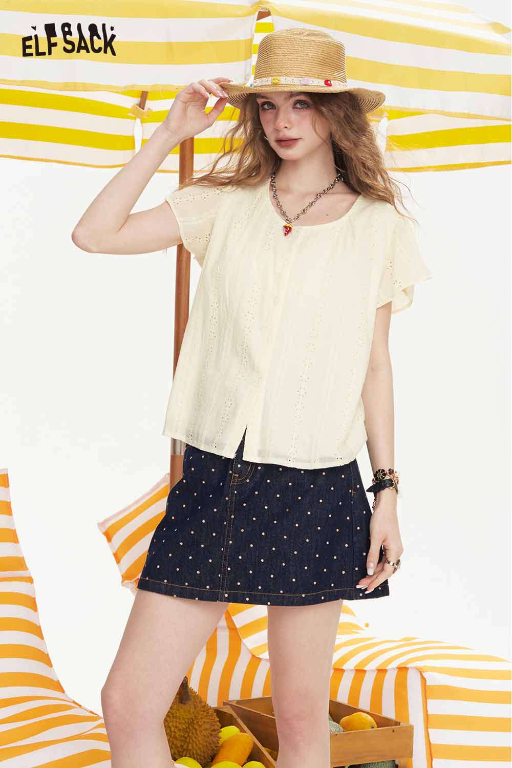 Loose Solid Crochet Cutout Flutter Sleeve Blouse