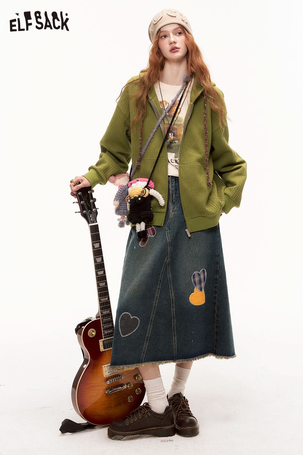 Heart Frayed American Denim Skirt Splash Ink Design Long Skirt