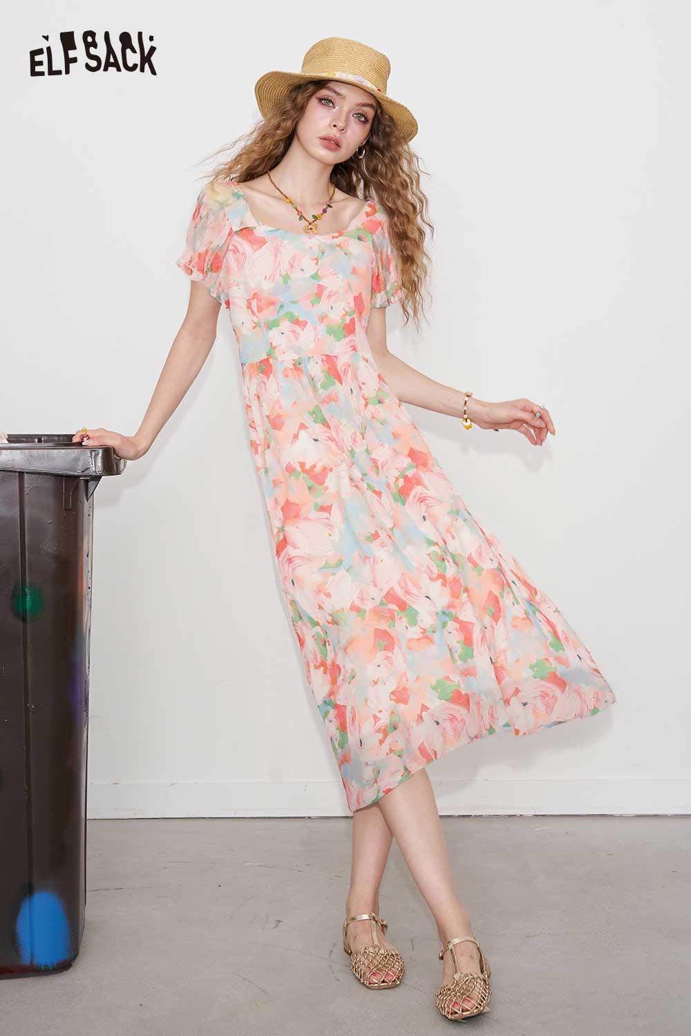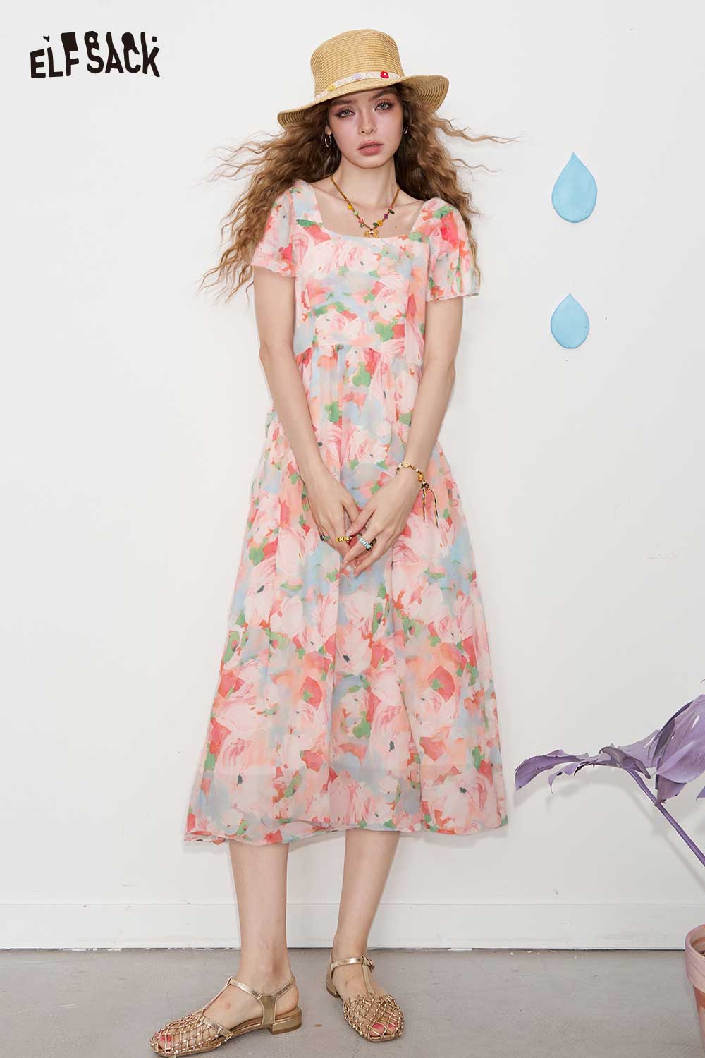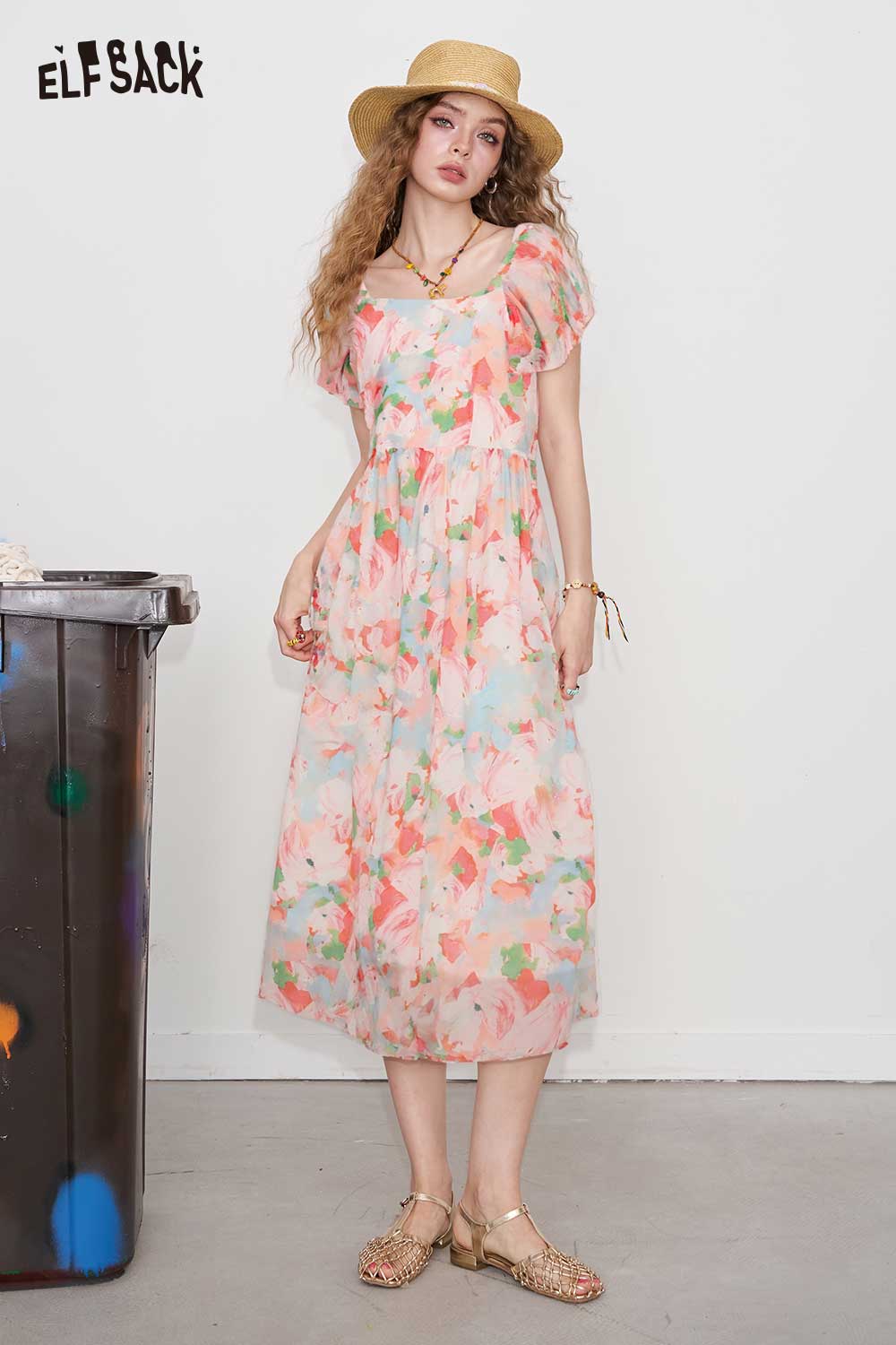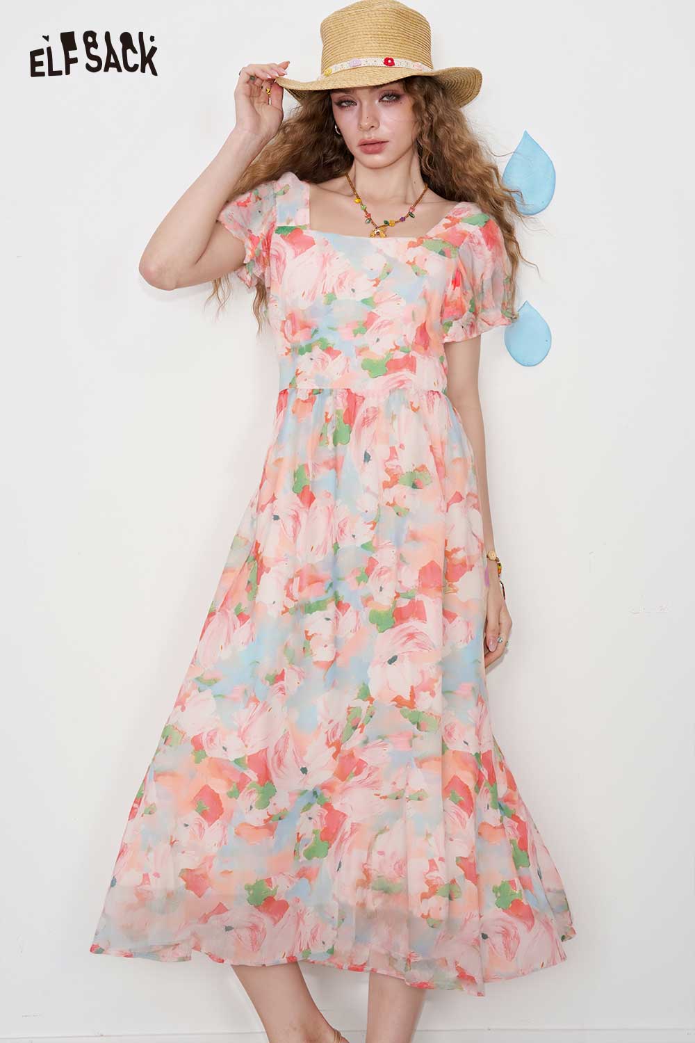 French Ruffle Trim Short Sleeve Square Neck Floral Print Dress