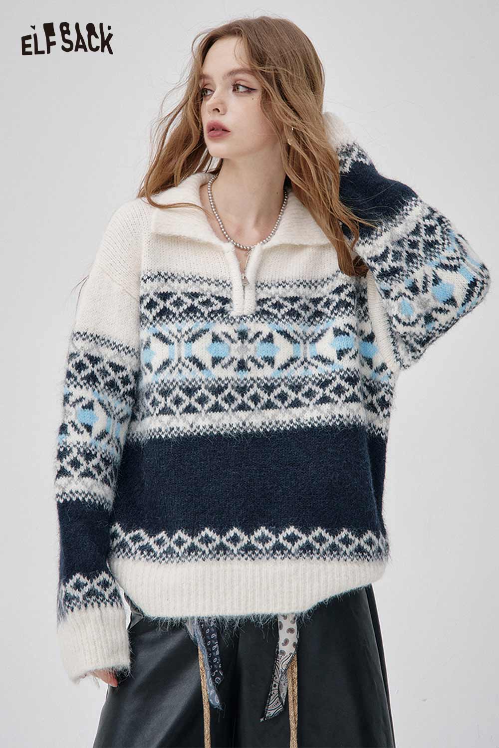 Soft Knit Half Zip Fair Isle Lapel Collar Sweater