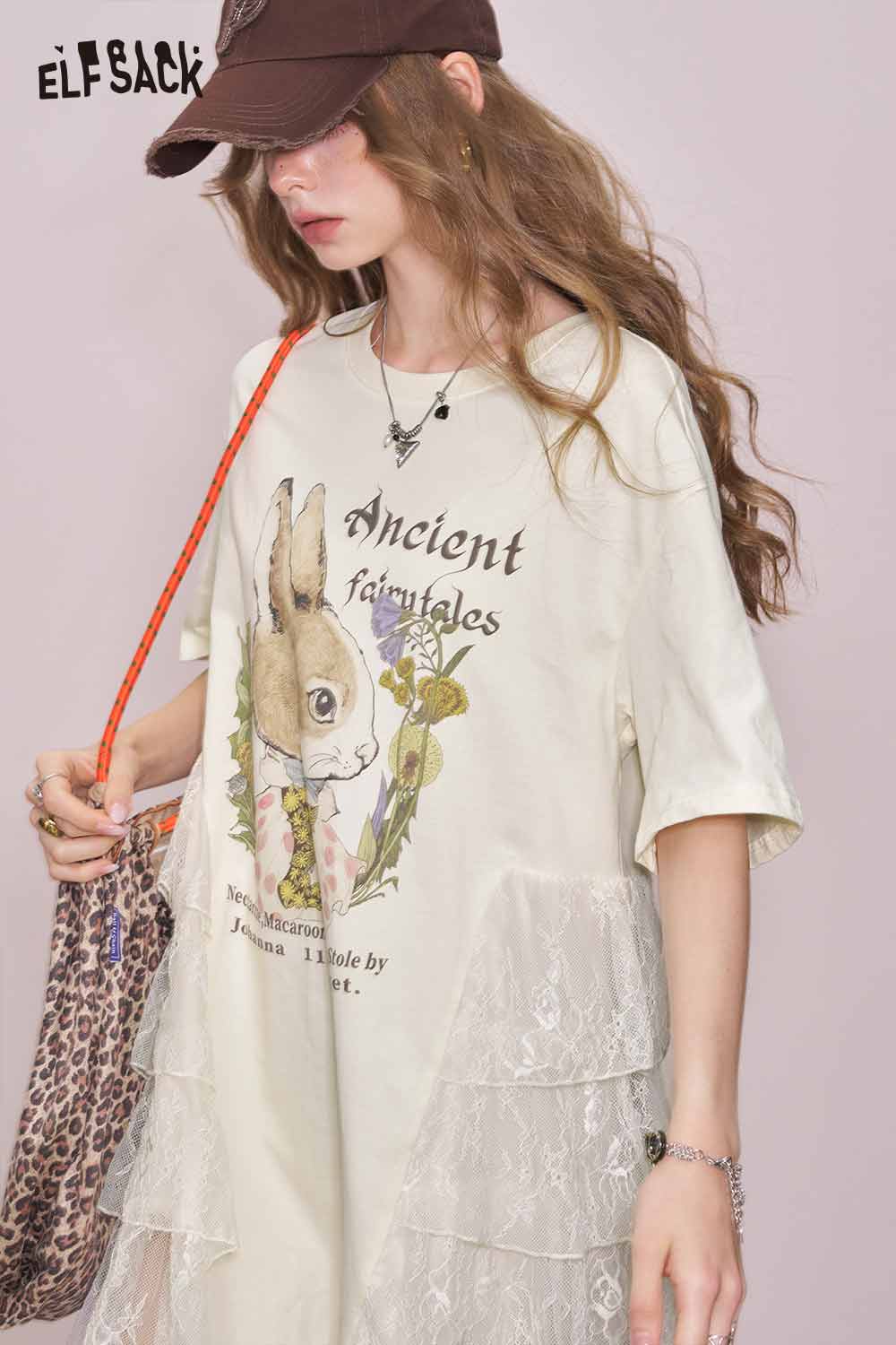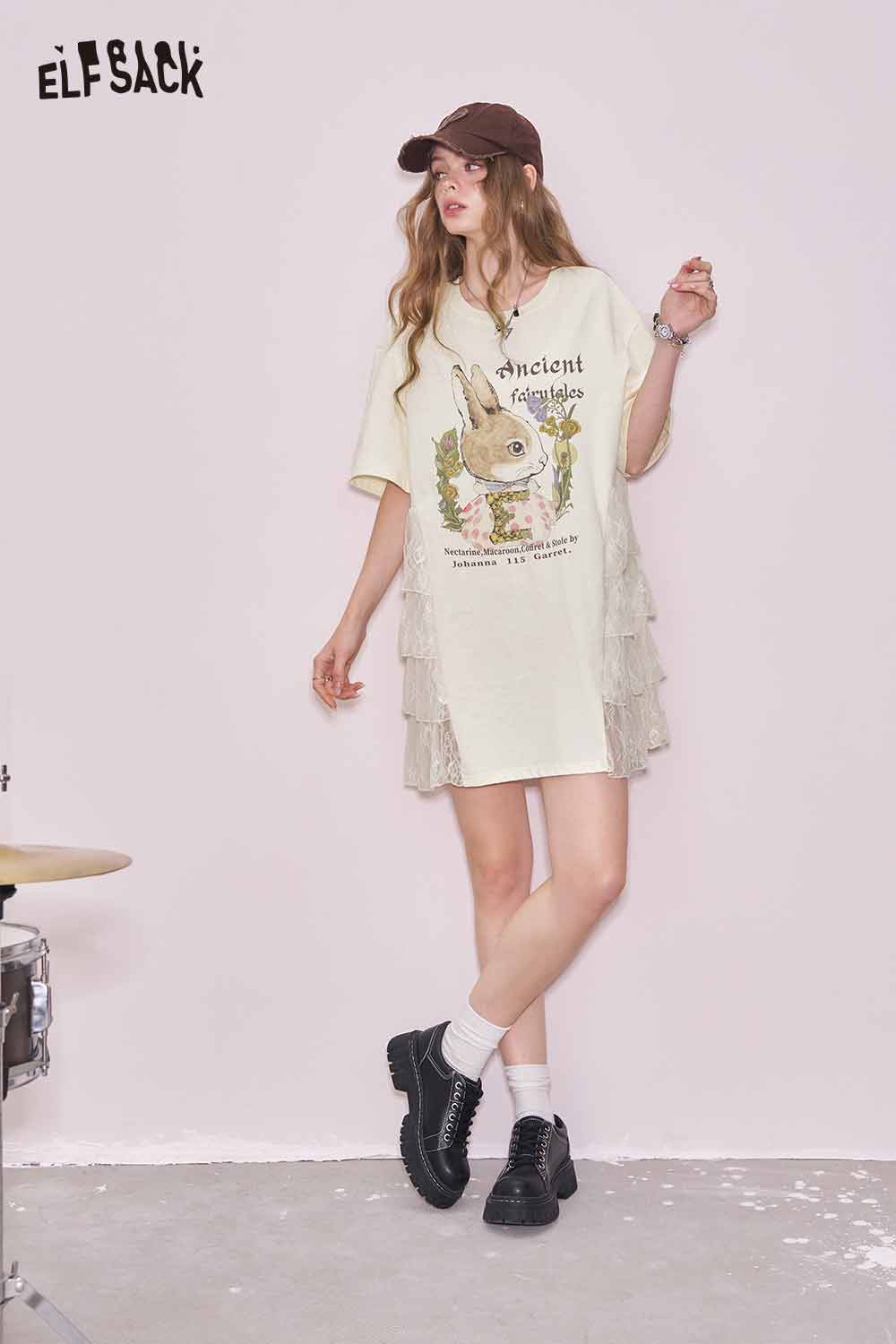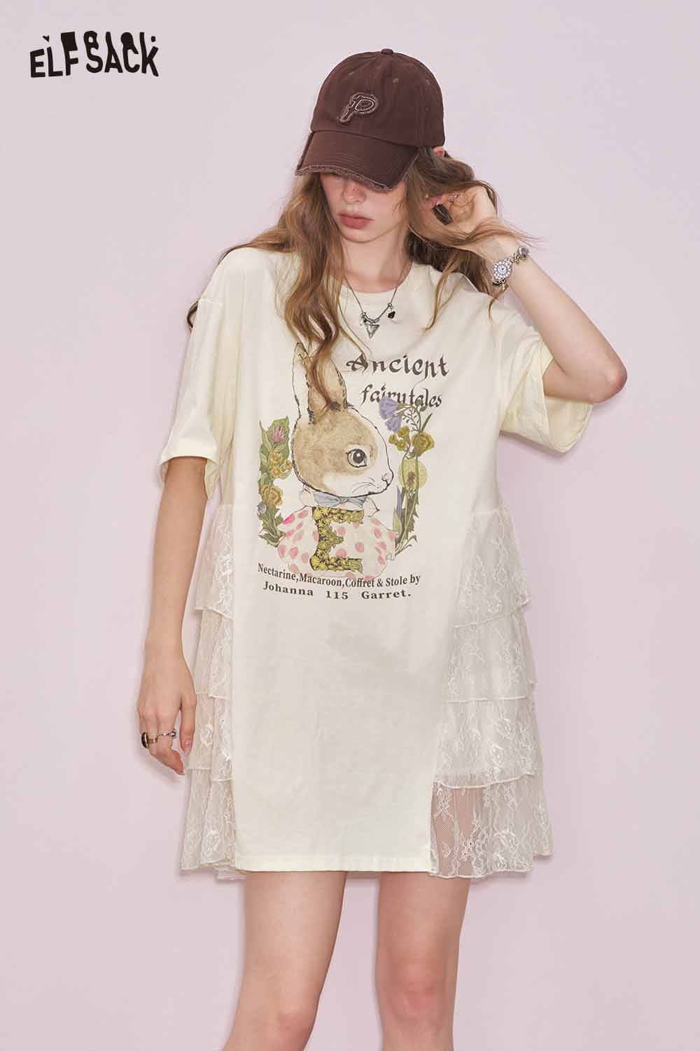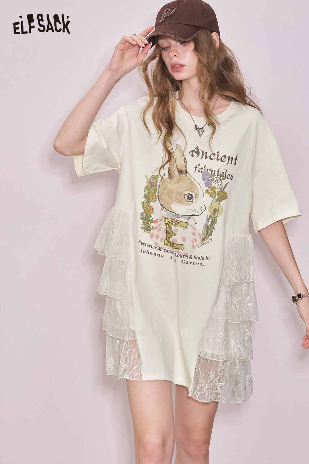 Vintage Bunny Print Dress with Lace Ruffle Detail