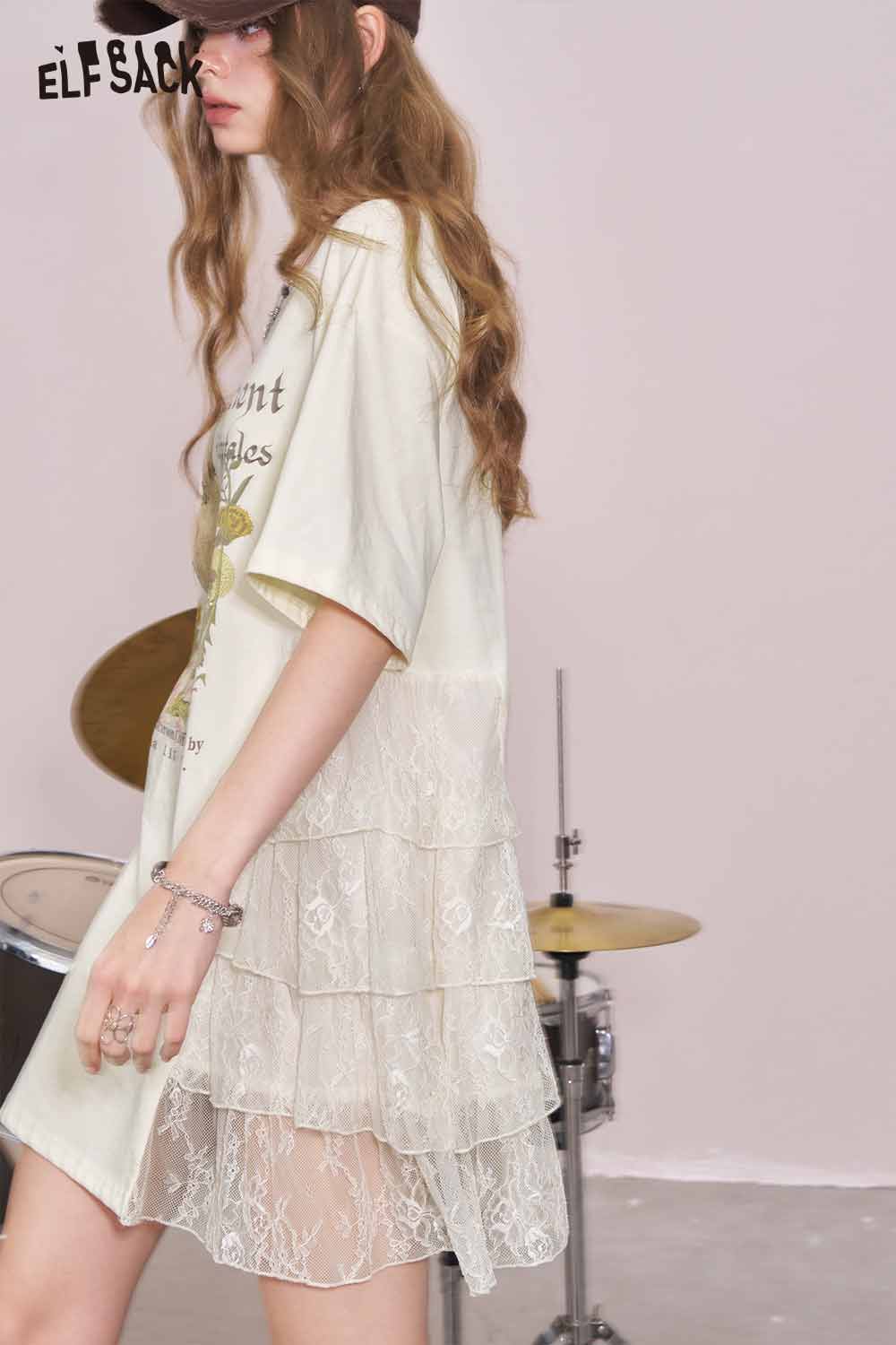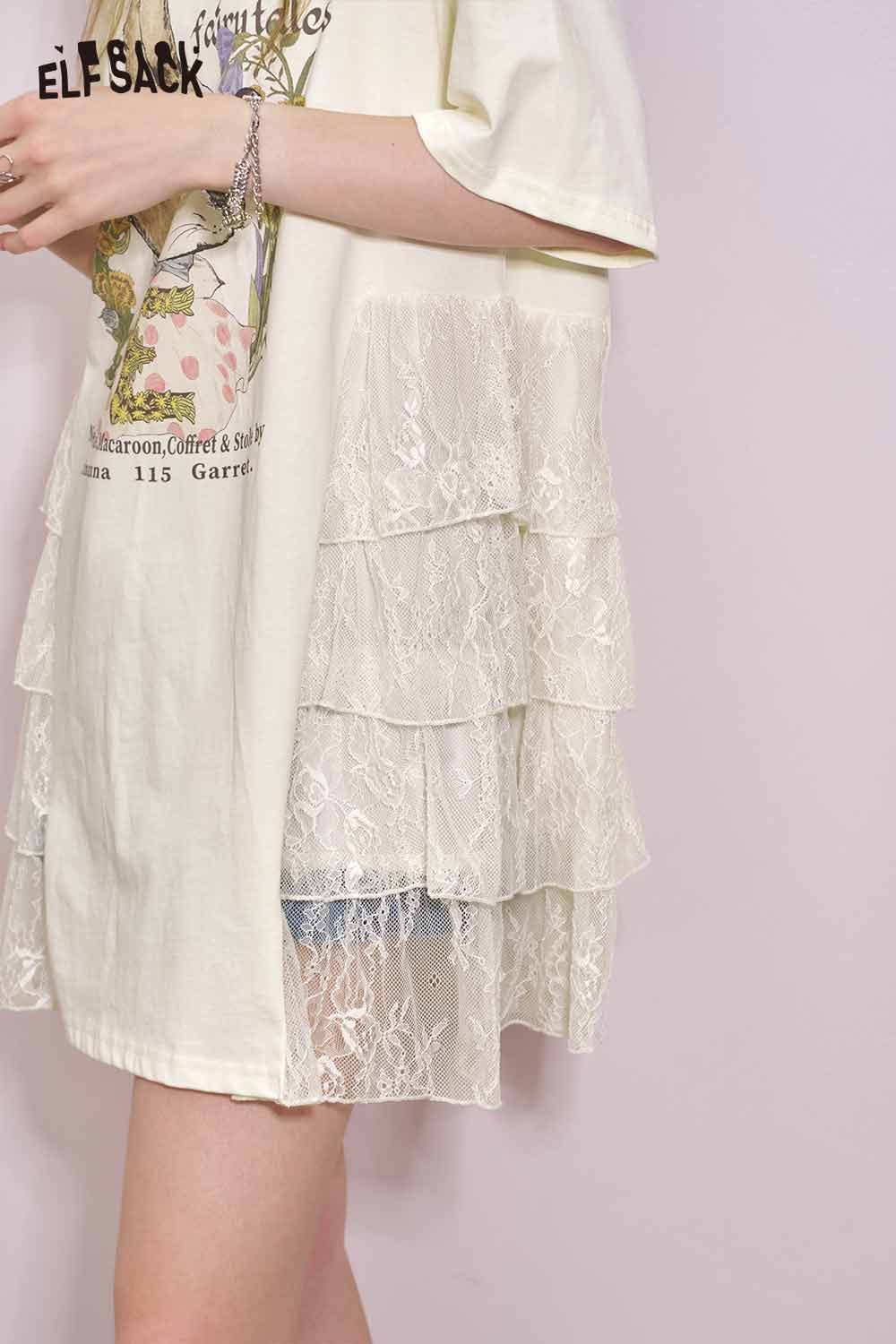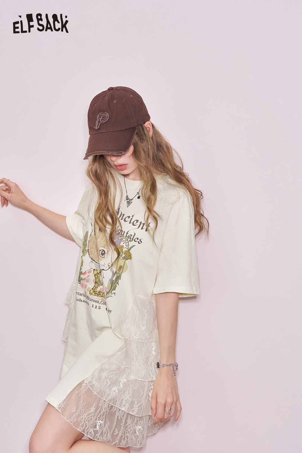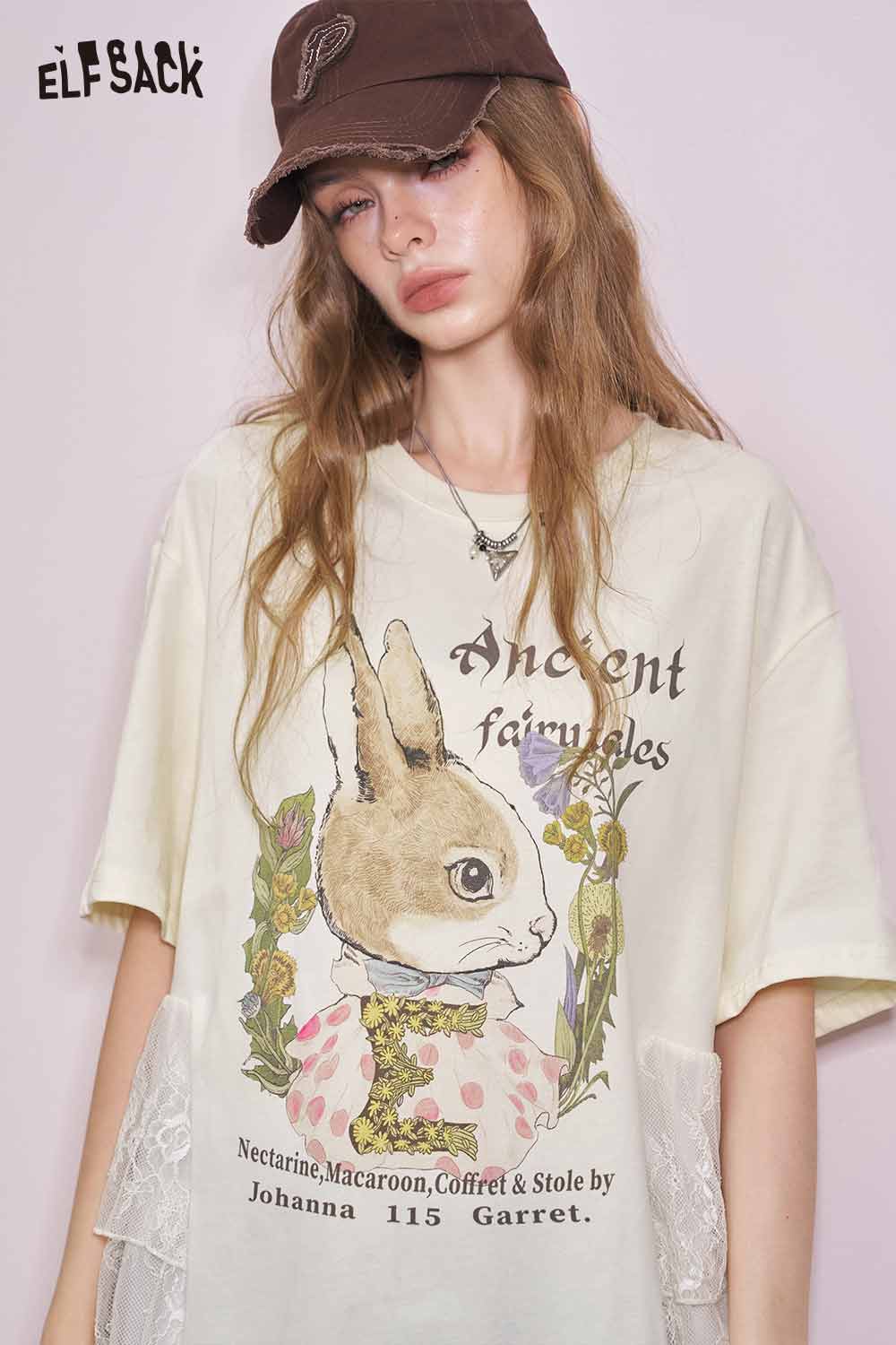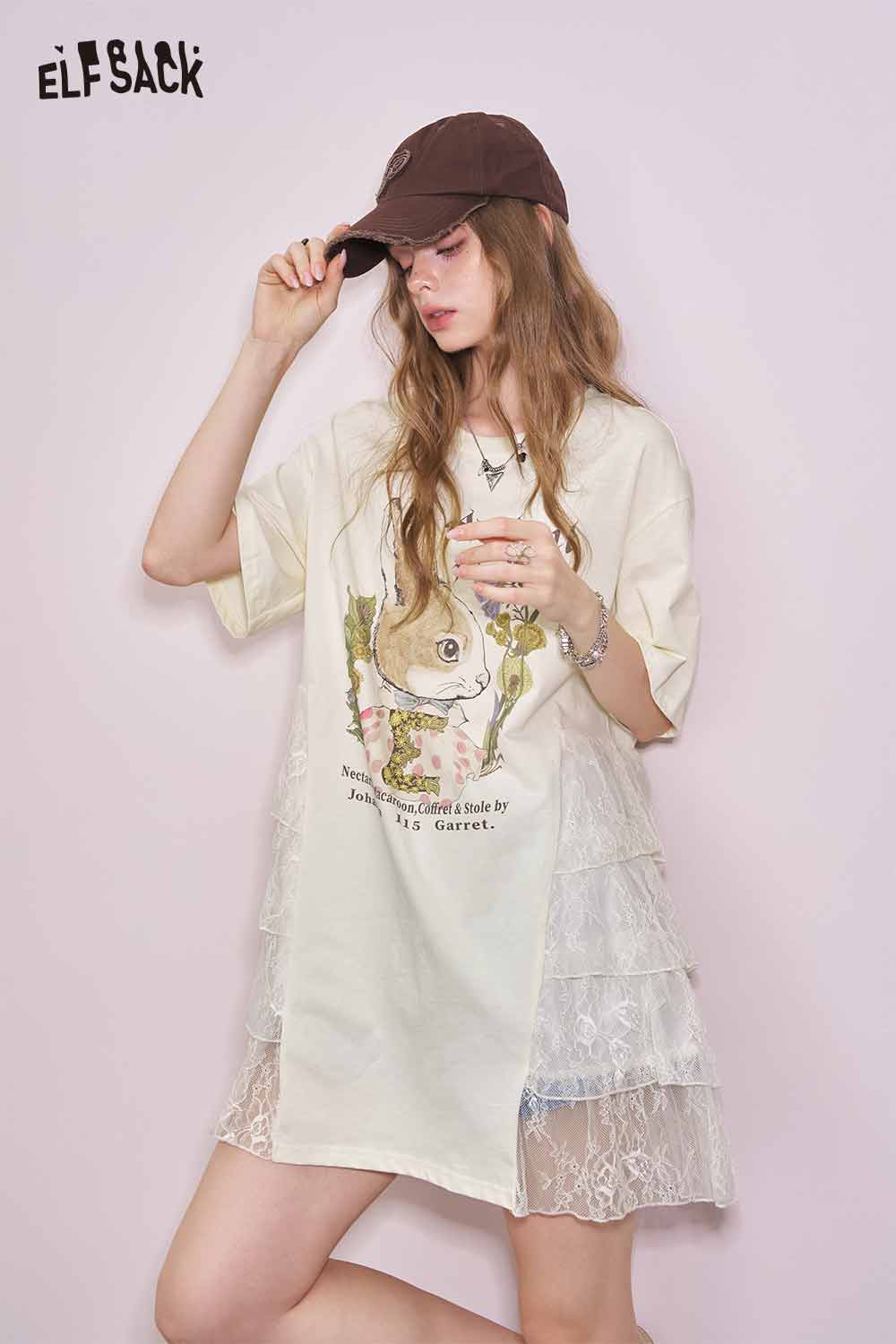 Vintage Bunny Print Dress with Lace Ruffle Detail