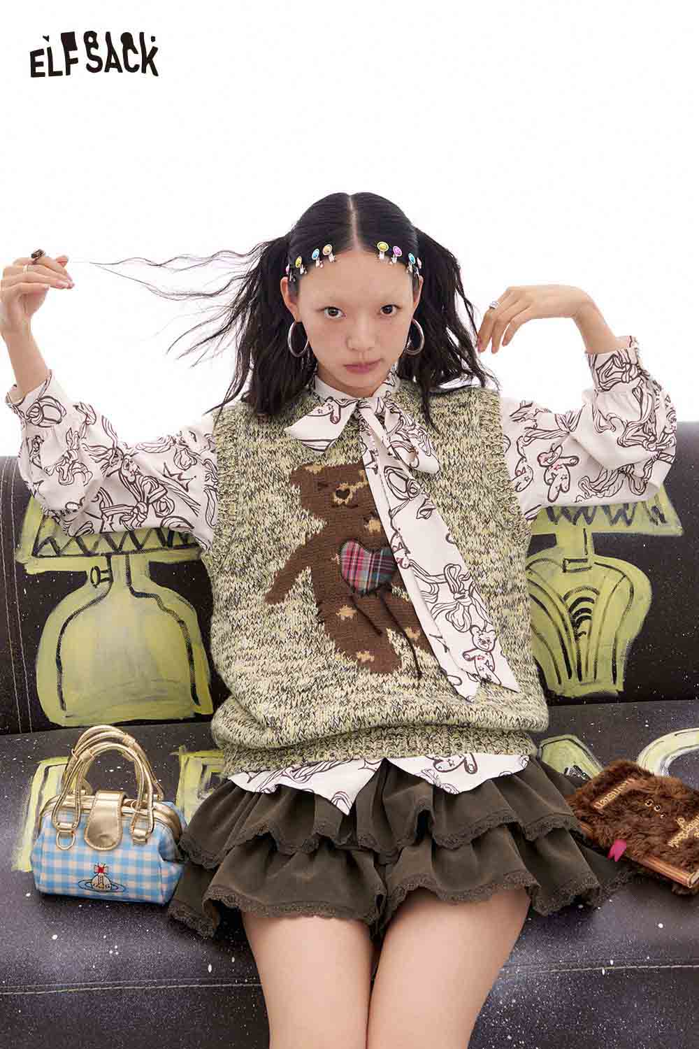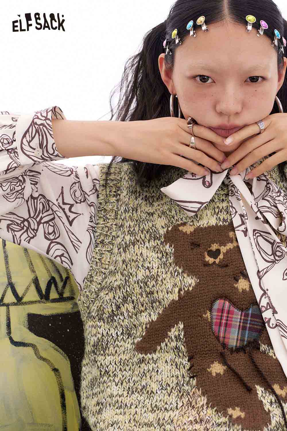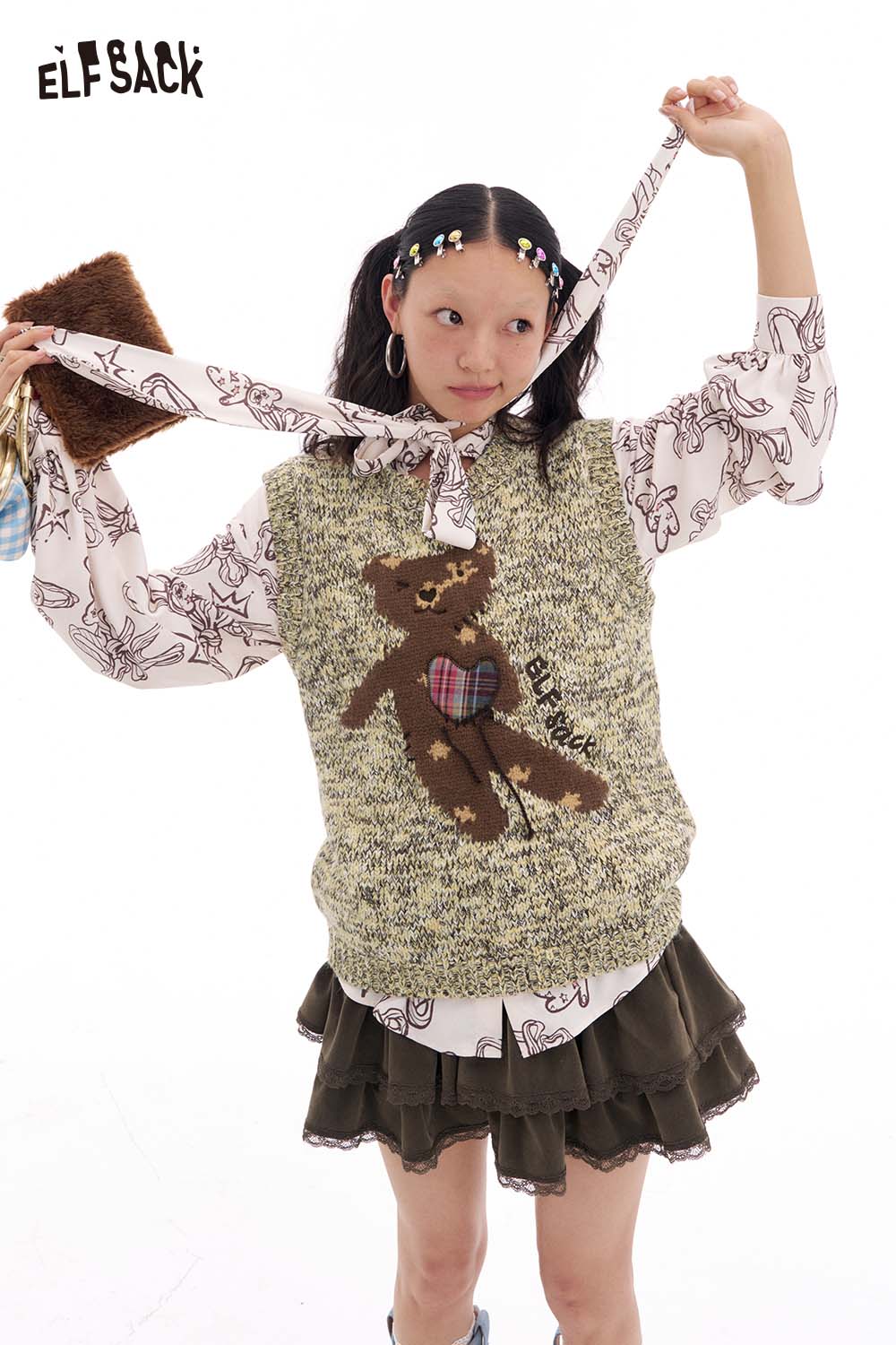 Vintage Jacquard Bear Embroidery Vest Early Spring Faux Cashmere