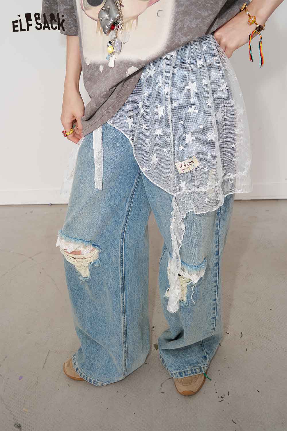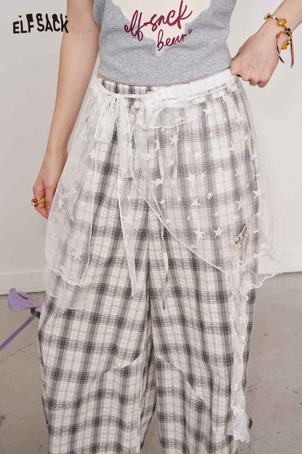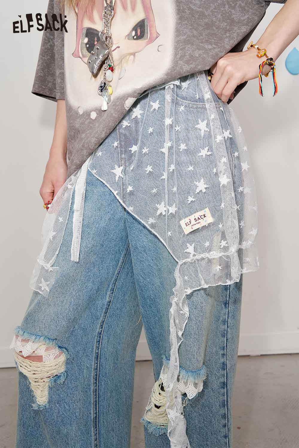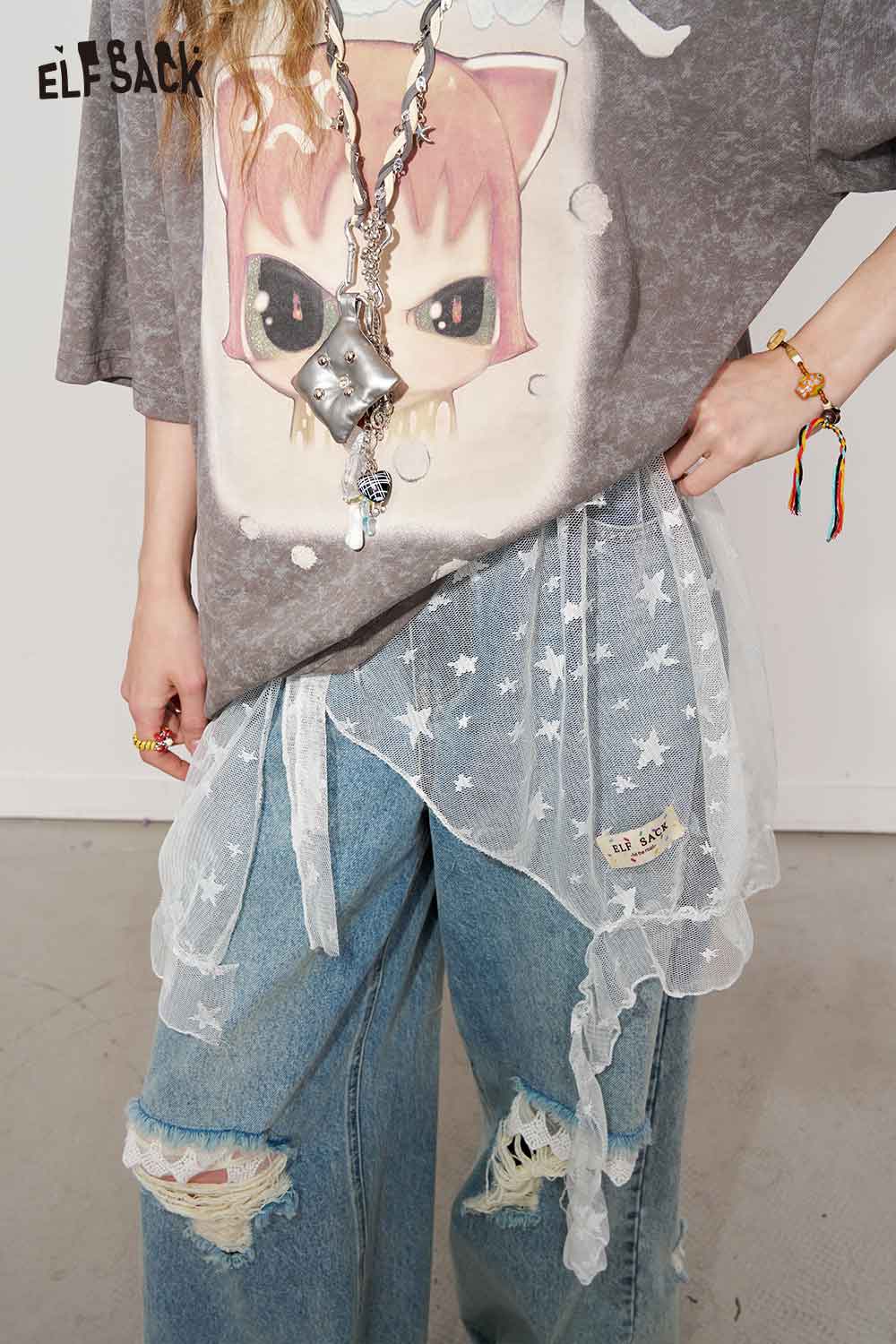 Artisan Lace Trim Layered Slip Korean Indie Style Star Embroidery Tulle kirt ver Pants