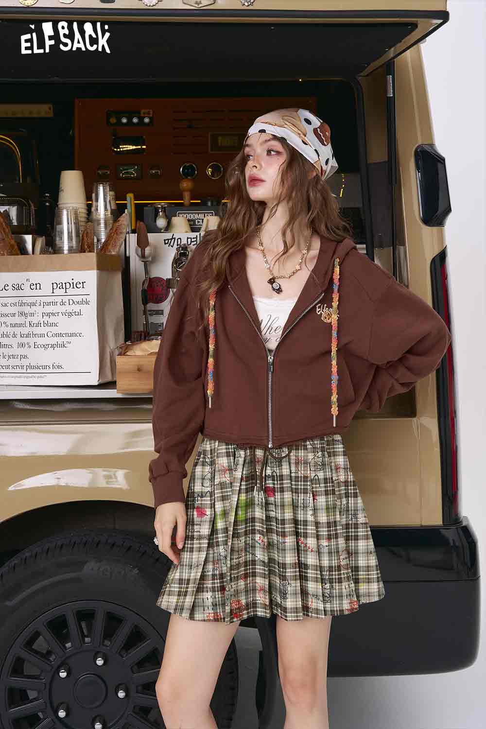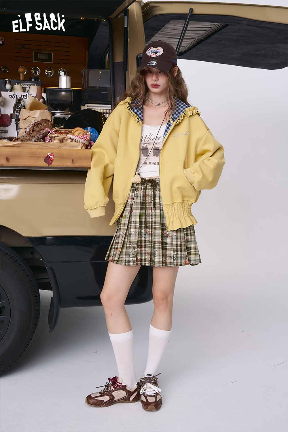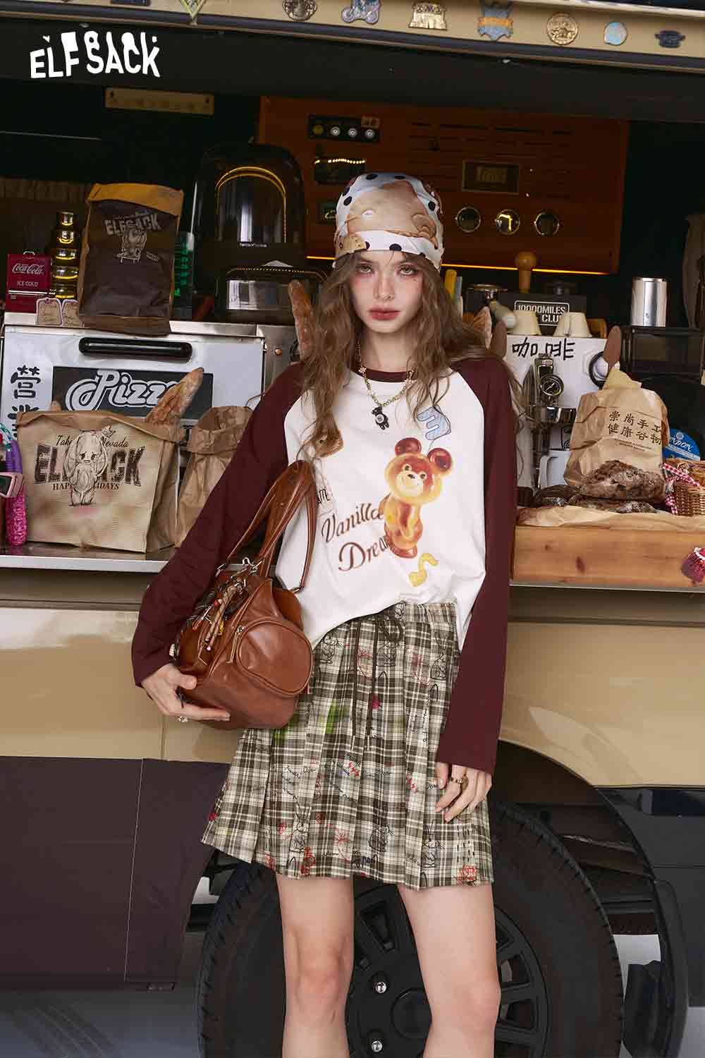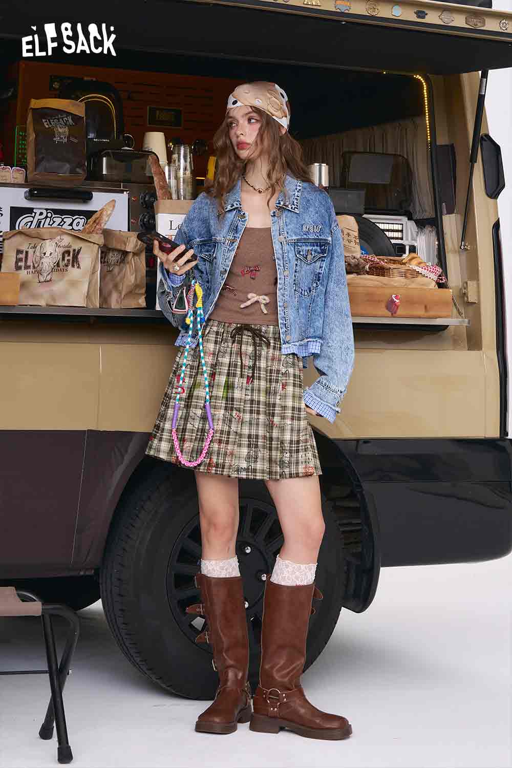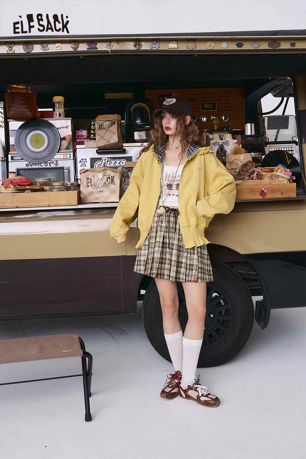 College-Style Slimming Plaid Mini Skirt with Cartoon Print
