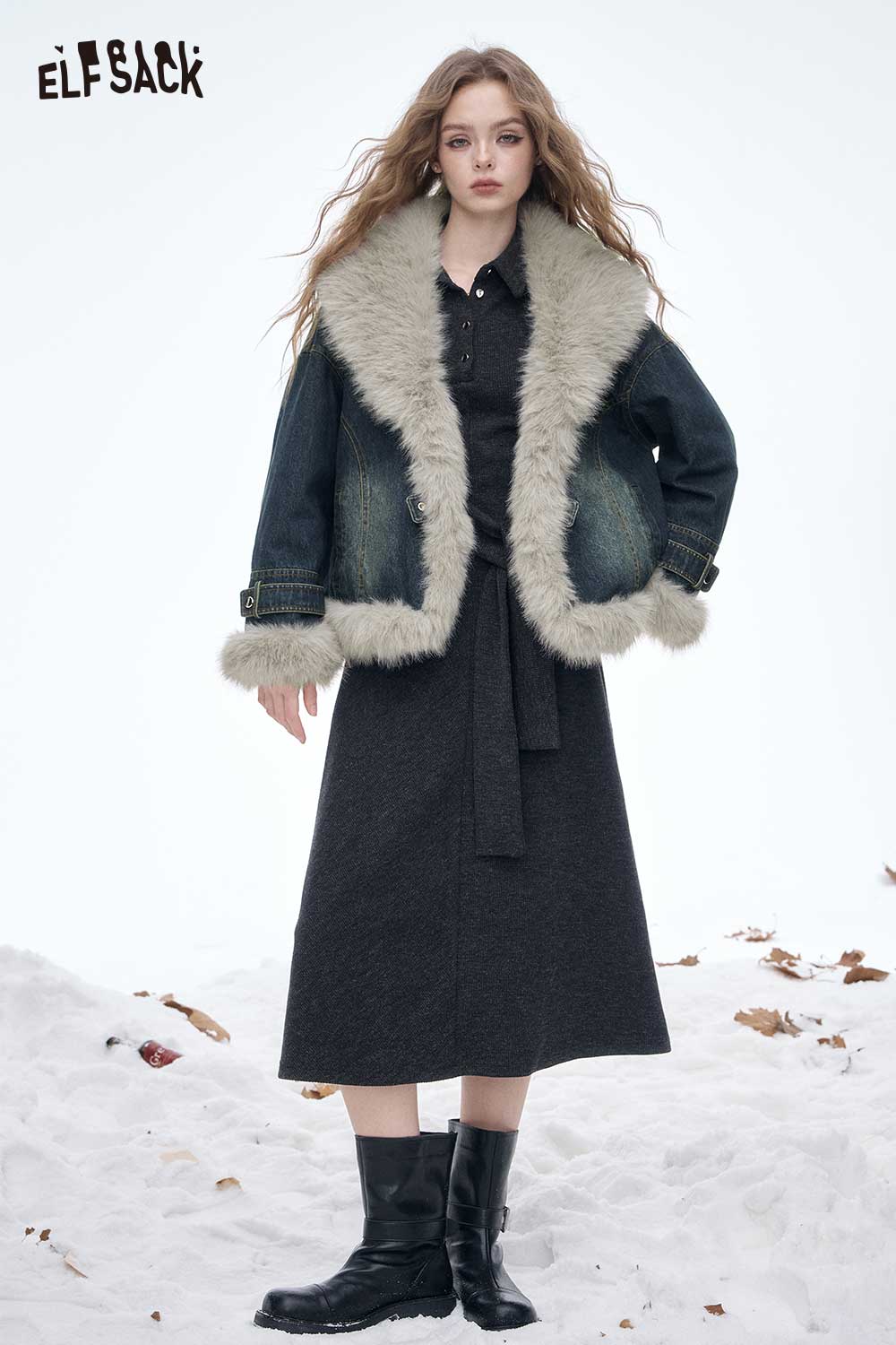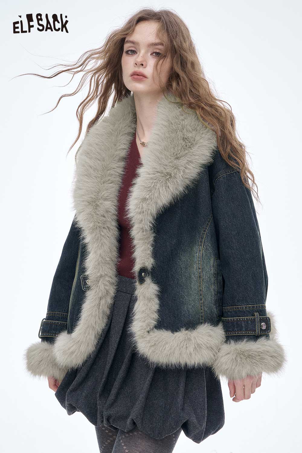 Soft Premium Plush Trim Plush Lapel Denim Color Jacket