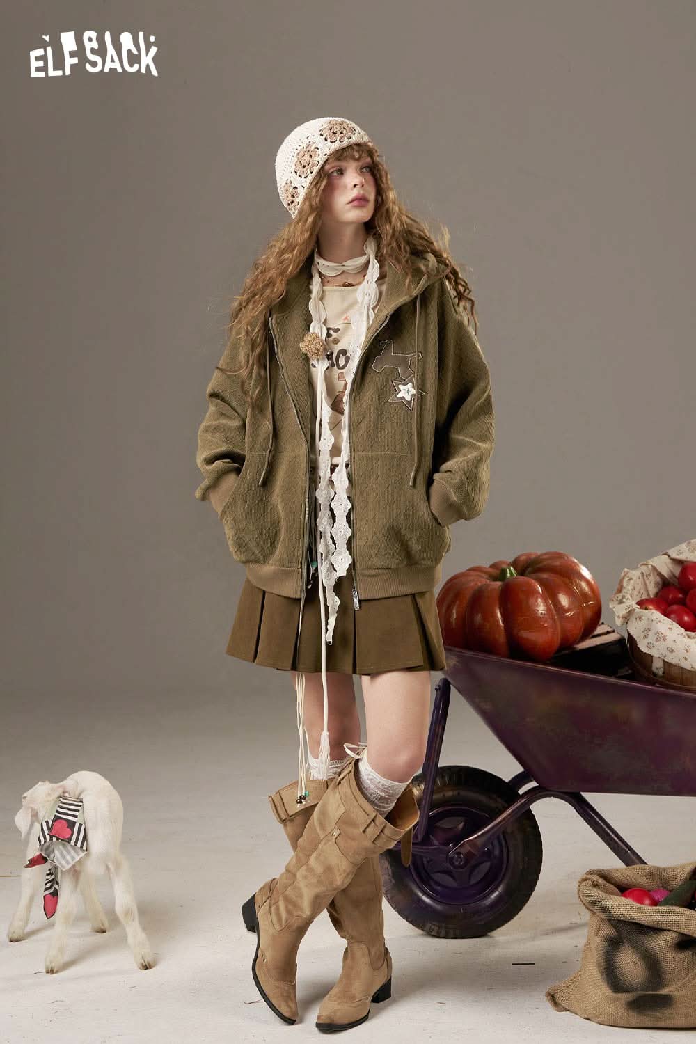 ELFSACK soft star hooded jacket for women paired with a skirt and stylish boots in a rustic setting