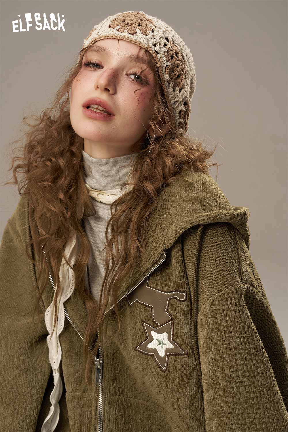 ELFSACK soft star hooded jacket for women in olive green, styled with a casual outfit and vintage accessories