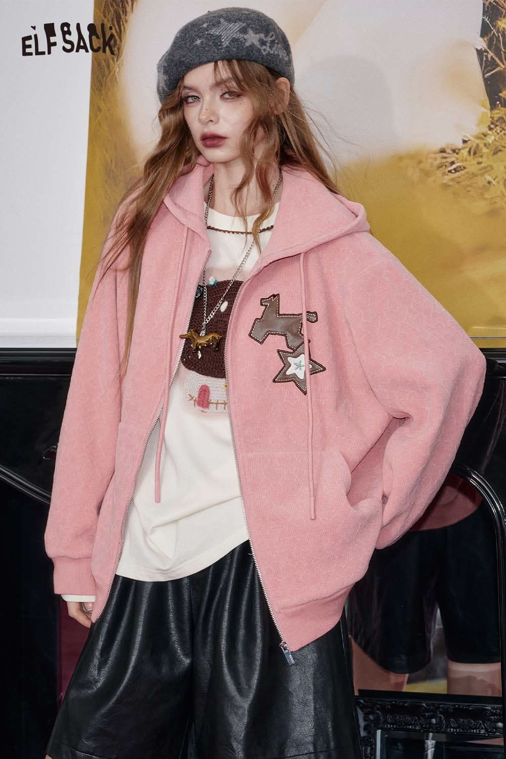 ELFSACK soft star hooded jacket for women in pink, styled with a casual outfit and a chic hat