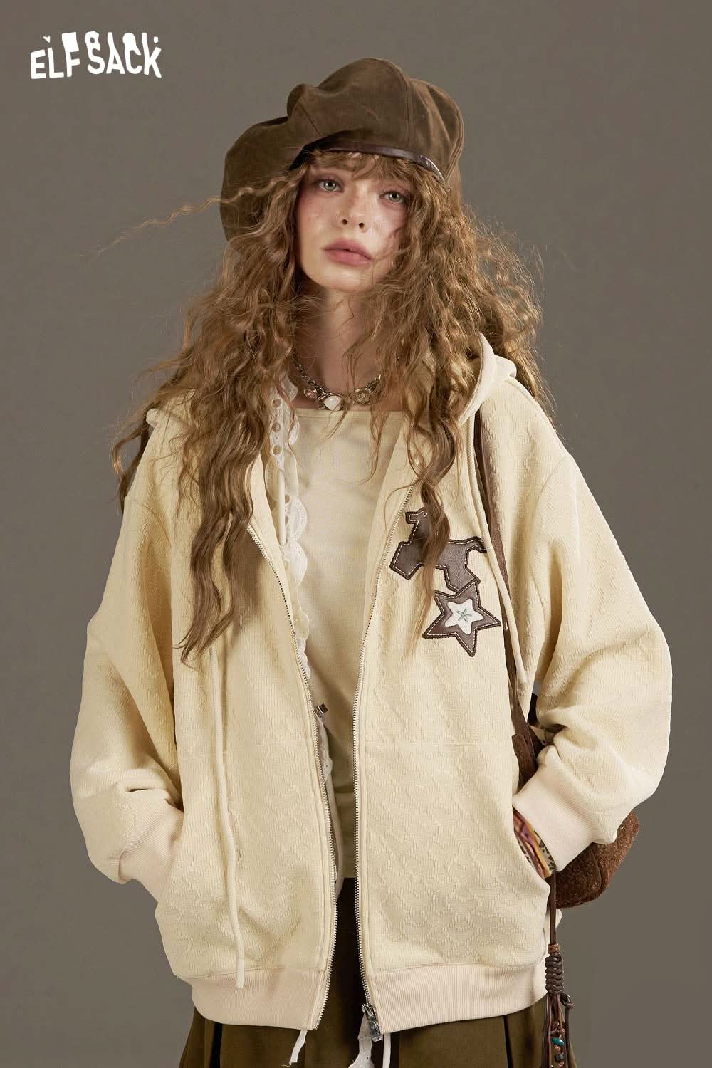 ELFSACK soft star hooded jacket for women in beige with a casual oversized fit and star design