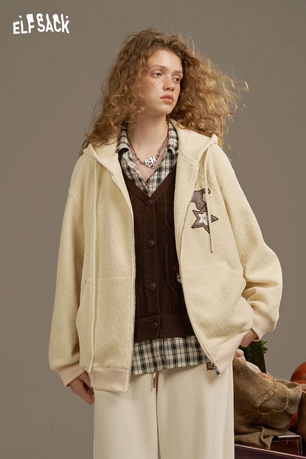 ELFSACK soft star hooded jacket for women styled with a brown vest and wide-leg pants