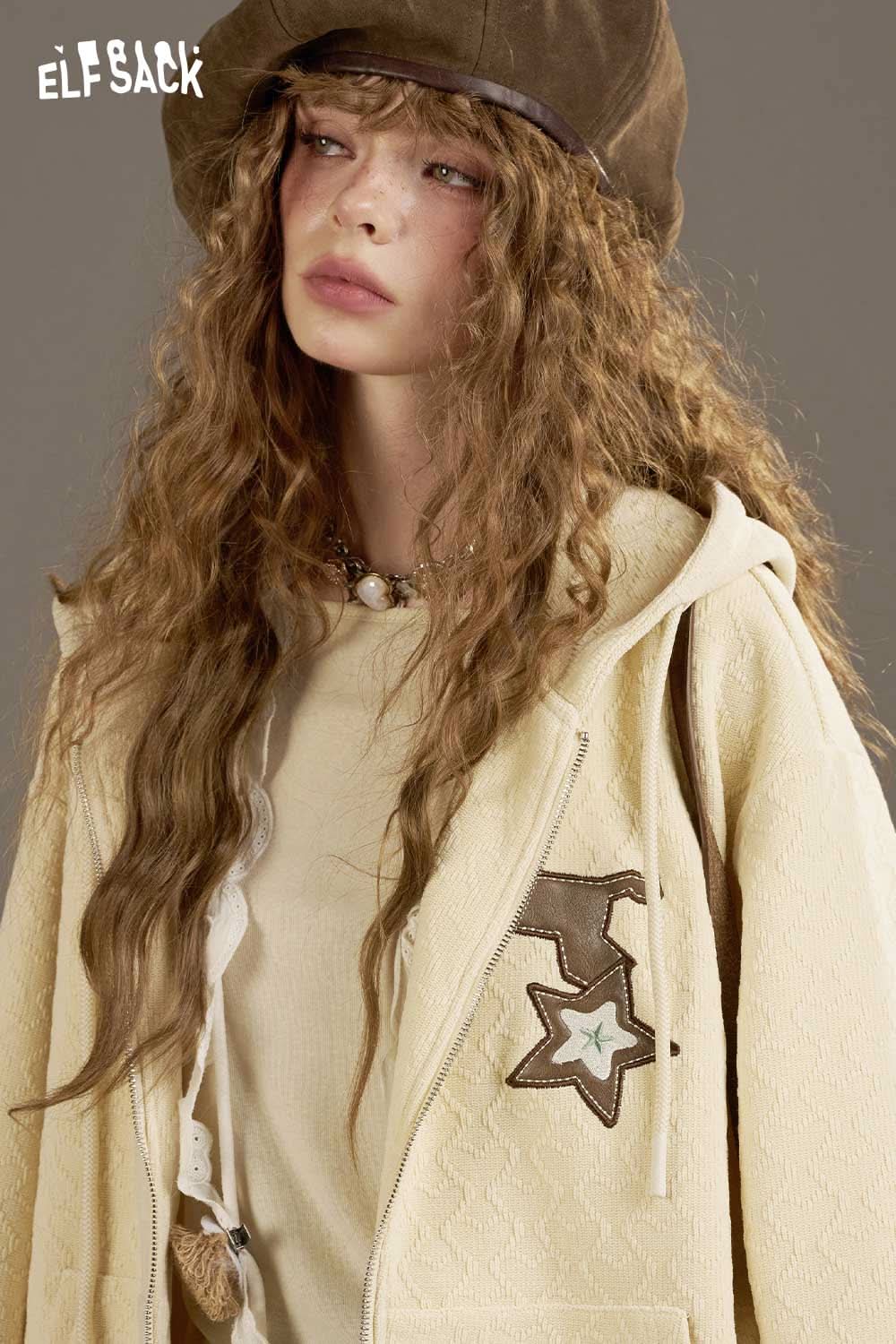 ELFSACK soft star hooded jacket for women in cream with star patch and cozy design