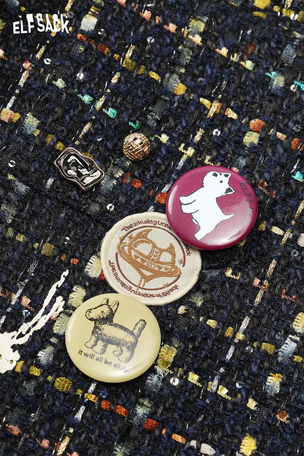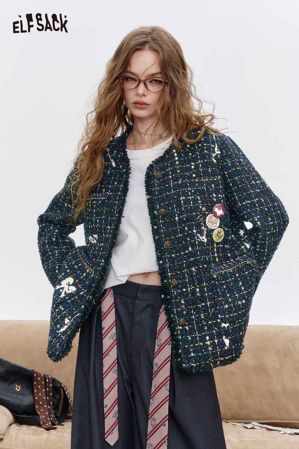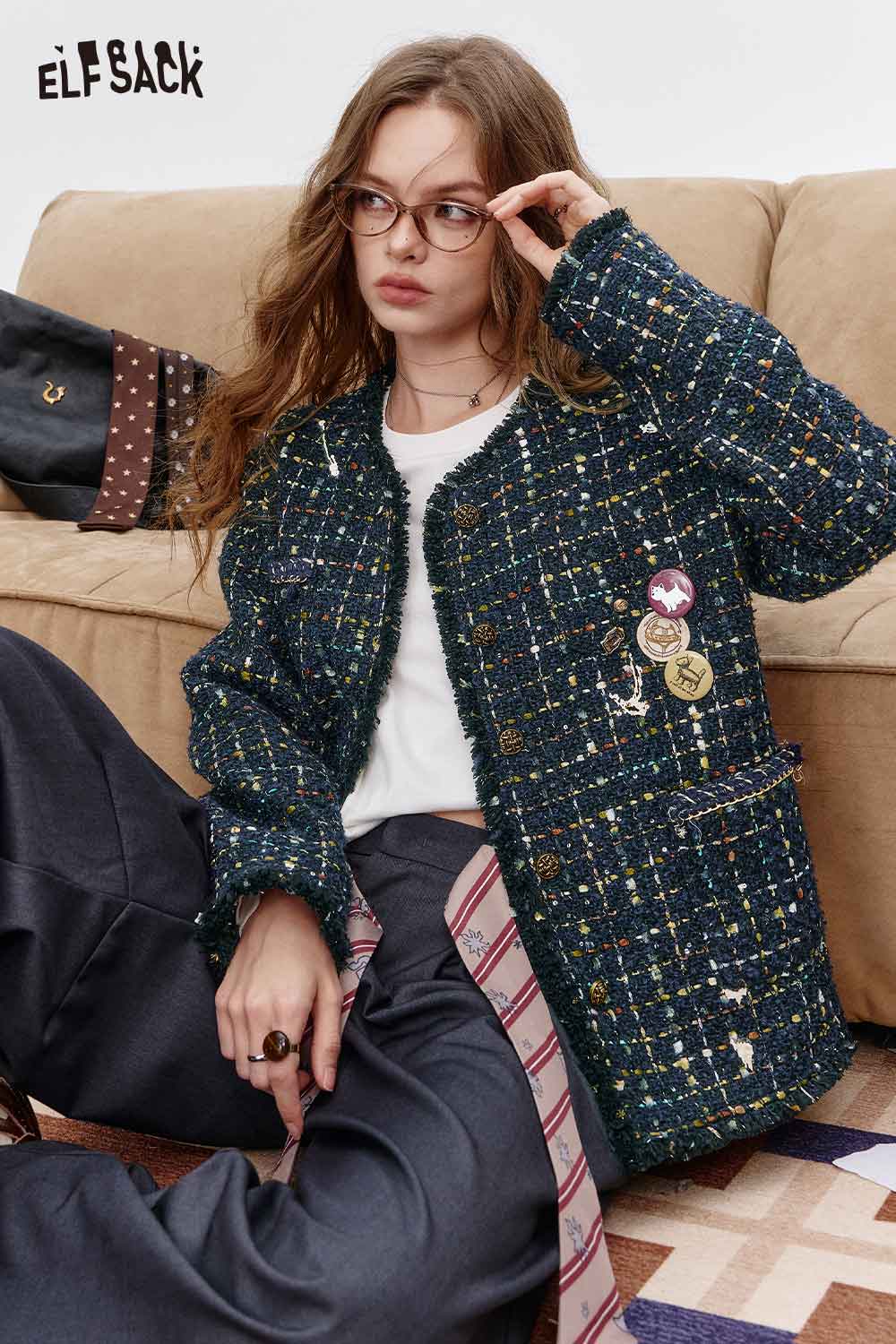 Wool Blend Tweed Structured Detachable Brooch Detail Outerwear Coat