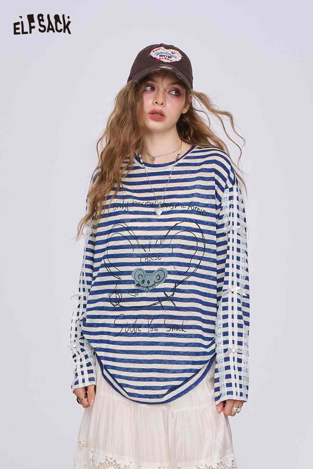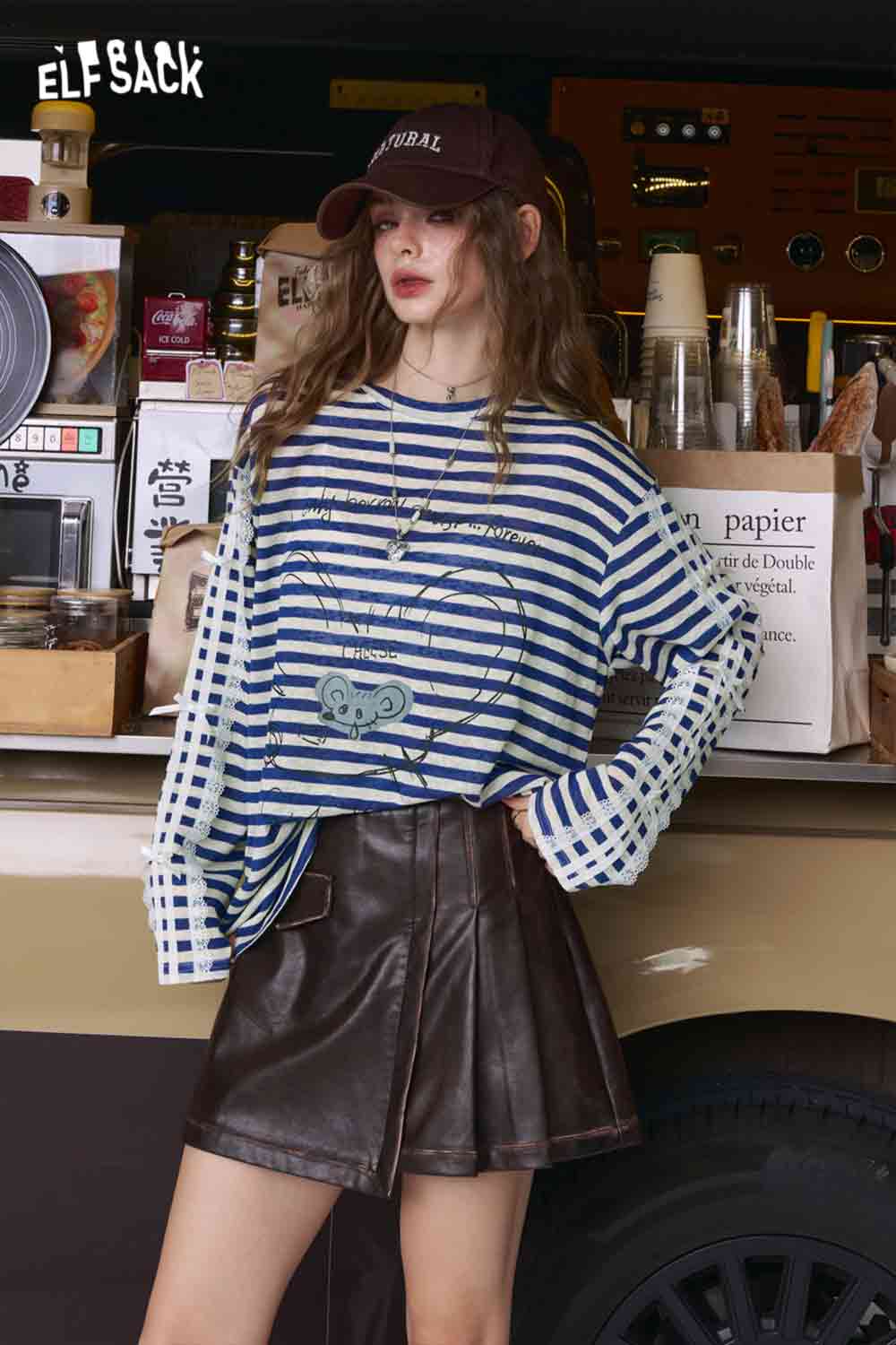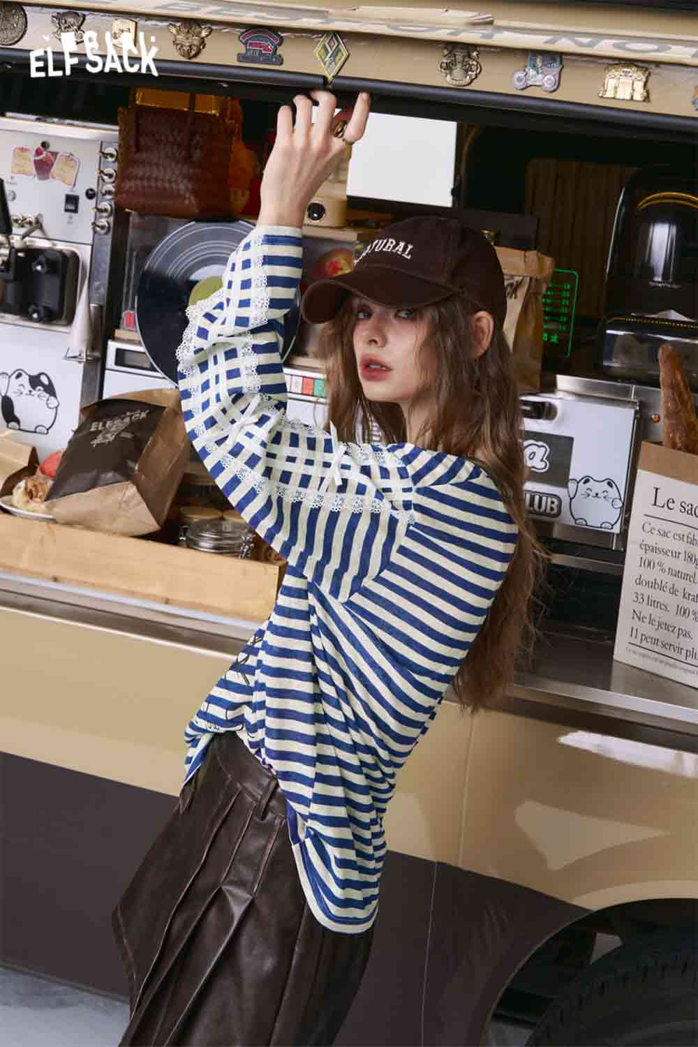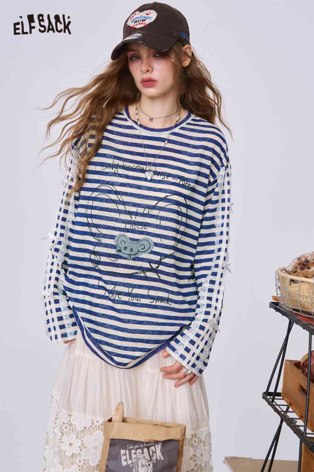 Lace Patchwork Striped Long Sleeve T-Shirt