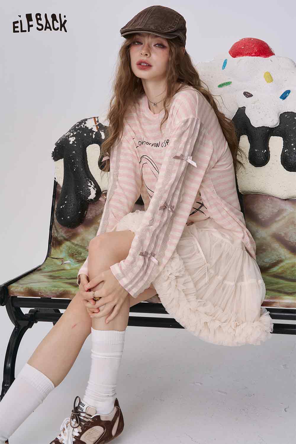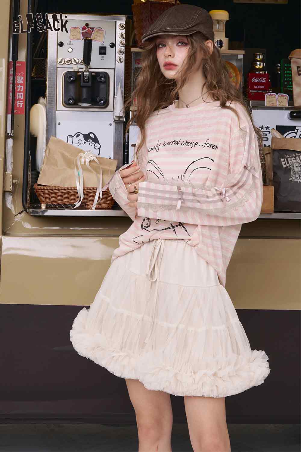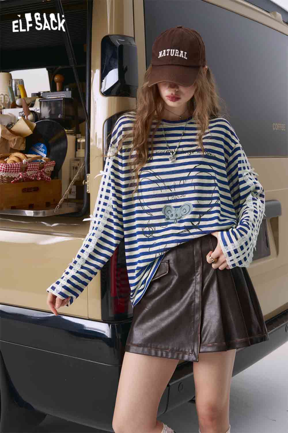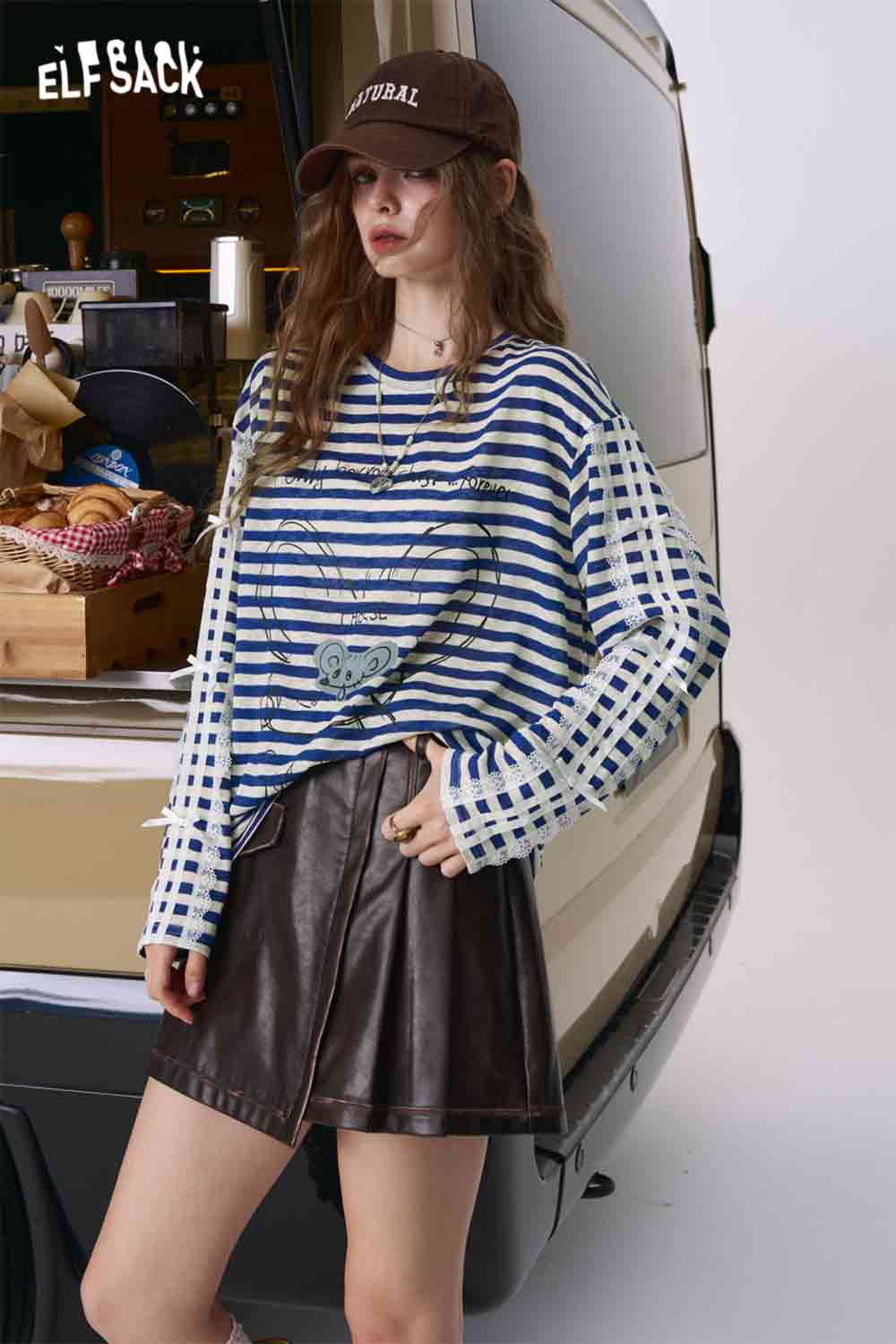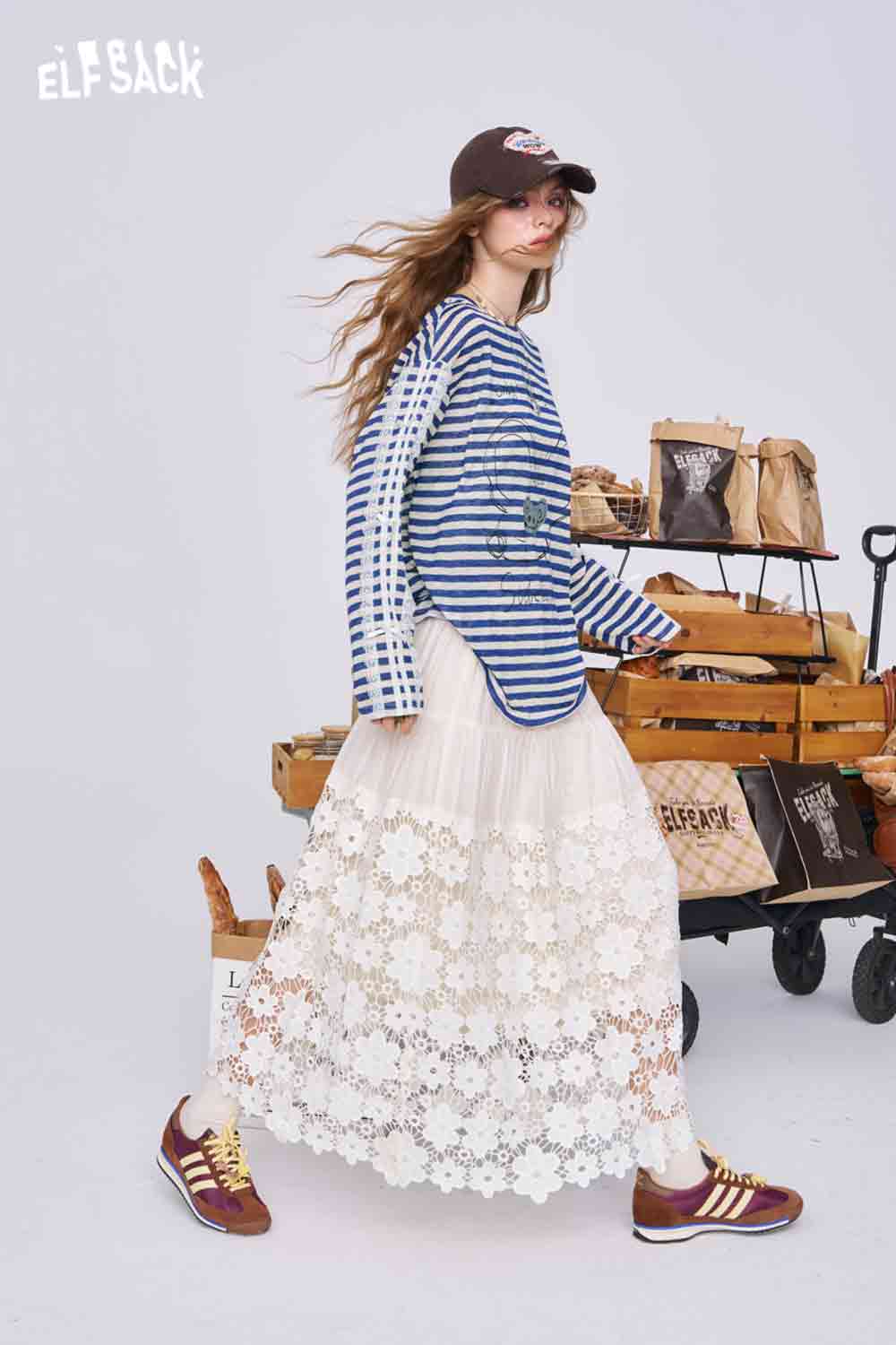Lace Patchwork Striped Long Sleeve T-Shirt