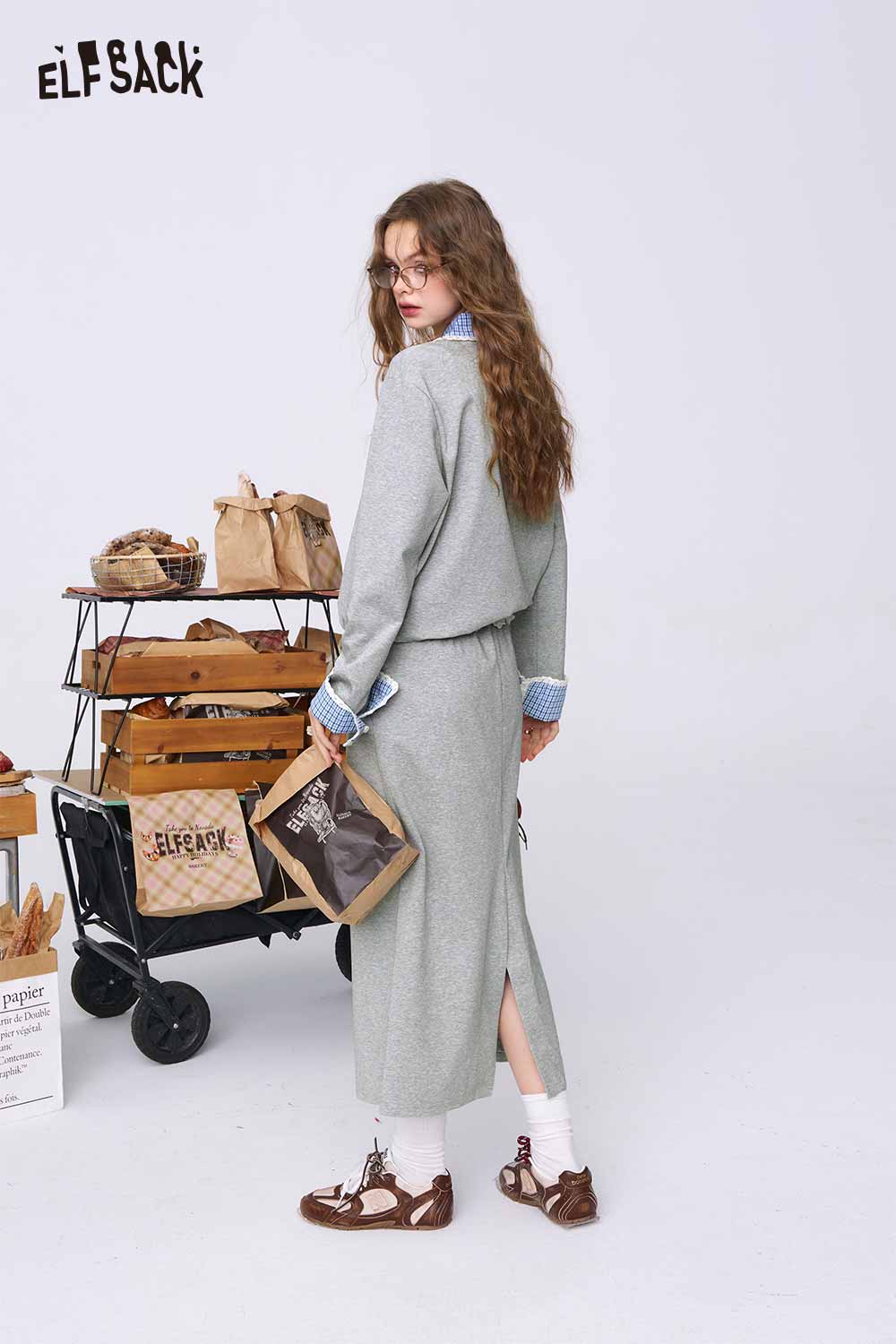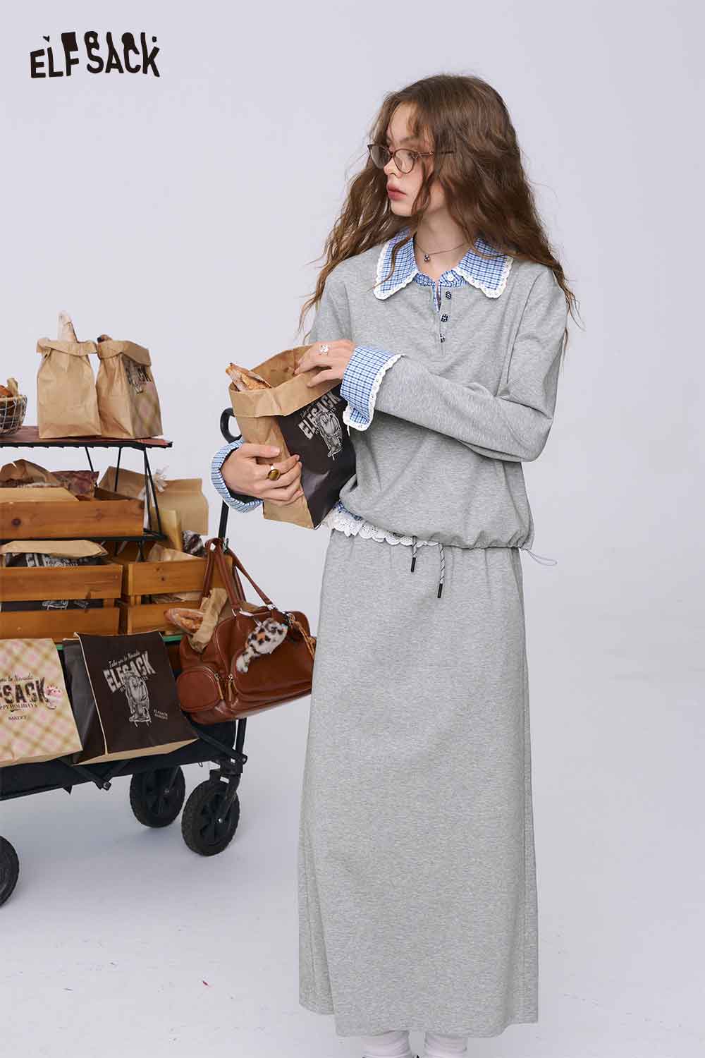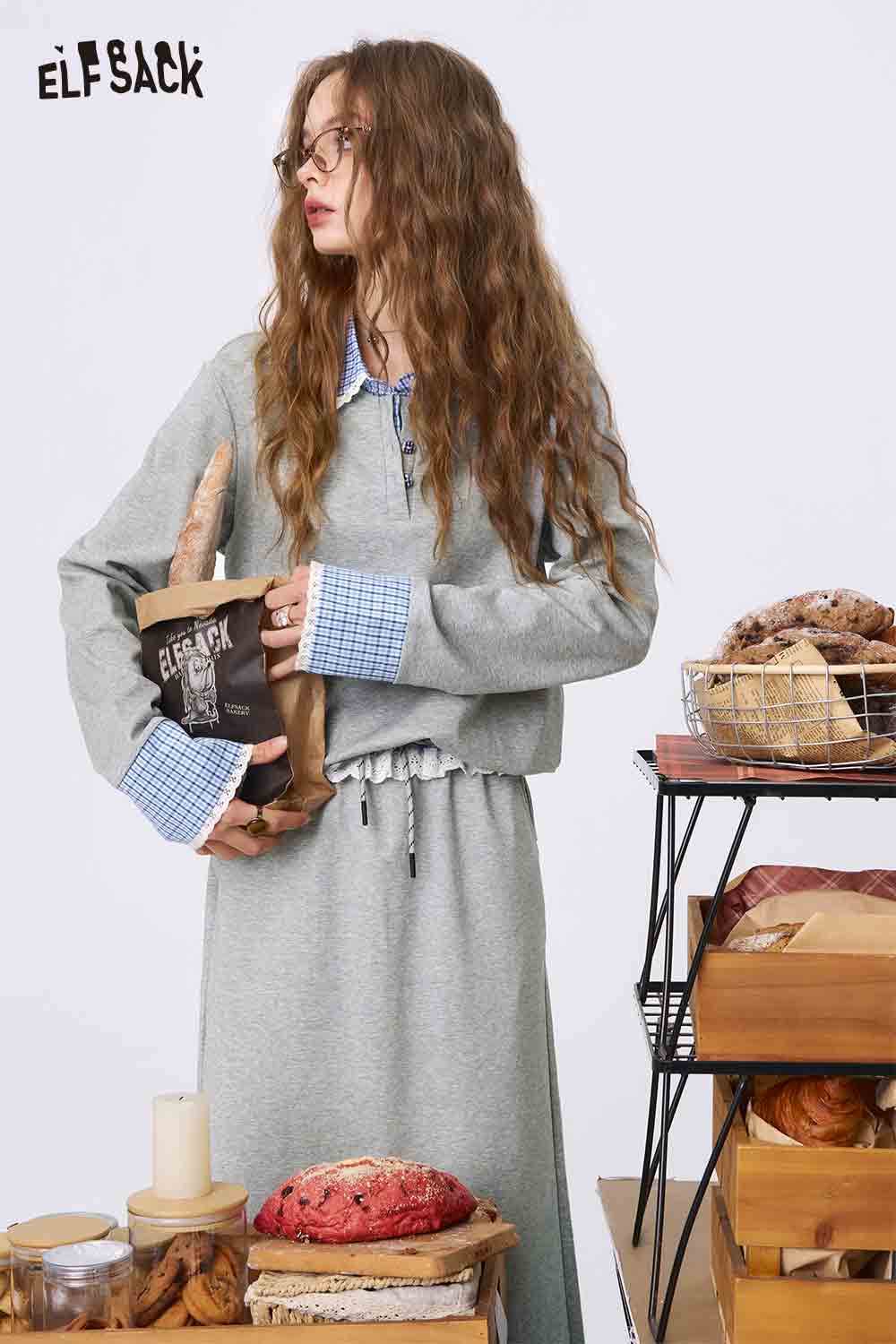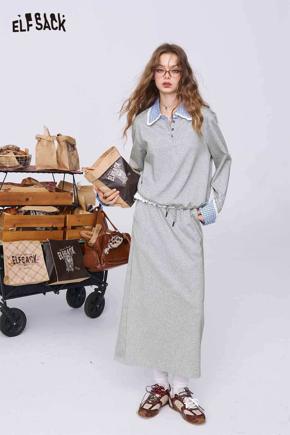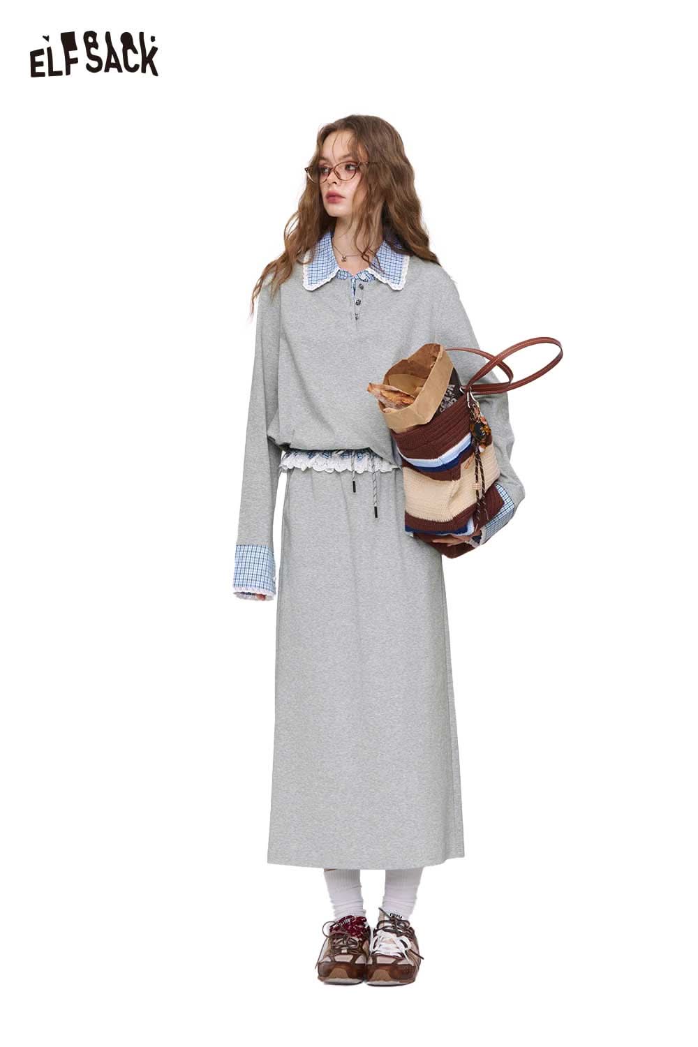 Gray Patchwork Hoodie & Skirt Set ¡§C Two-Piece Casual Outfit