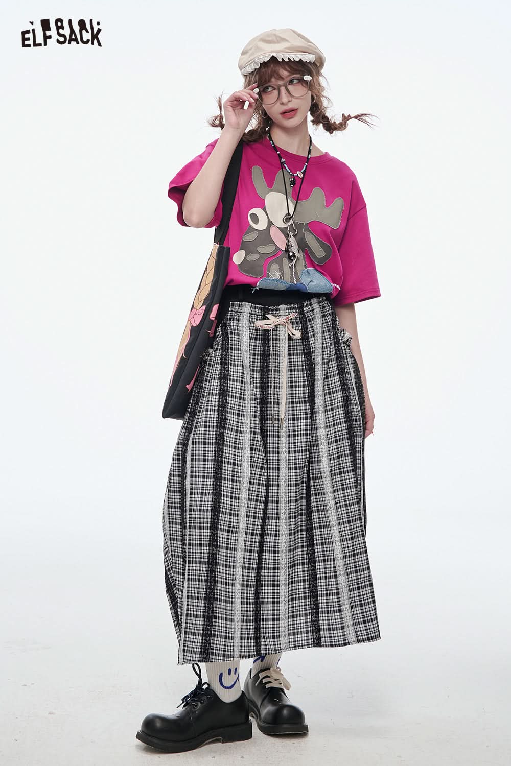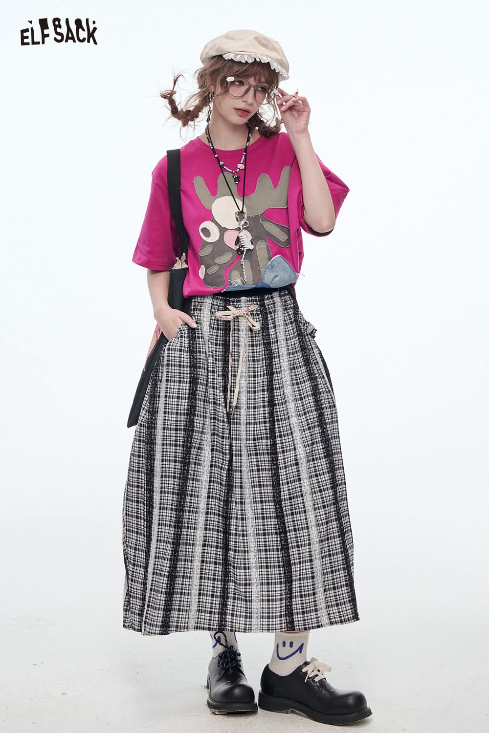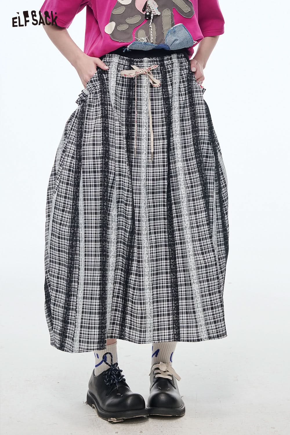 Sweet Bow Pleated Plaid Skirt Women Lace Stitching Loose Long Skirt