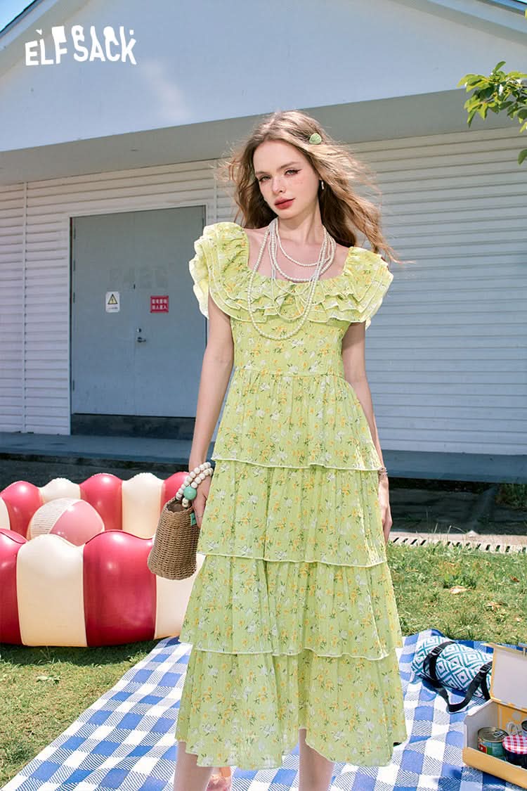 Ruffled gentle style green chiffon floral holiday style cake dress for wommen