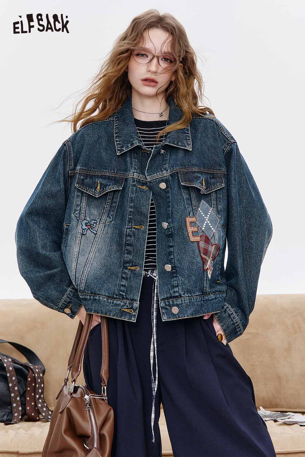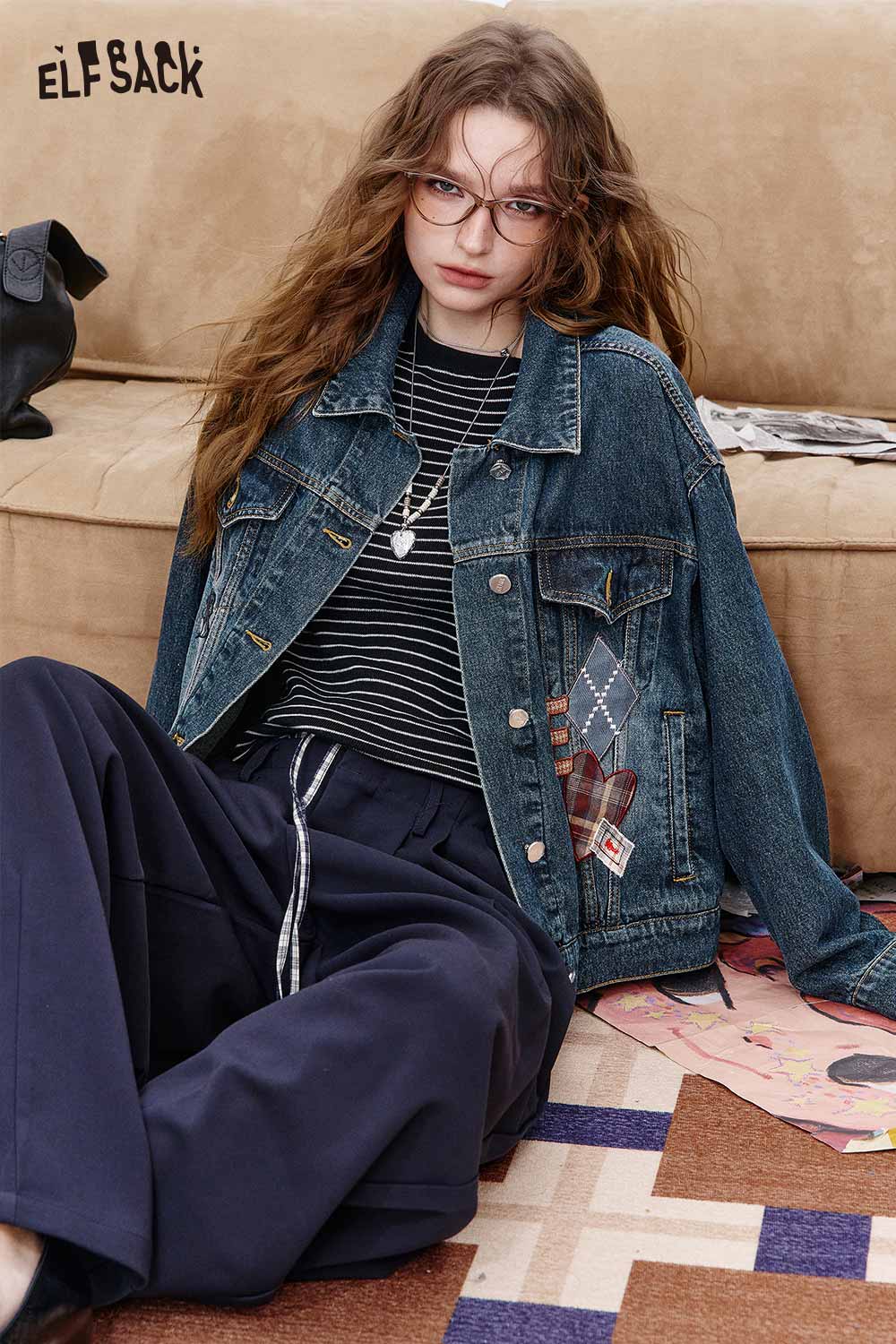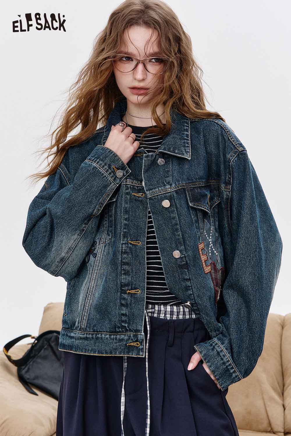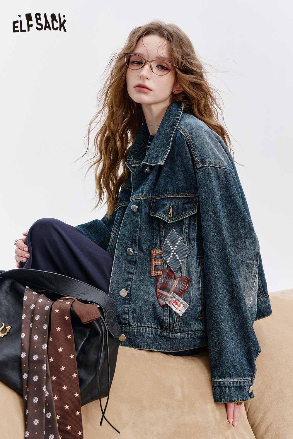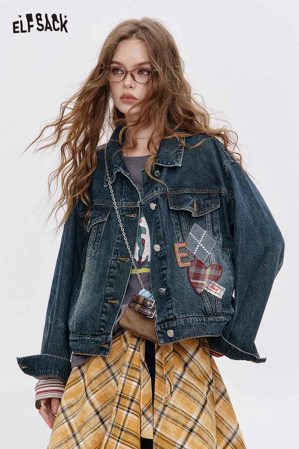 Oversized Denim Jacket with Heart Applique Details Y2K Style Outerwear