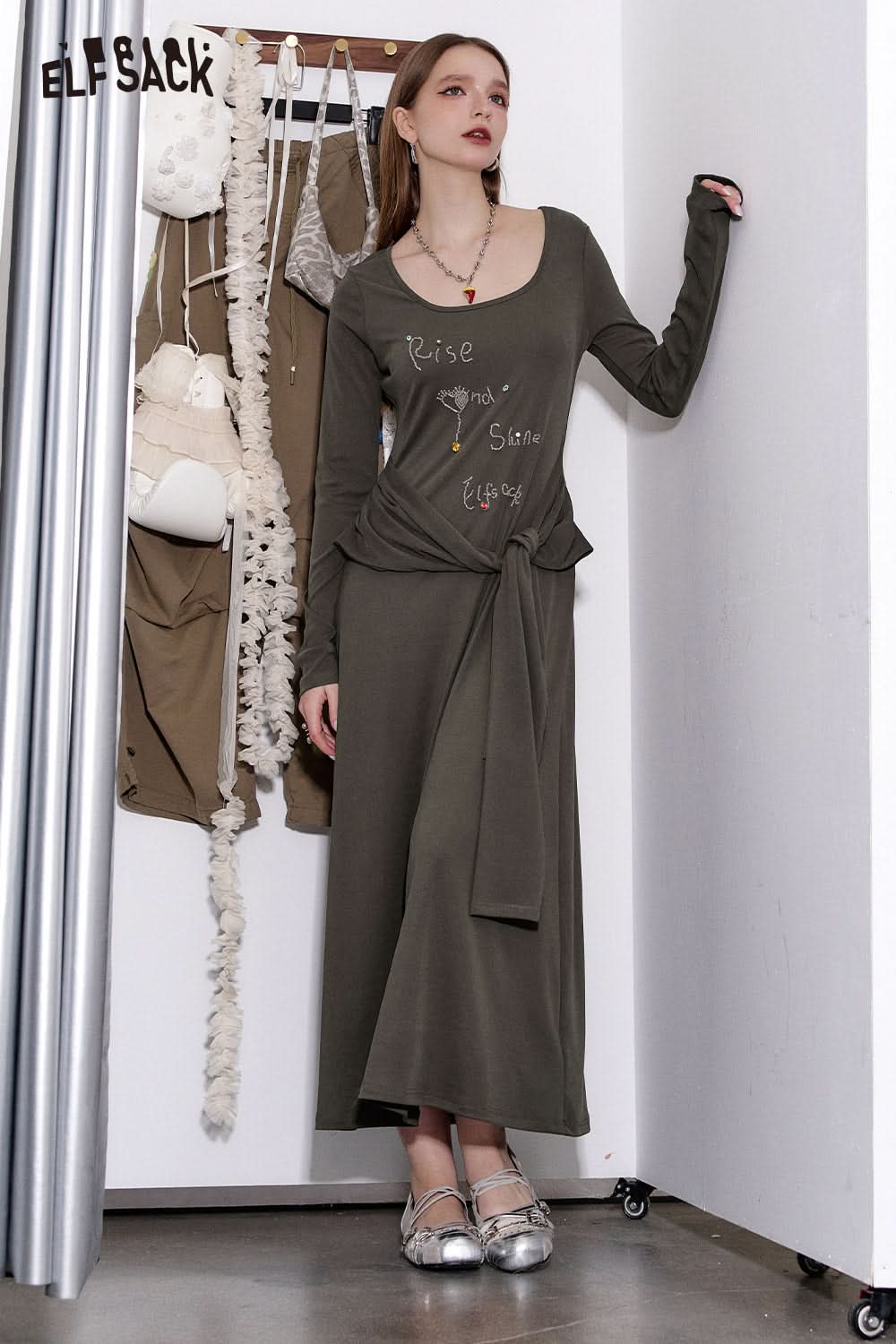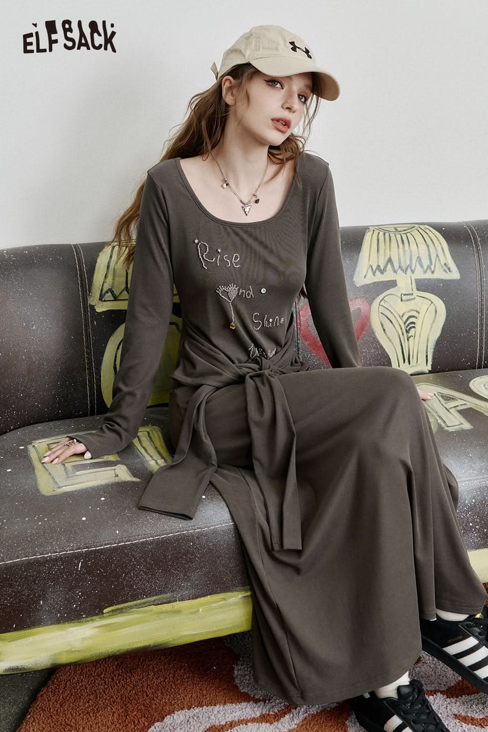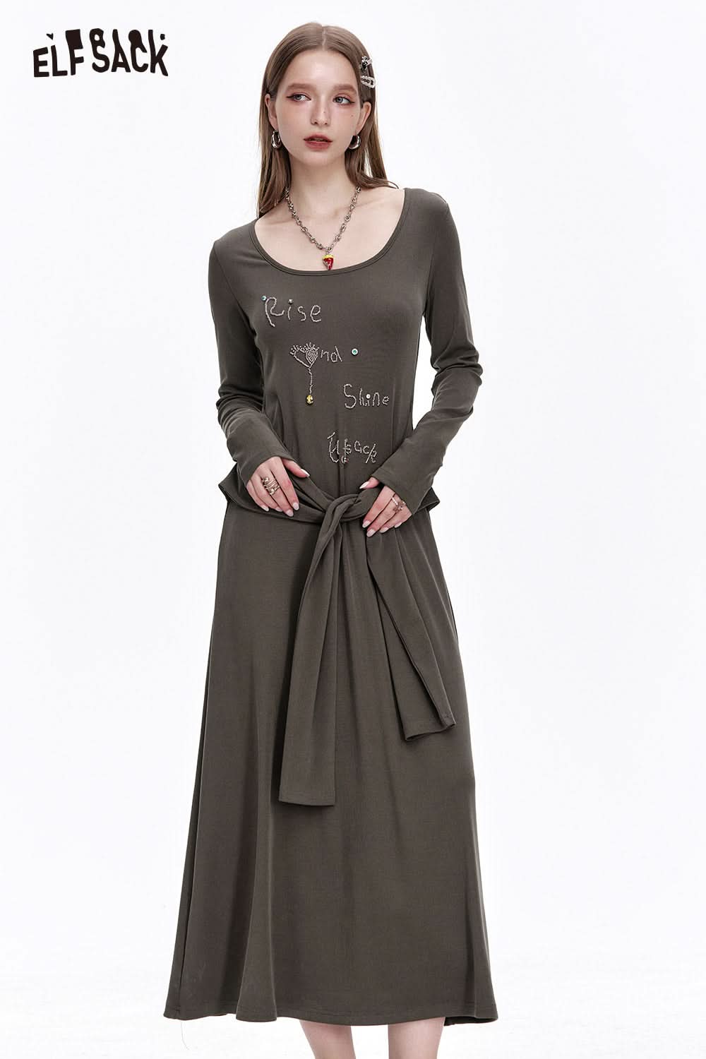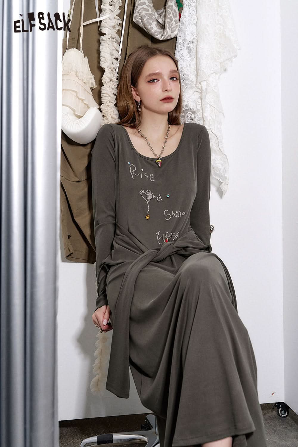 Retro beaded diamond long sleeve dress women's sweet cool casual long dress