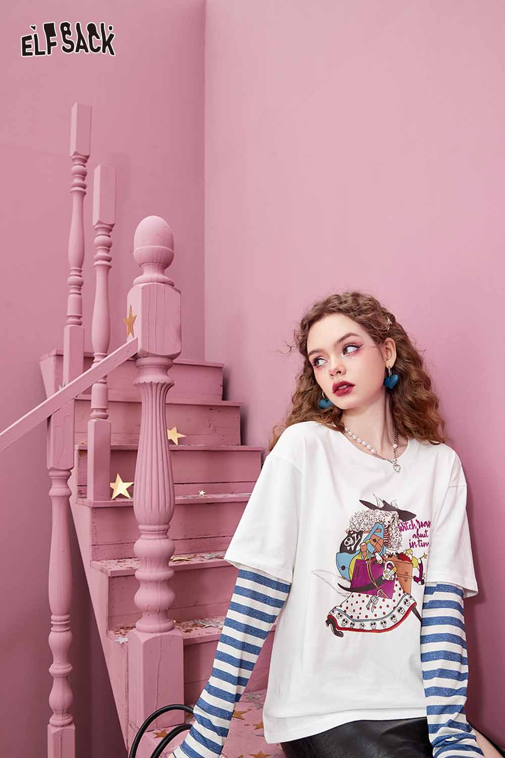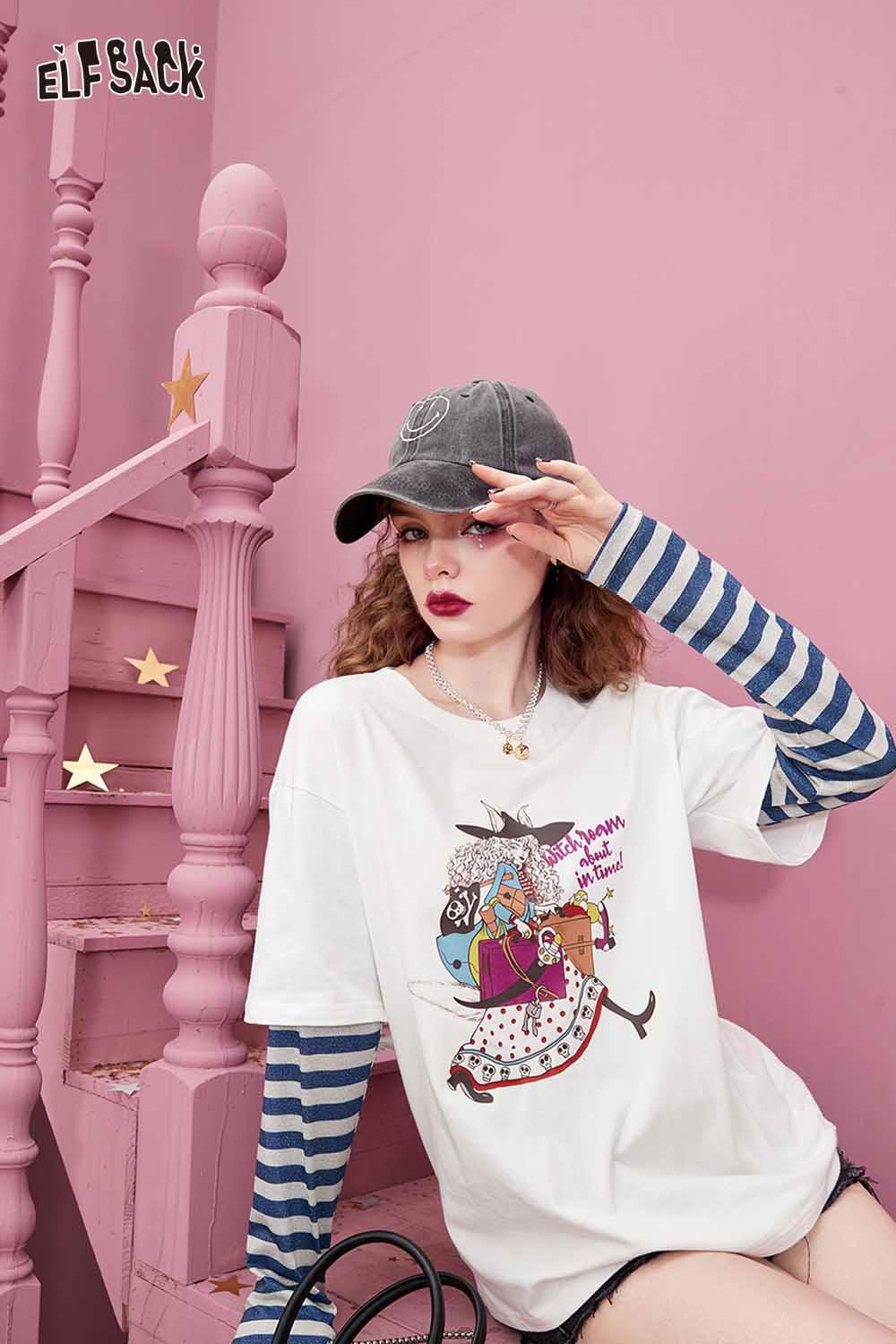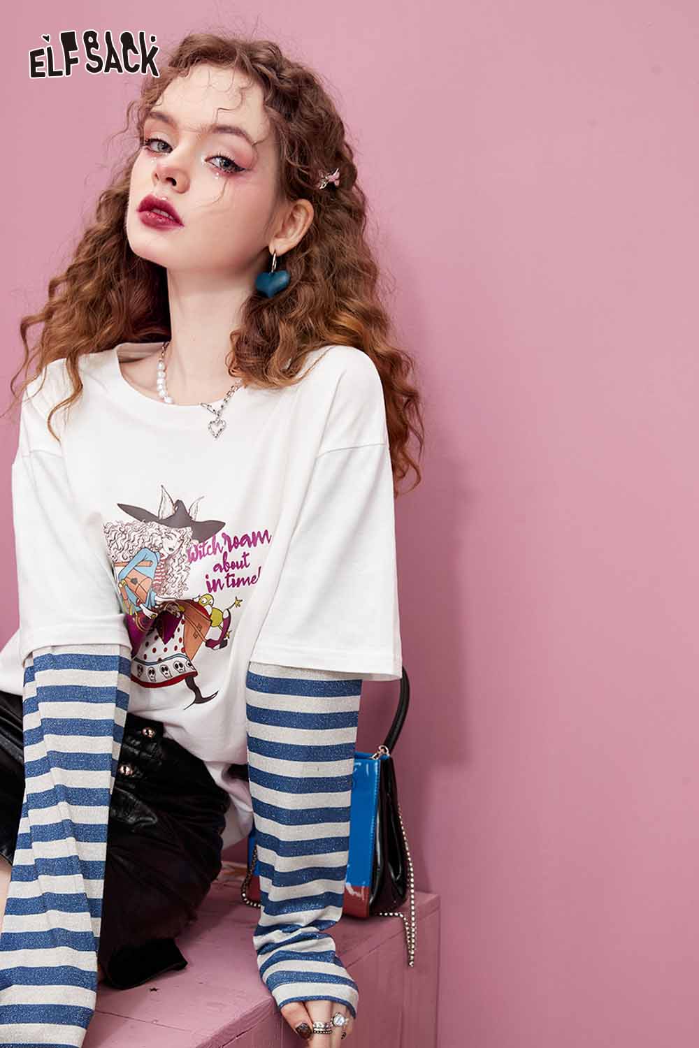 Loose Fake Two Piece Stripe Long Sleeve Graphic Patchwork Tshirt