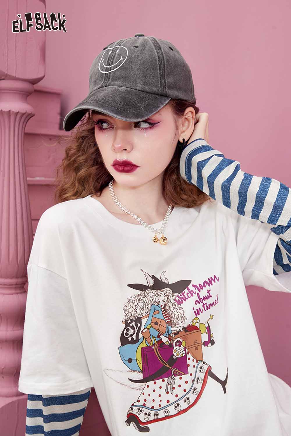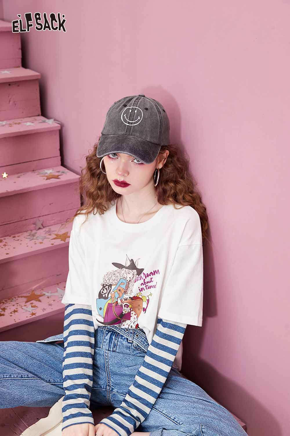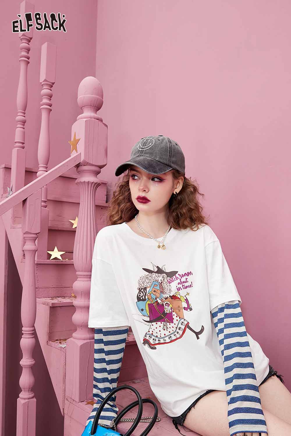 Loose Fake Two Piece Stripe Long Sleeve Graphic Patchwork Tshirt