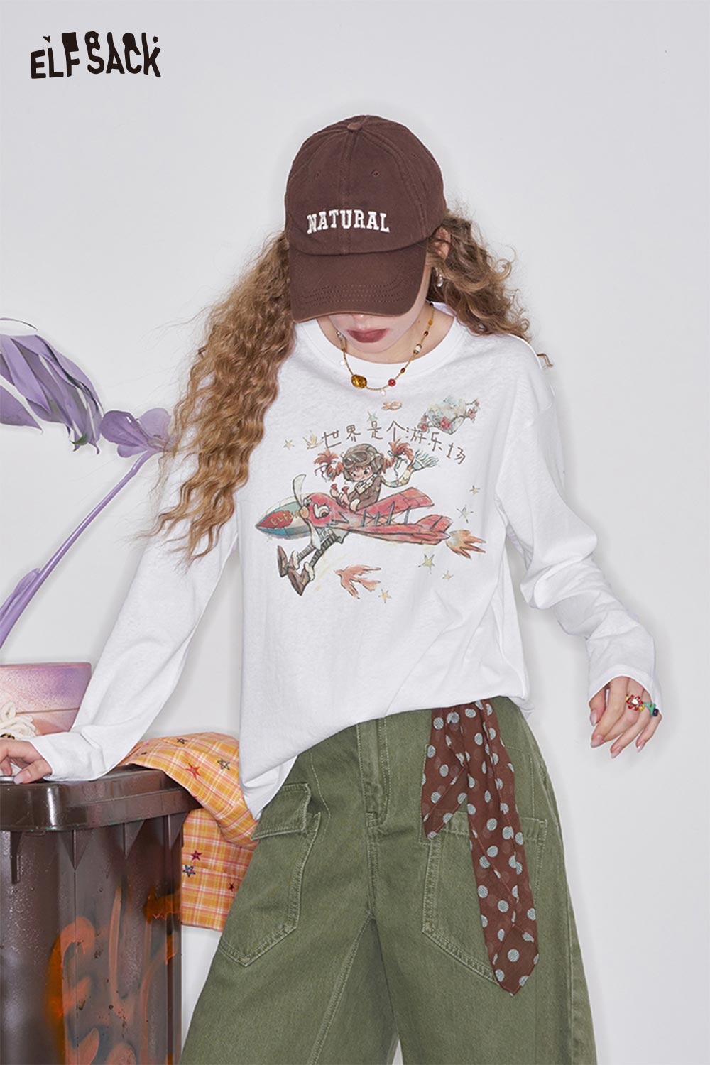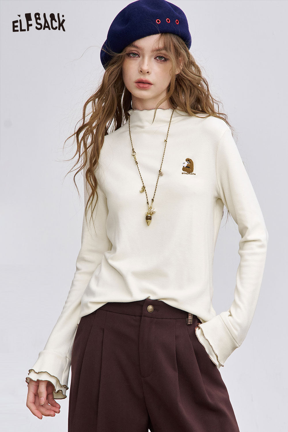ELFSACK fitted hooded tee for women in cream color, styled with wide-leg jeans and accessories