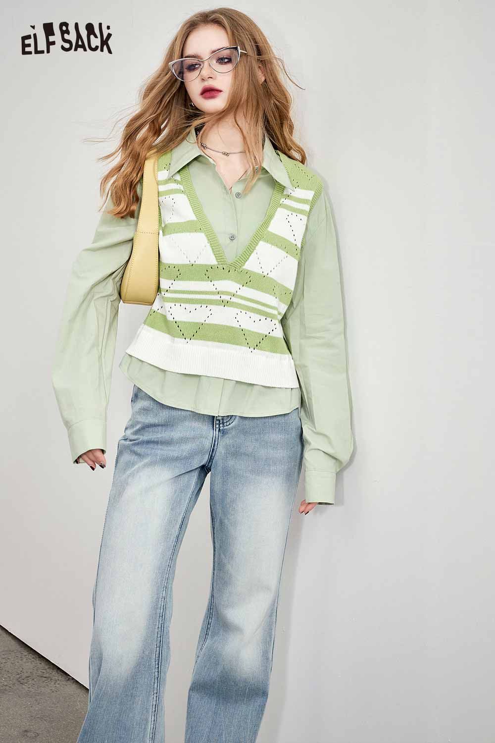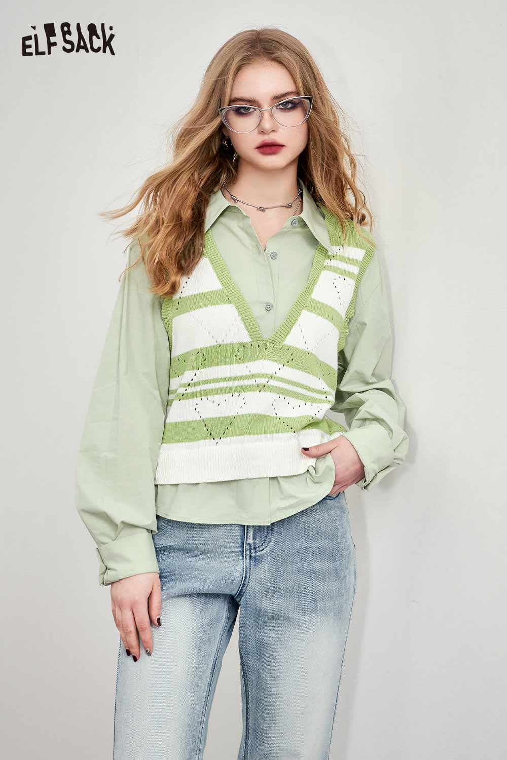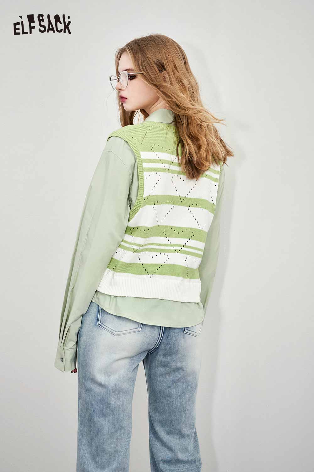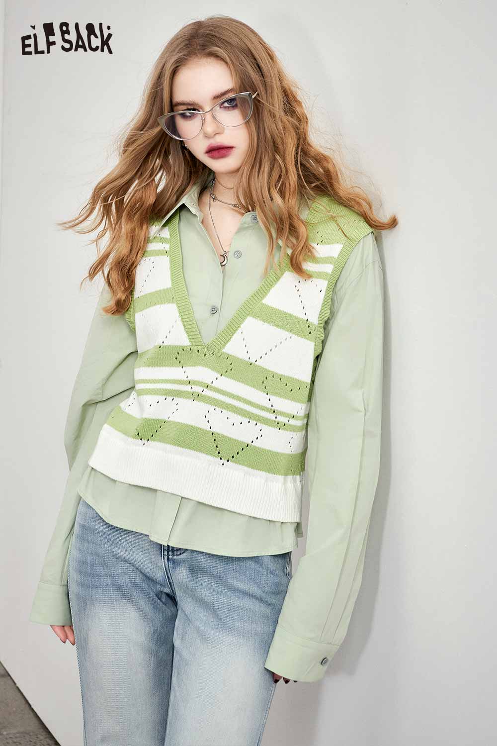 Elegant Shirt Collar V Neck Striped Knit Sweater