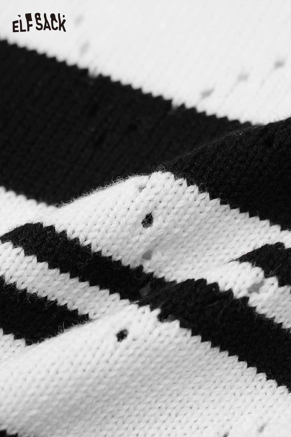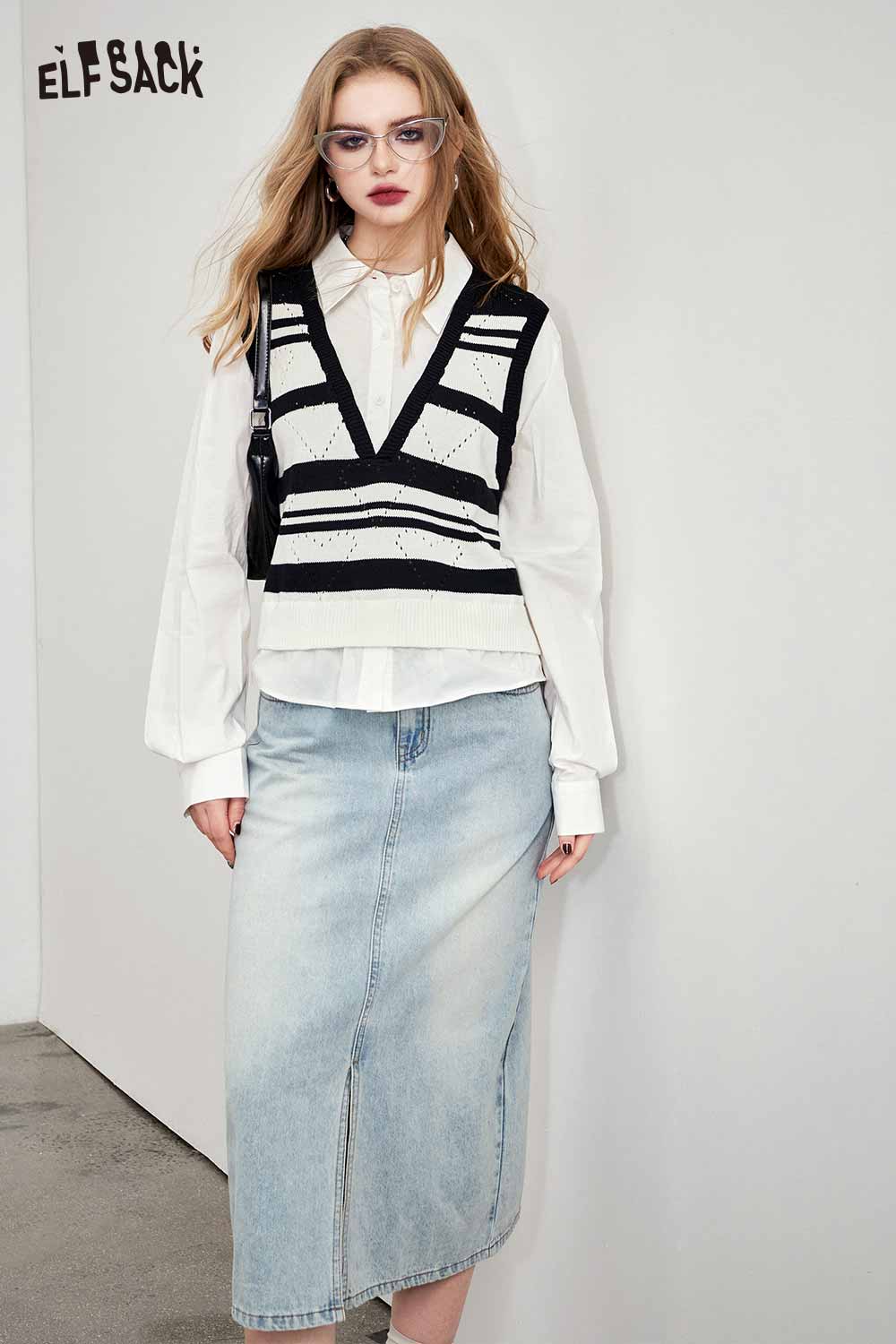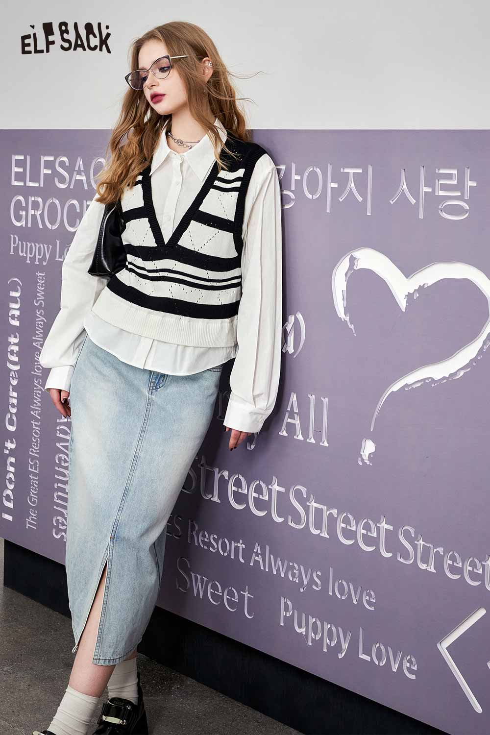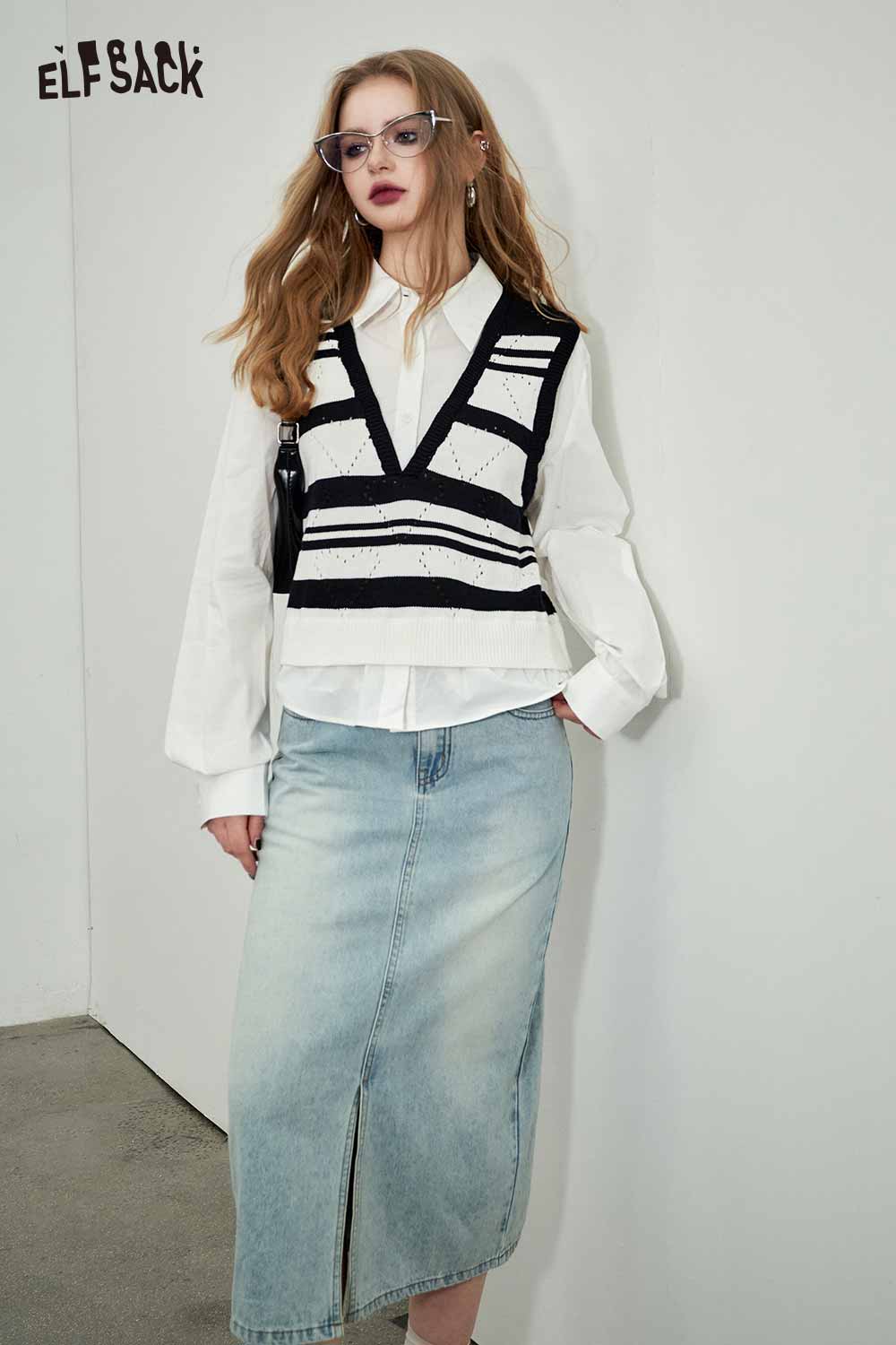 Elegant Shirt Collar V Neck Striped Knit Sweater