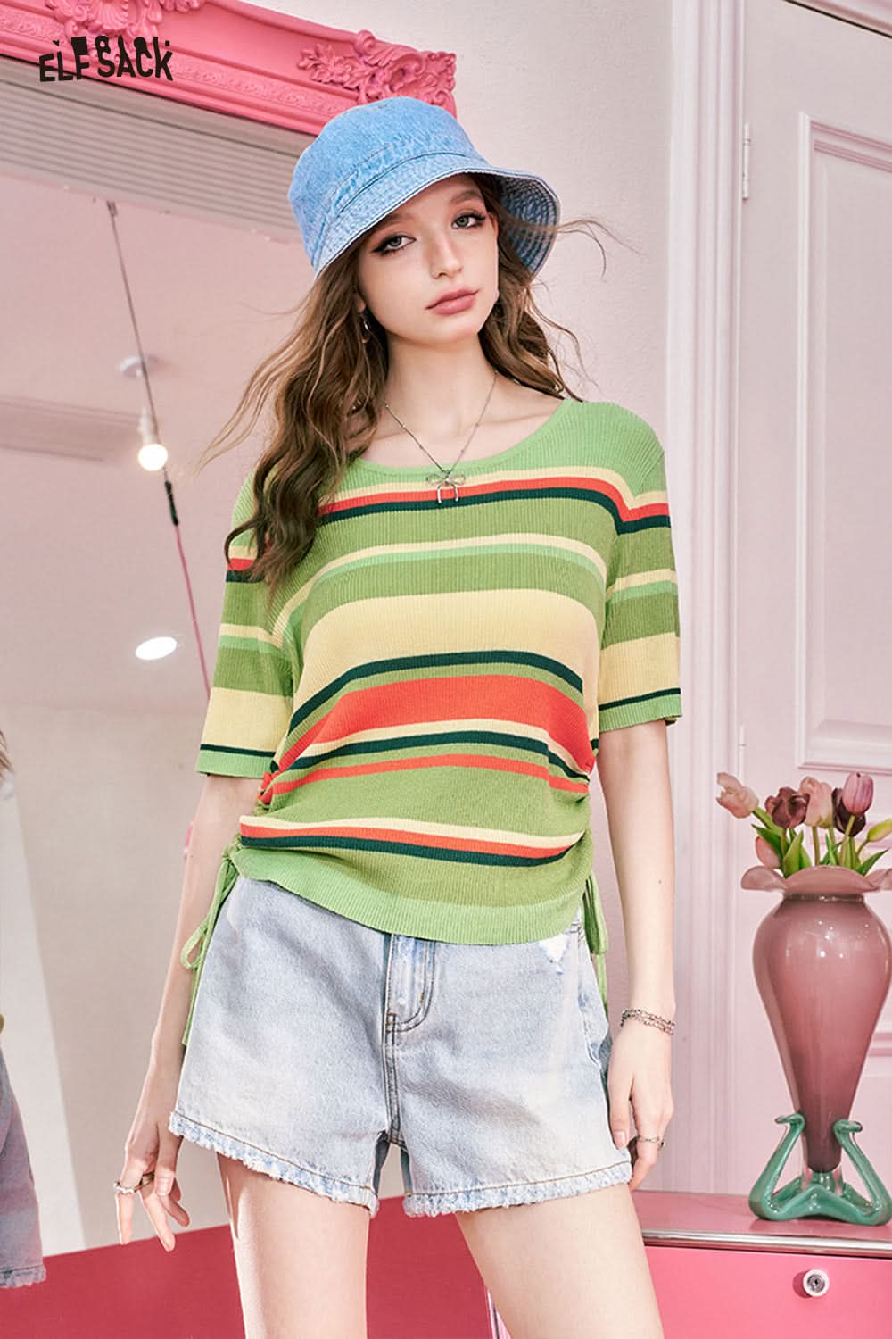 24 Year Summer Dopamine Stripe Casual Knitwear Women's Side Lace Short sleeved Top