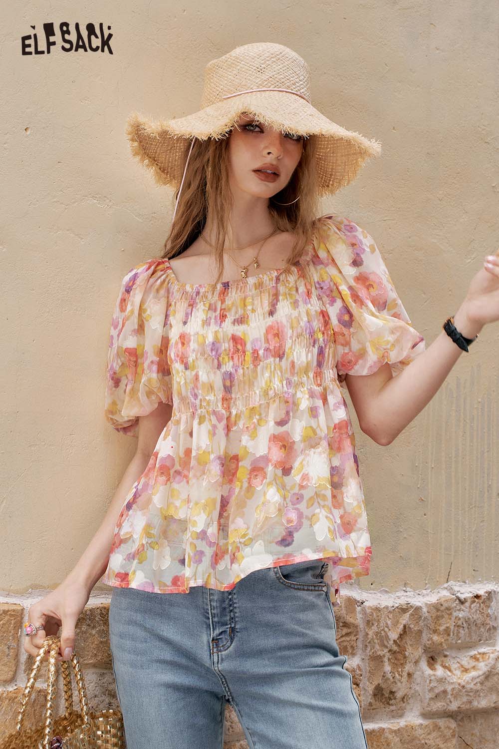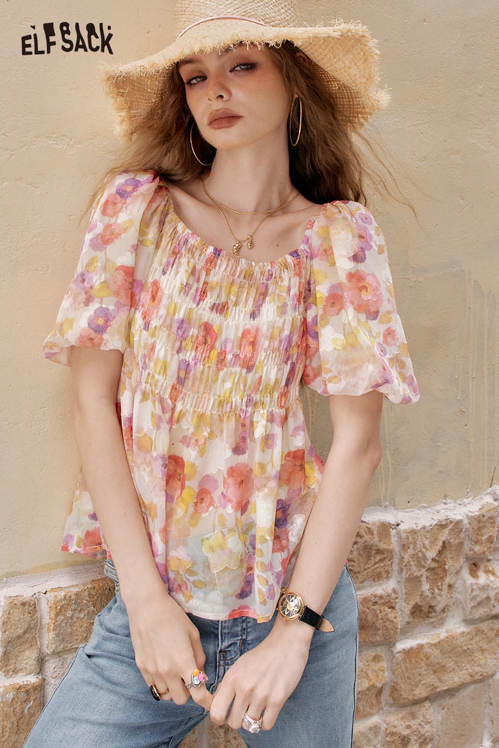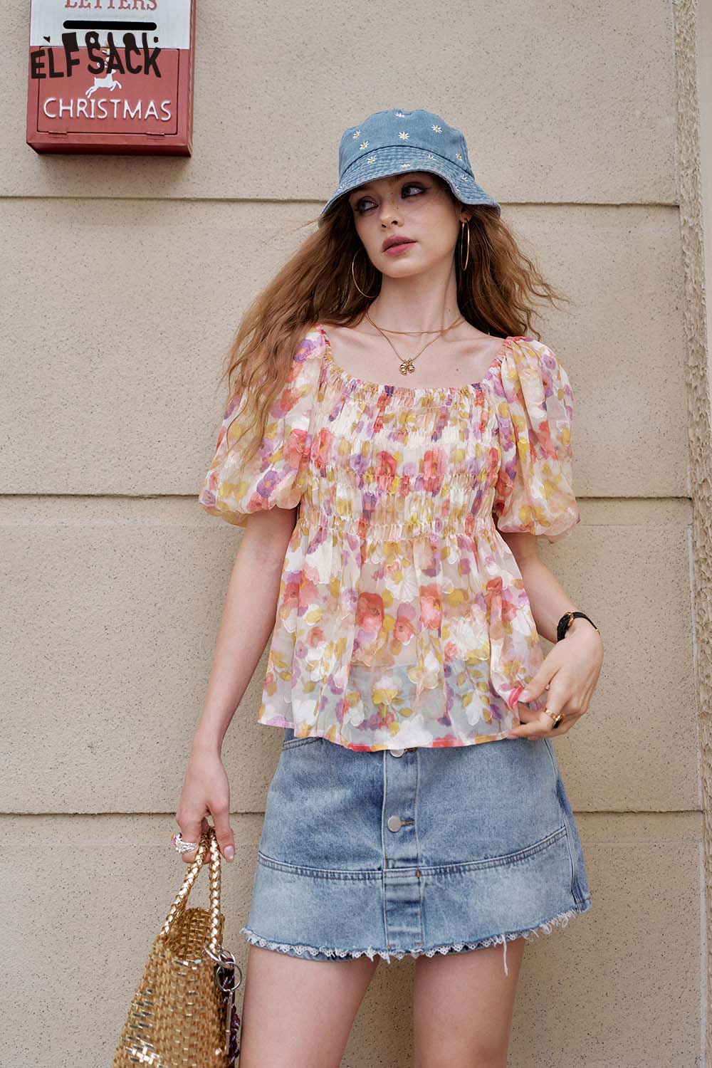 Floral Puff Sleeve French Chiffon Top Resort Summer Blouse