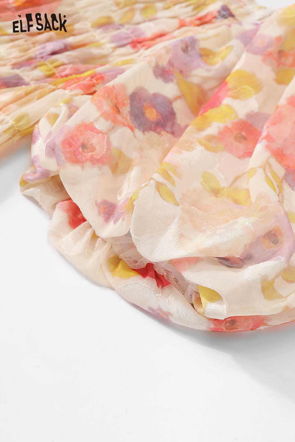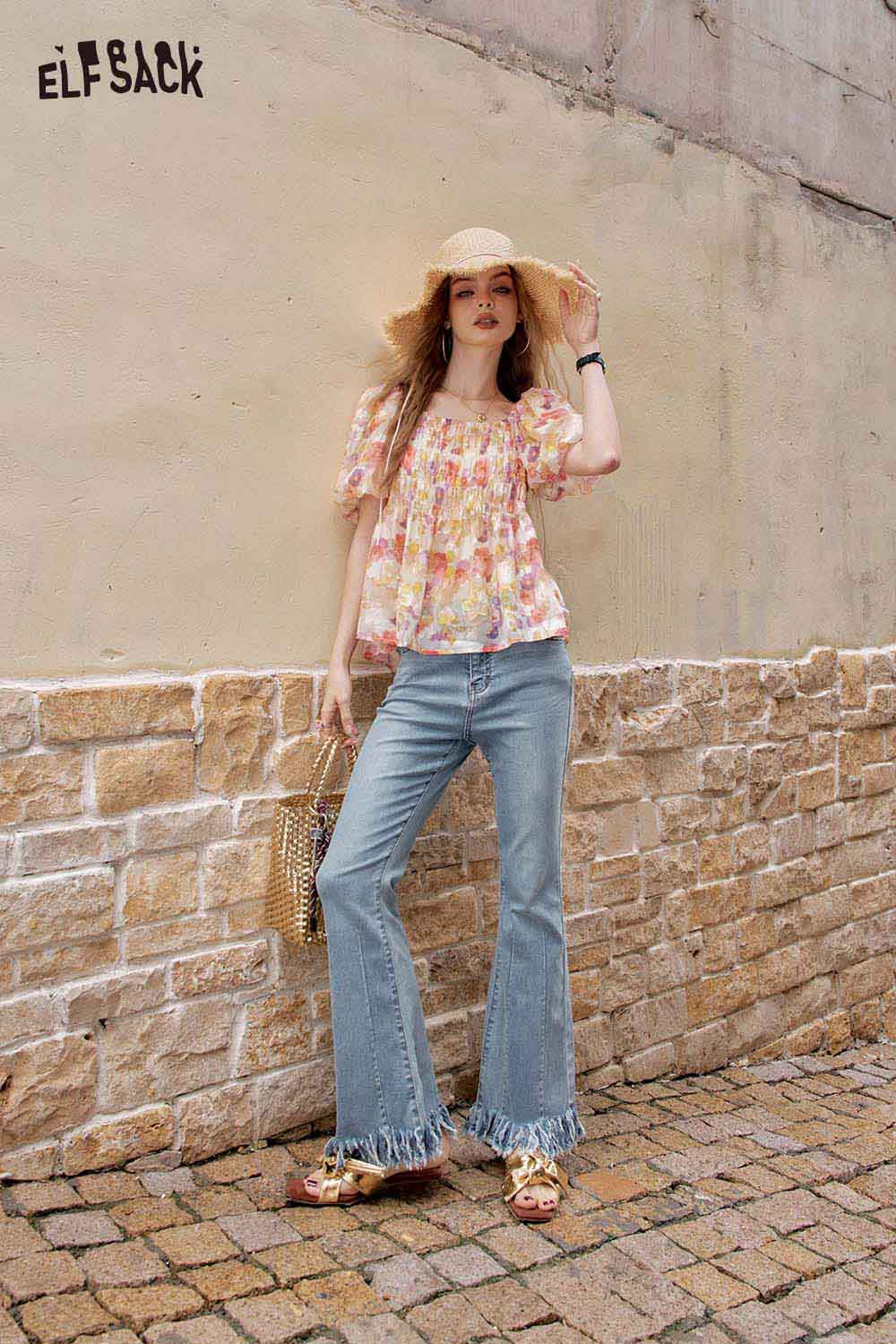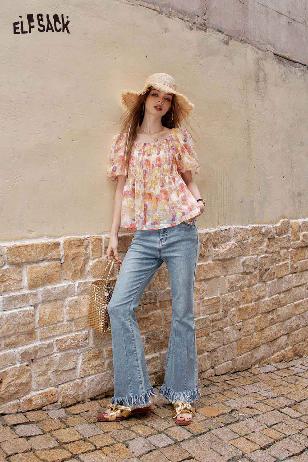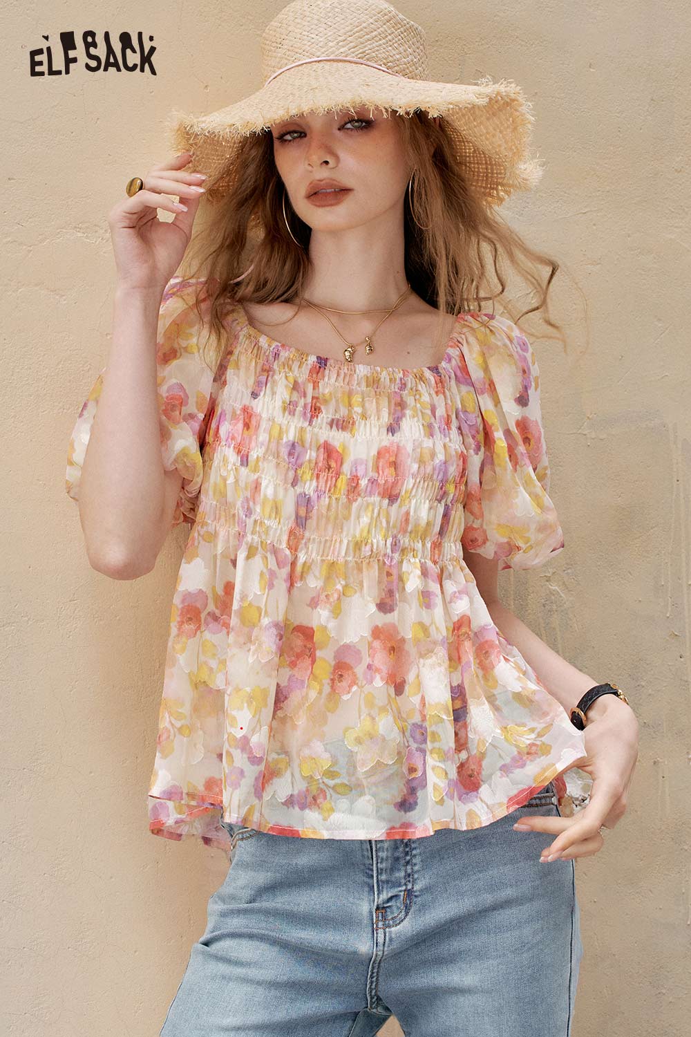 Floral Puff Sleeve French Chiffon Top Resort Summer Blouse