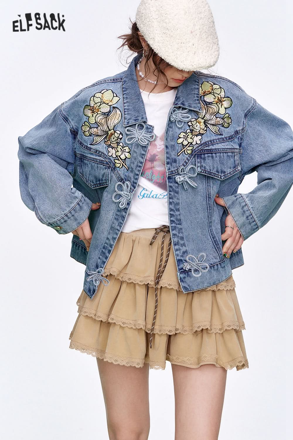 ELFSACK Neo-Chinese style sequin embroidery flower button denim jacket Women