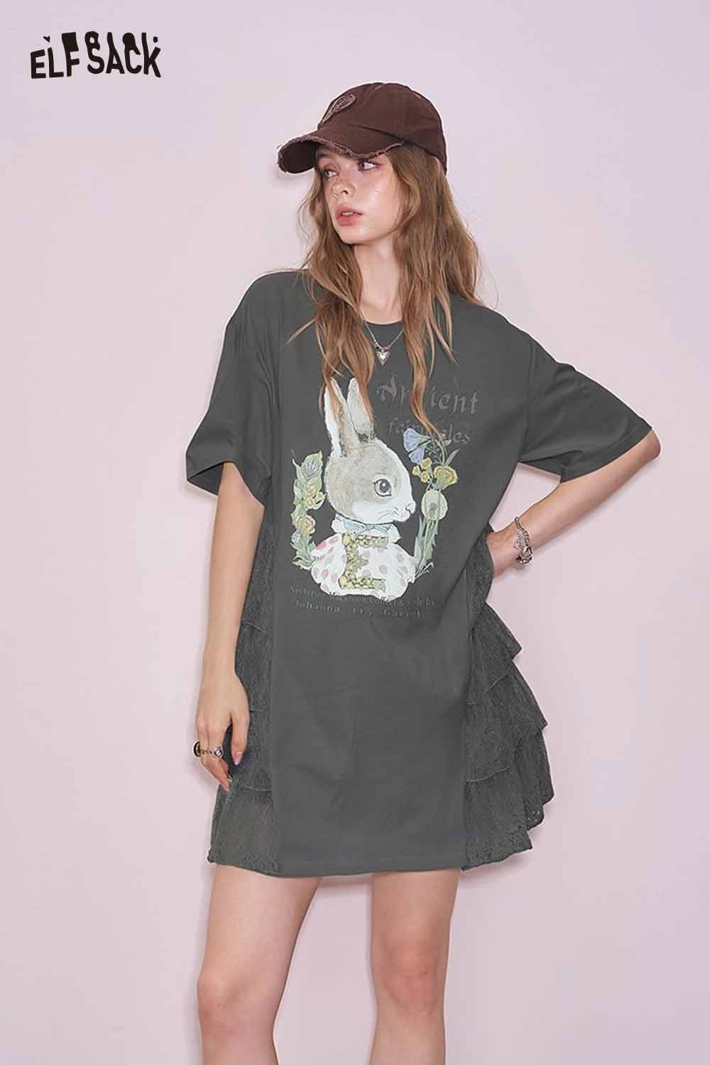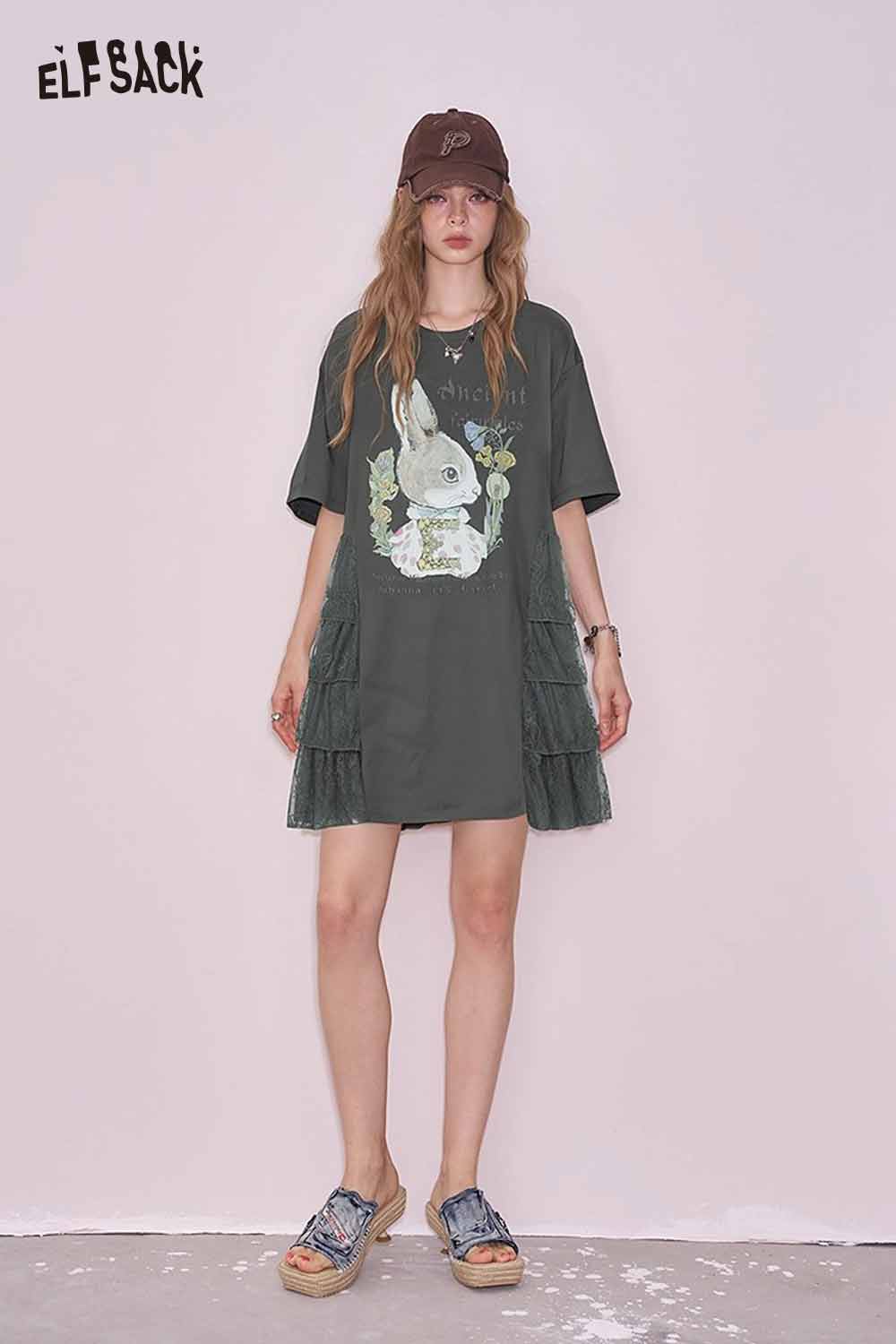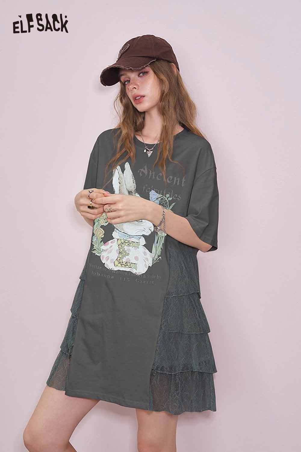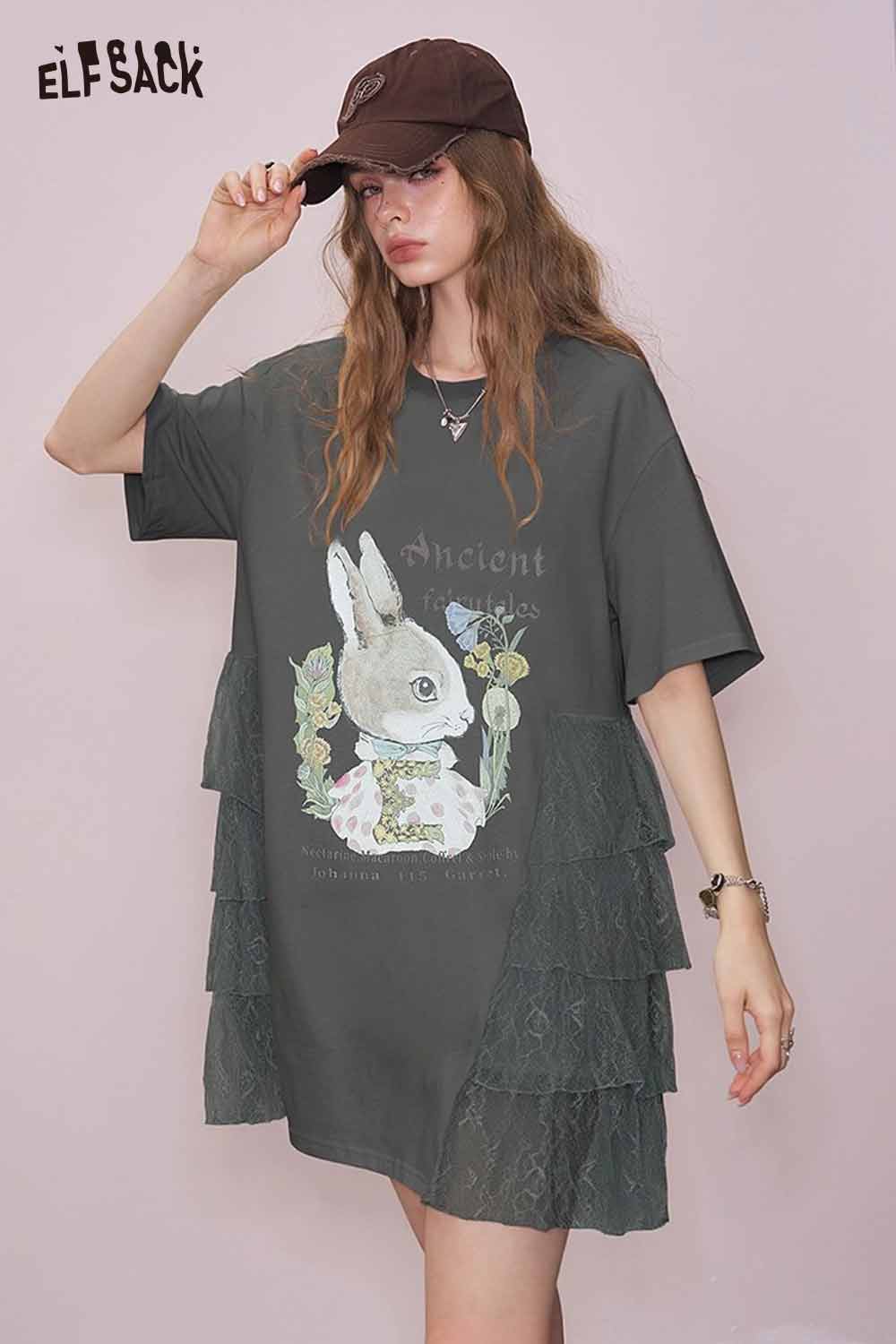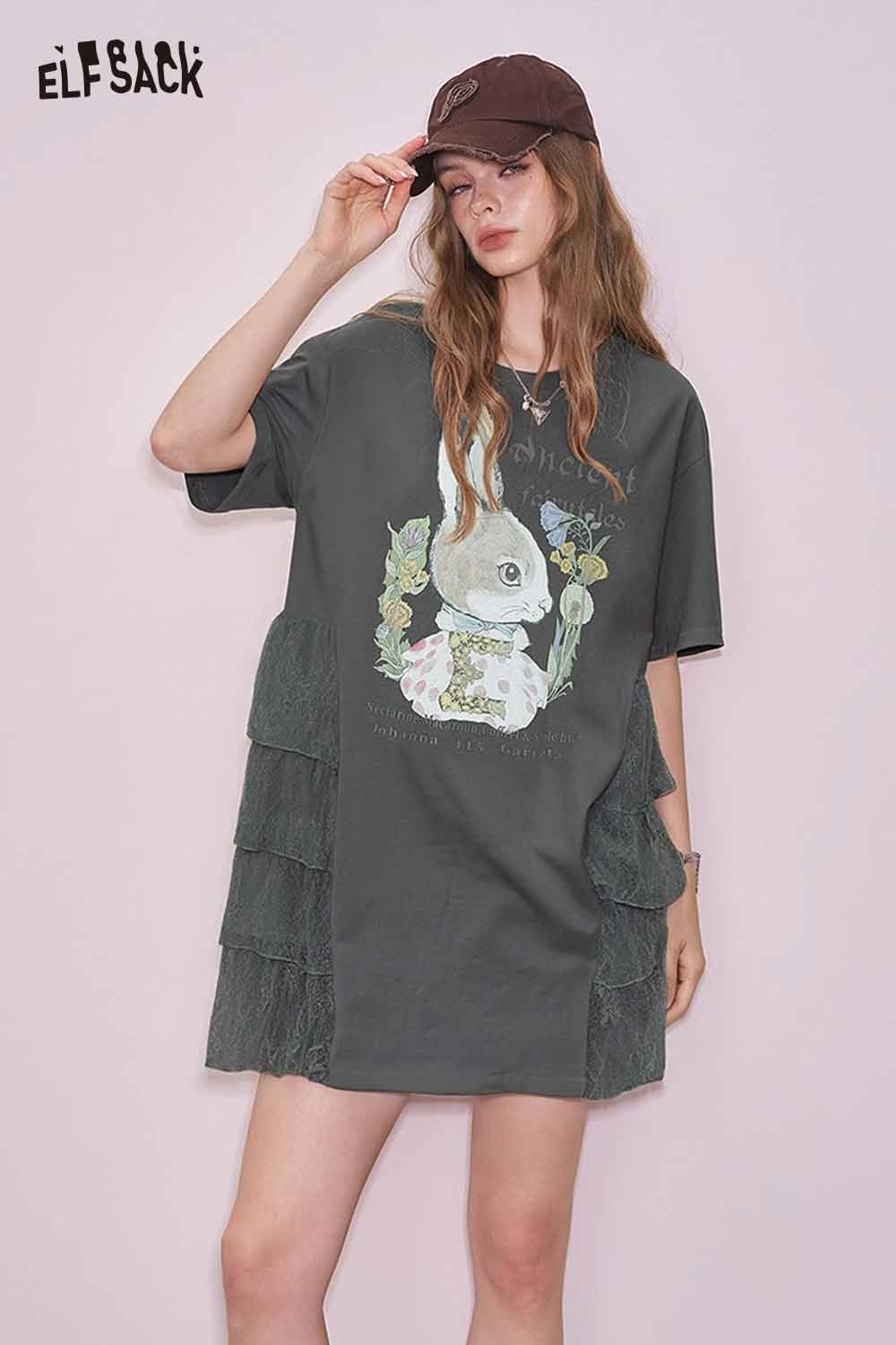 Cute Rabbit Graphic Mesh Design Tshirt Dress