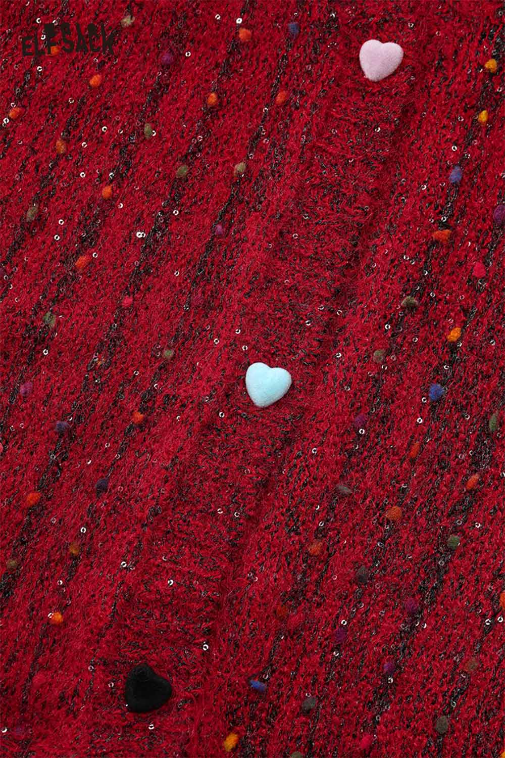 ELFSACK Red Polka Dot V Neck Cardigan with Colorful Heart Accents for a Fun, Stylish Look