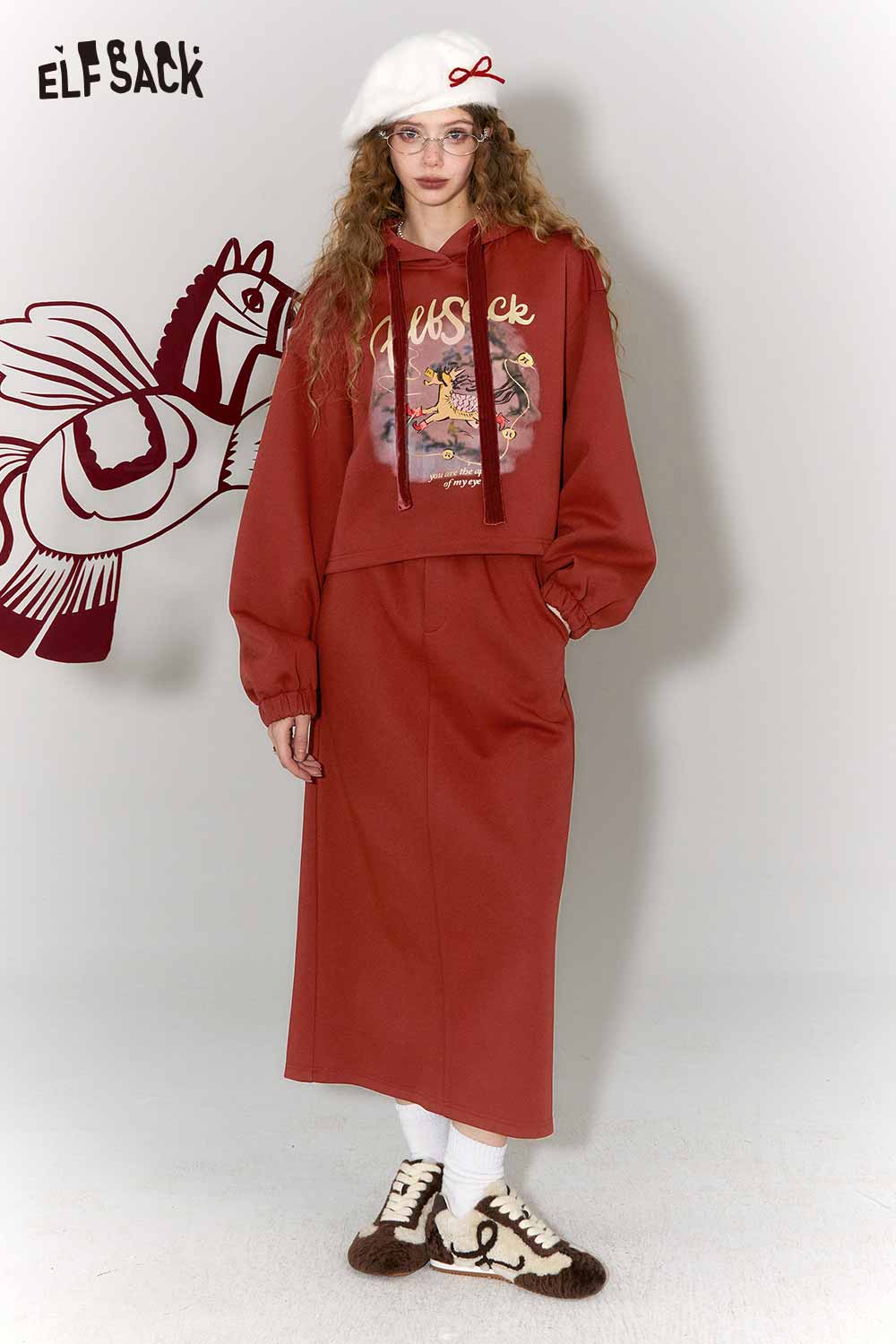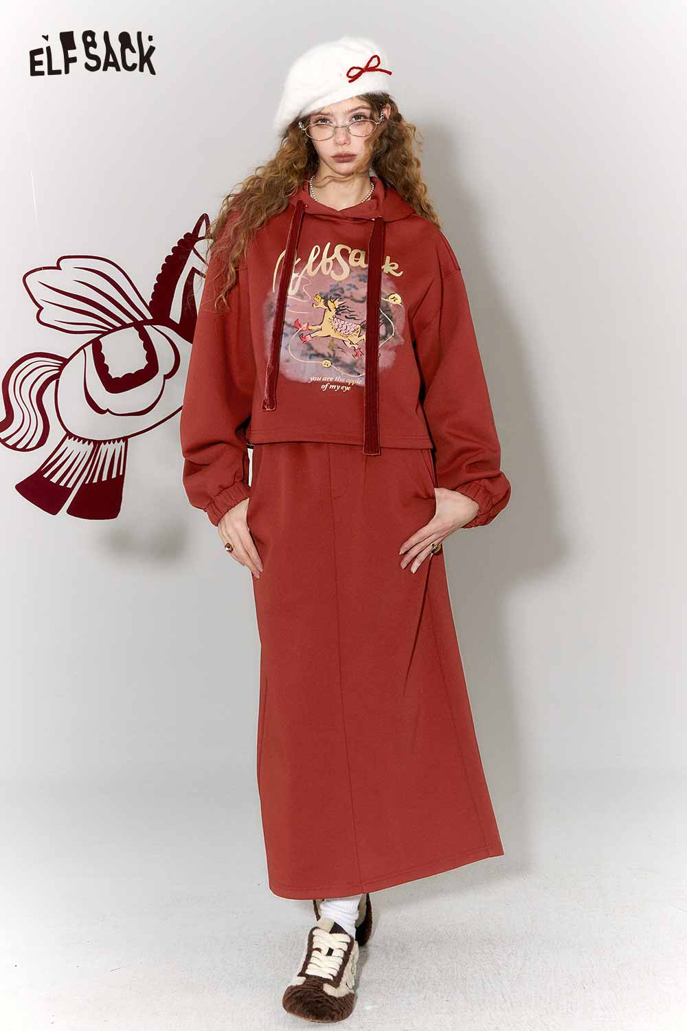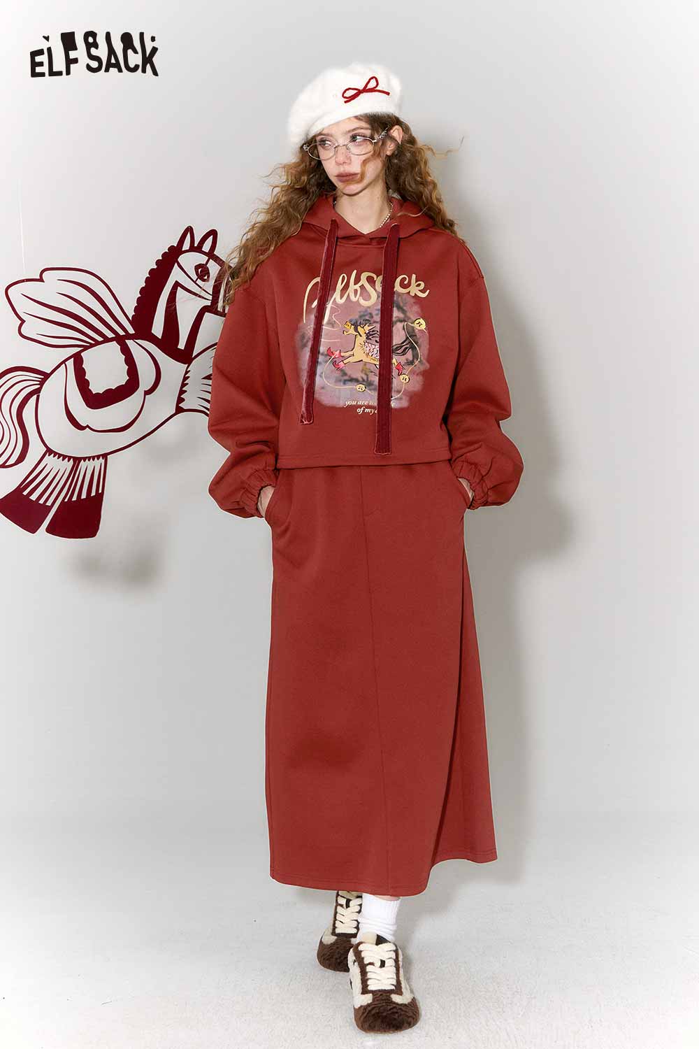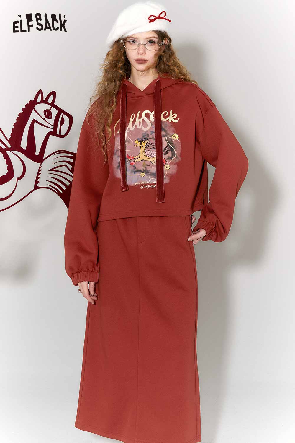 Casual Kylin Print Burgundy Hooded Sweatshirt Skirt Set