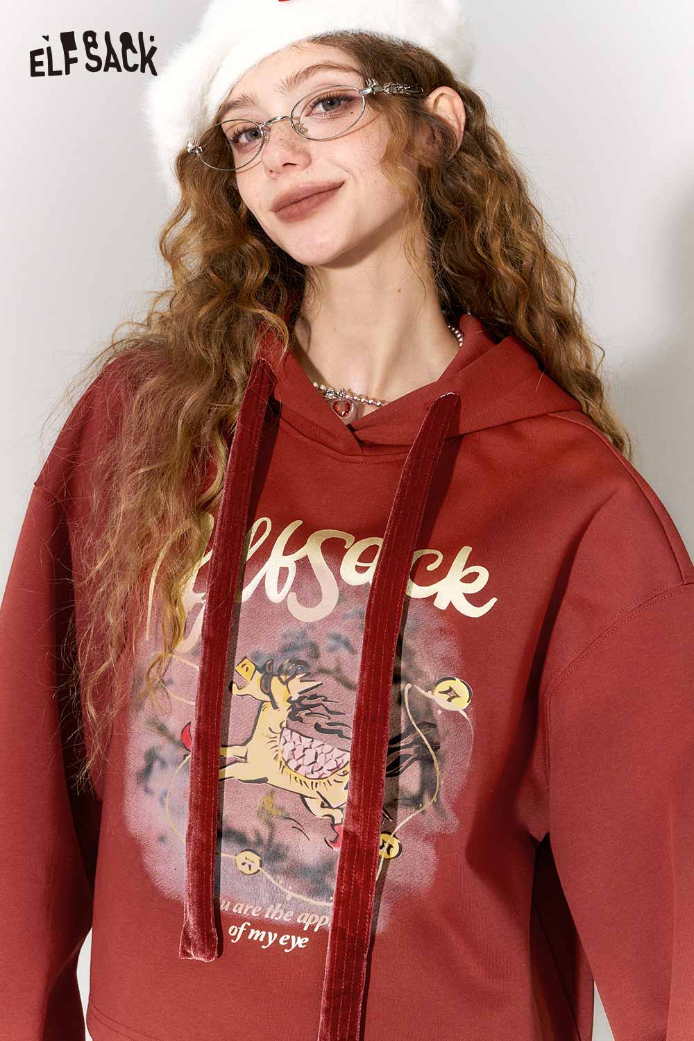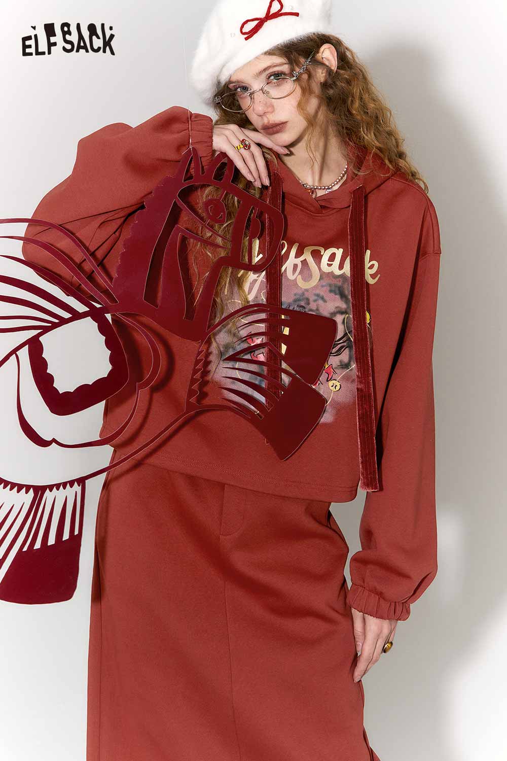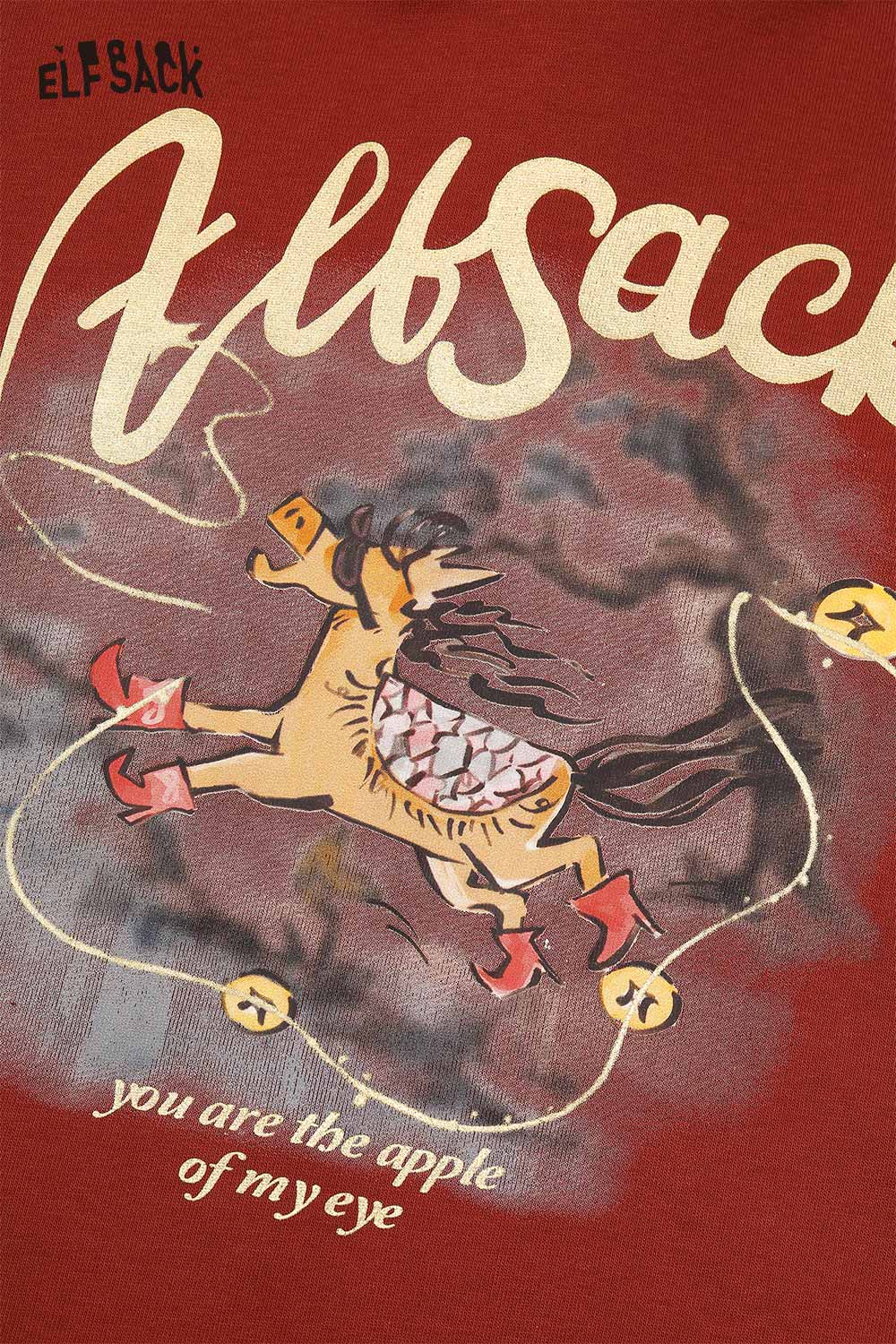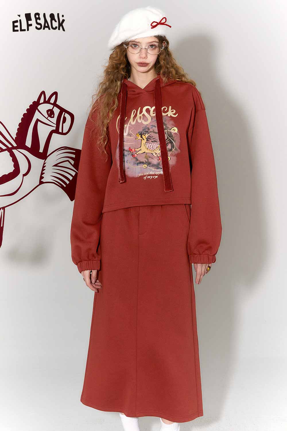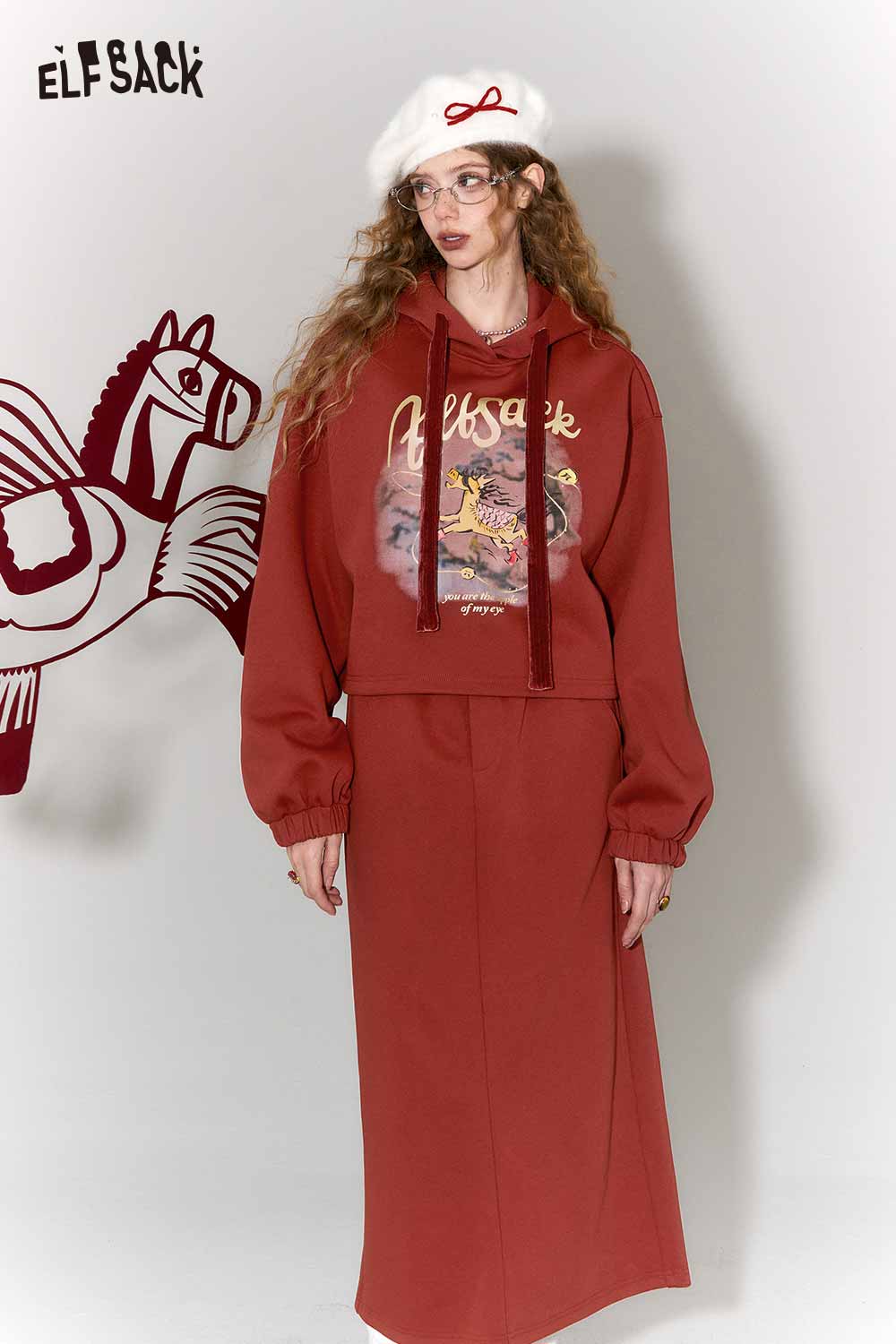Casual Kylin Print Burgundy Hooded Sweatshirt Skirt Set