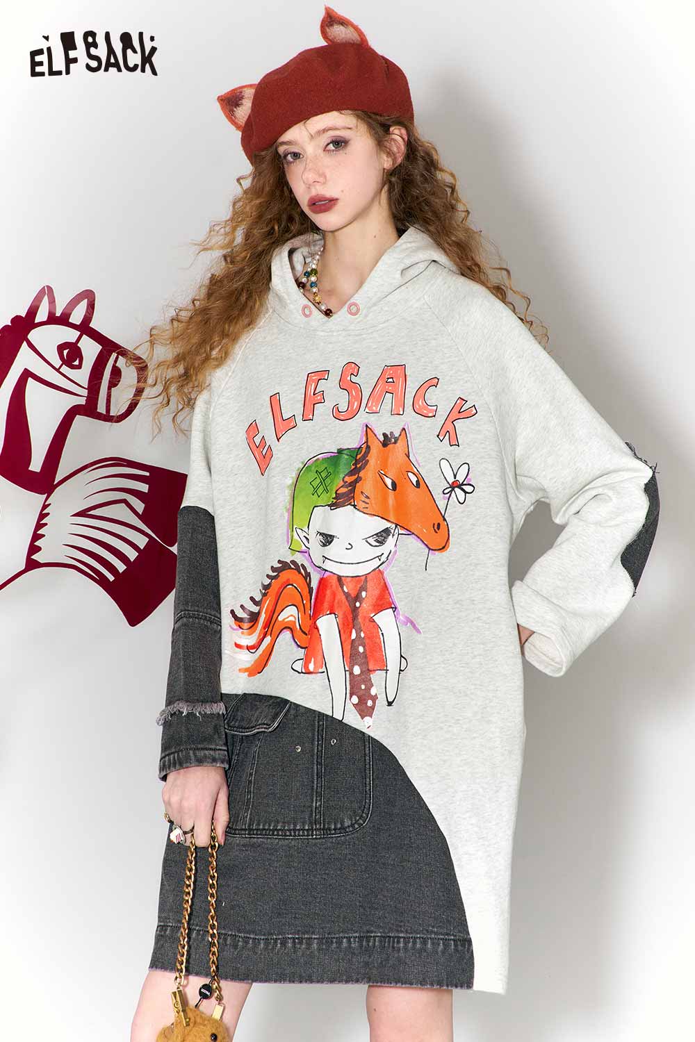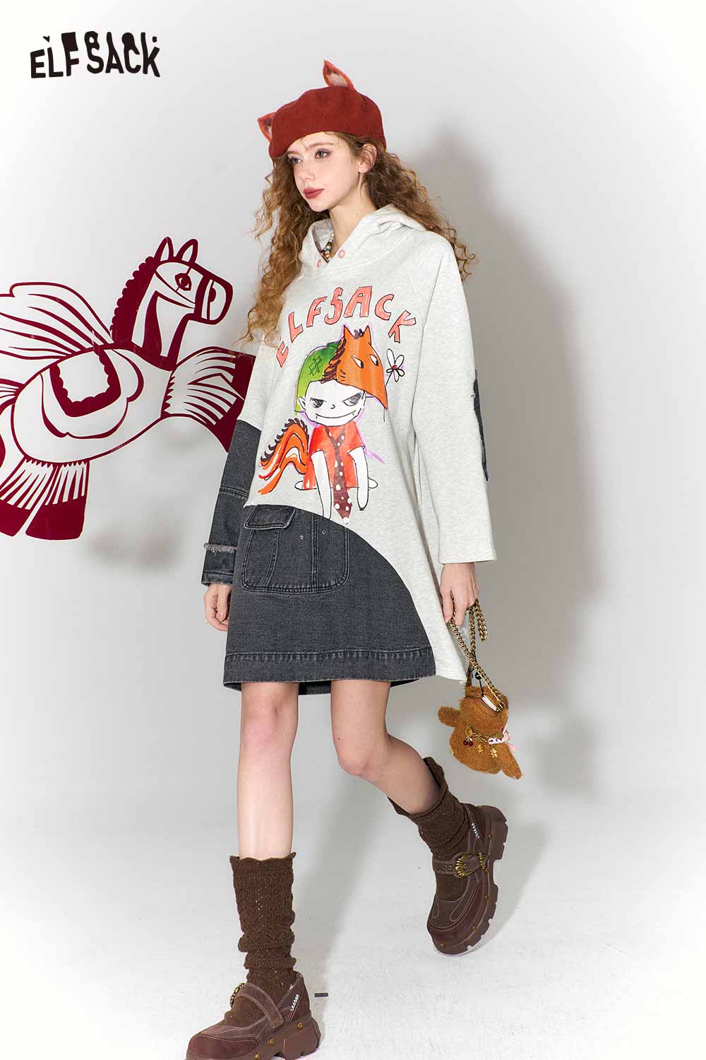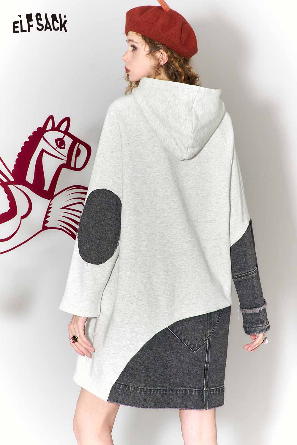 Casual Loose Cotton Denim Patchwork Doodle Print Hoodie Dress