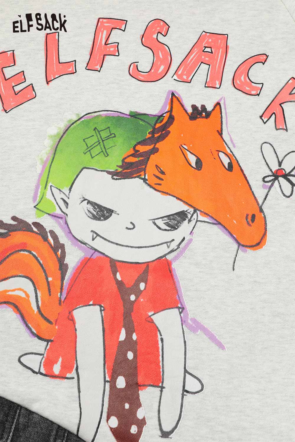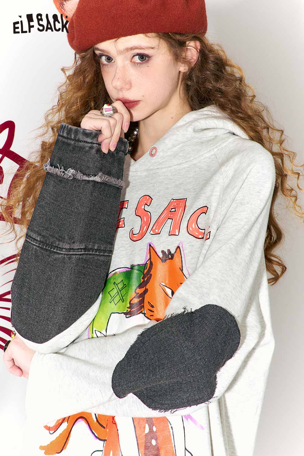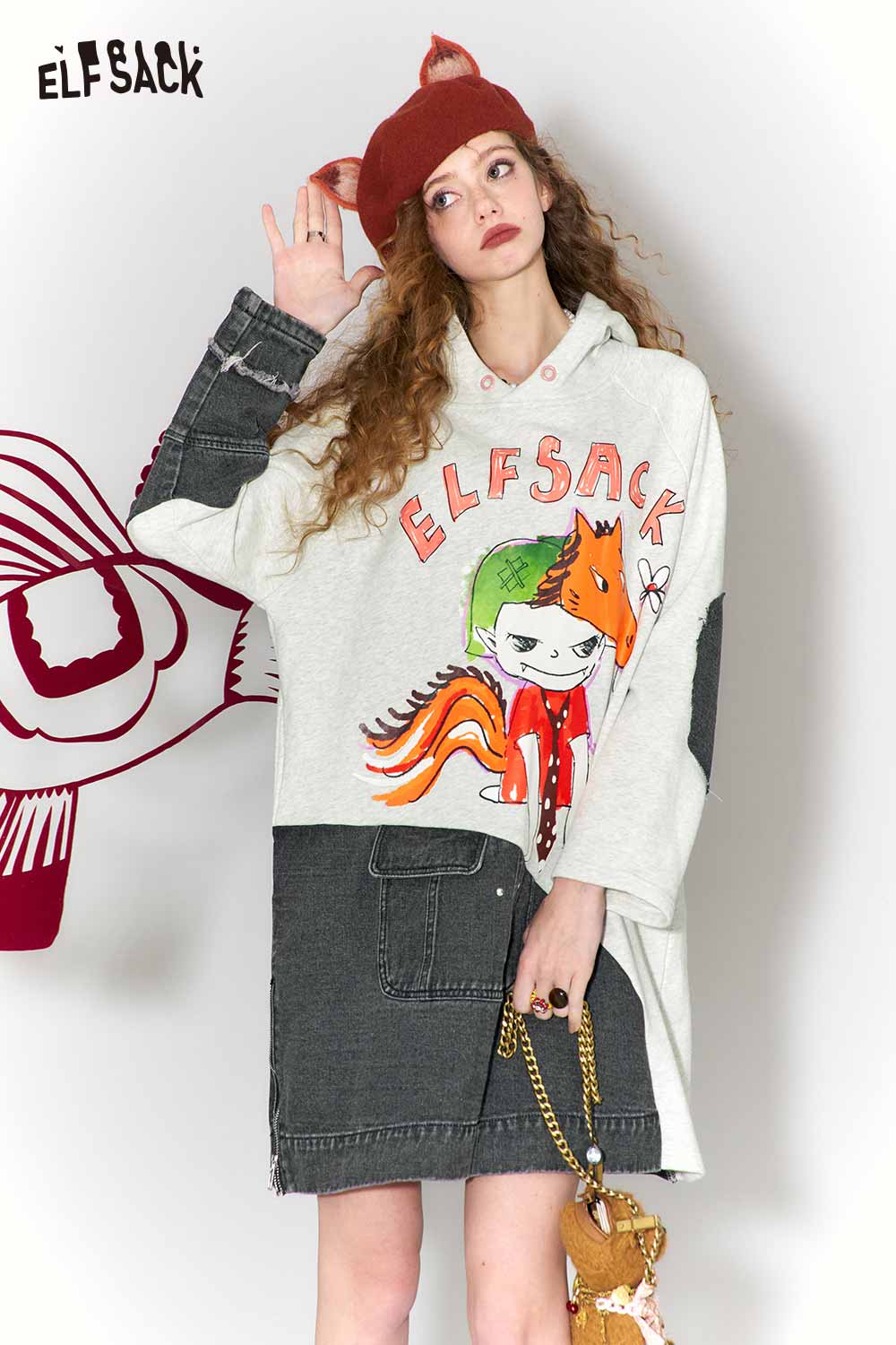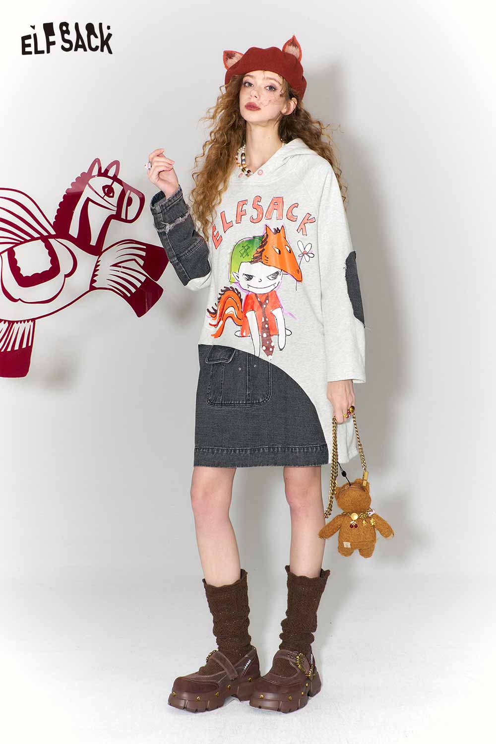 Casual Loose Cotton Denim Patchwork Doodle Print Hoodie Dress