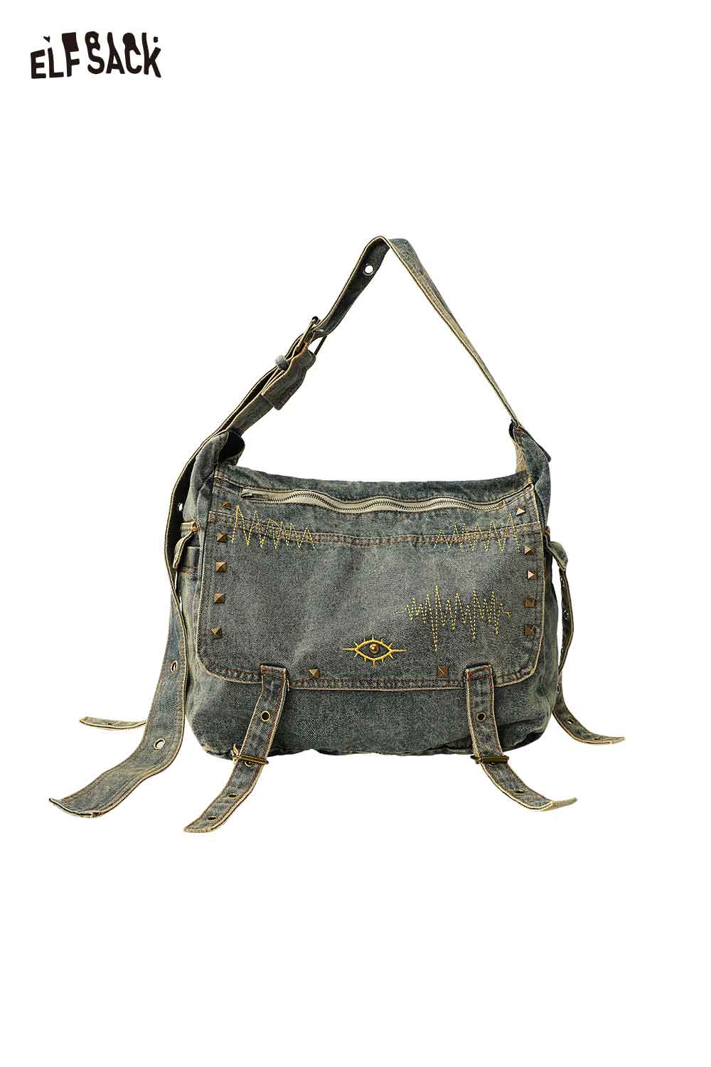 Distressed Denim Shoulder Bag with Artisan Embroidery Structured Oversized Tote