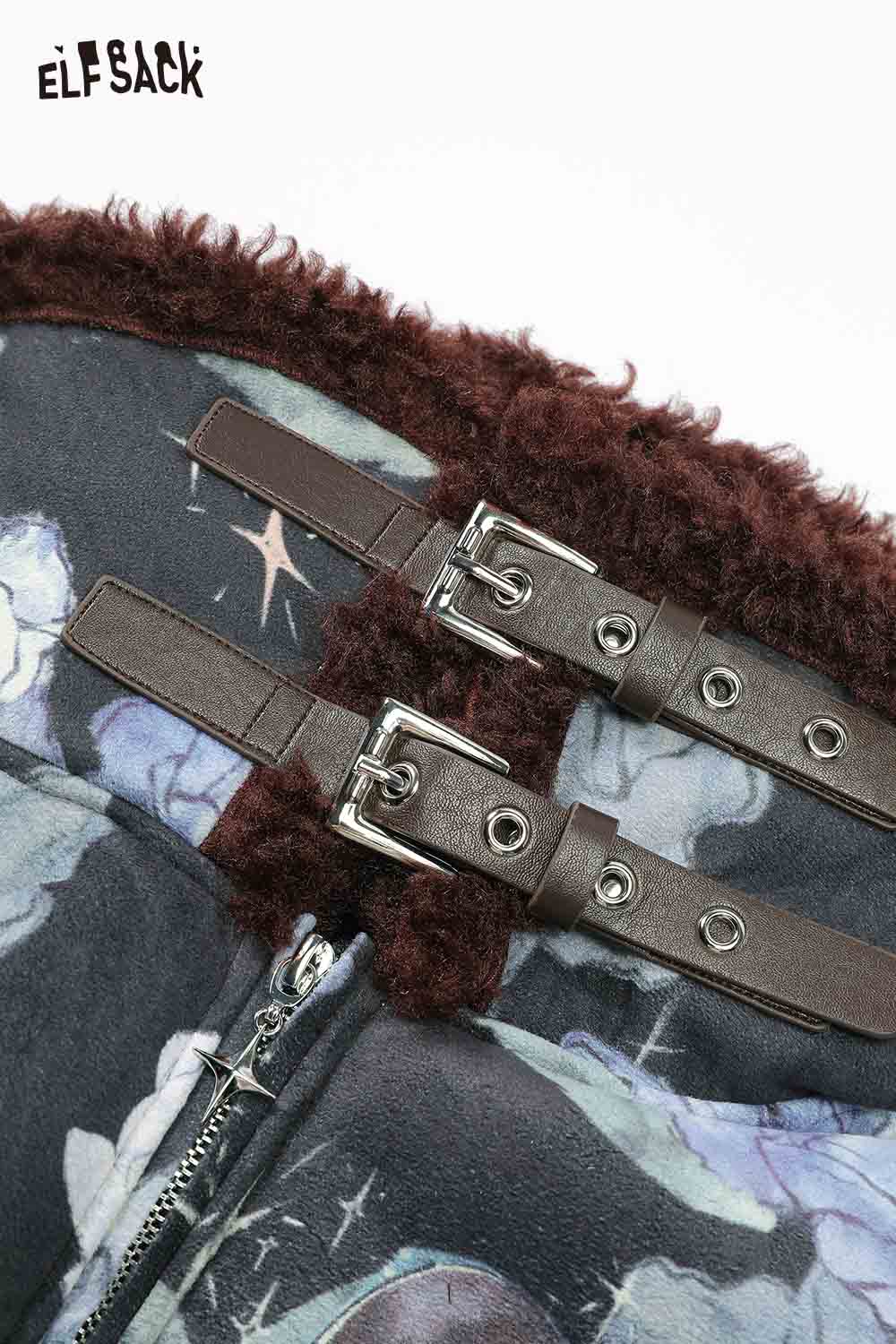 ELFSACK floral graphic lapel coat for women featuring unique floral patterns and stylish buckled design