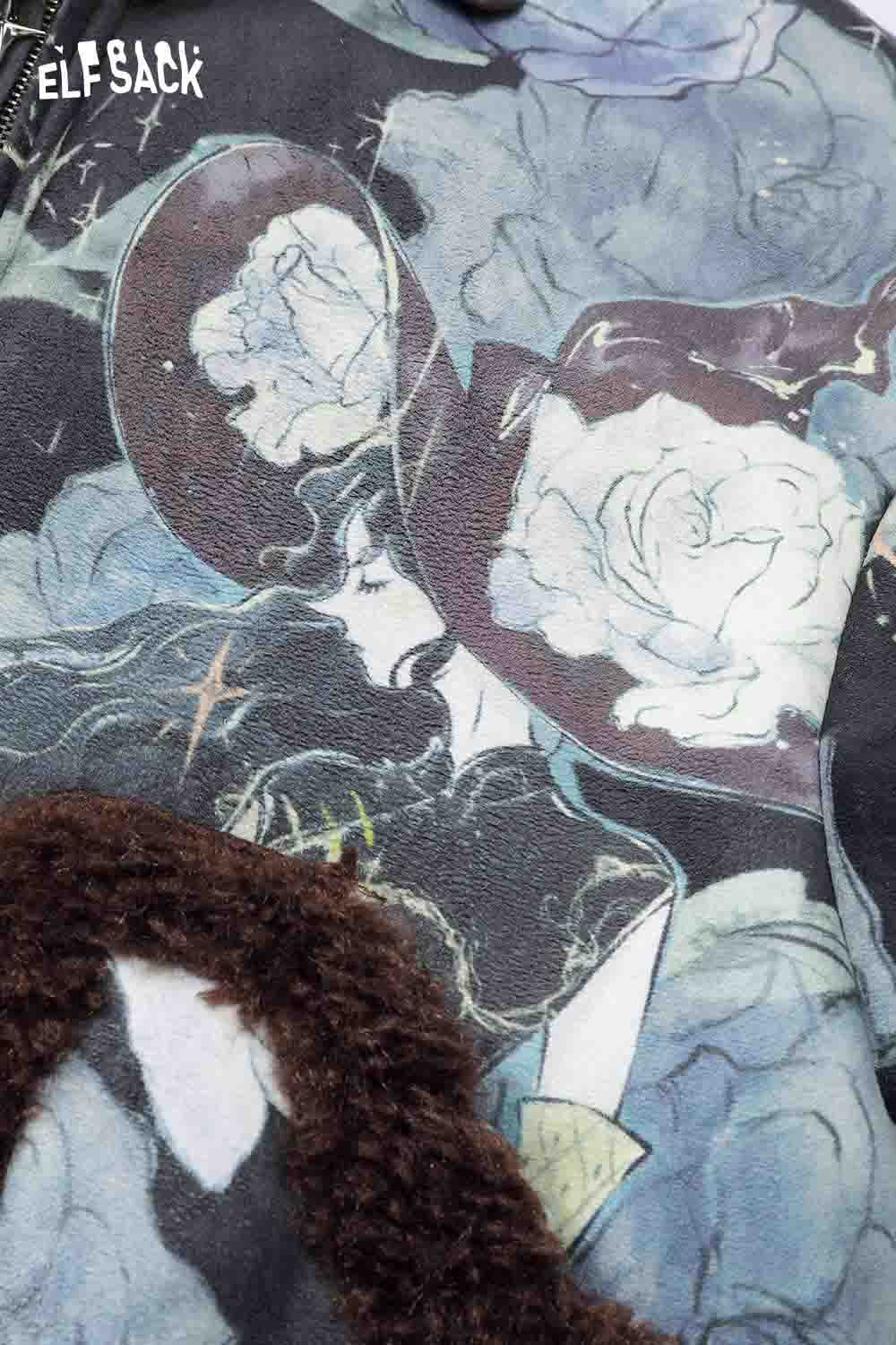 ELFSACK floral graphic lapel coat for women with cozy fur collar and stylish floral pattern