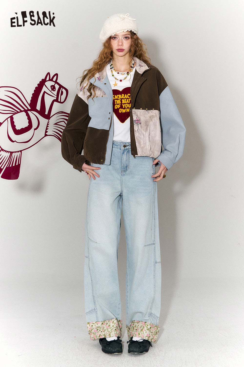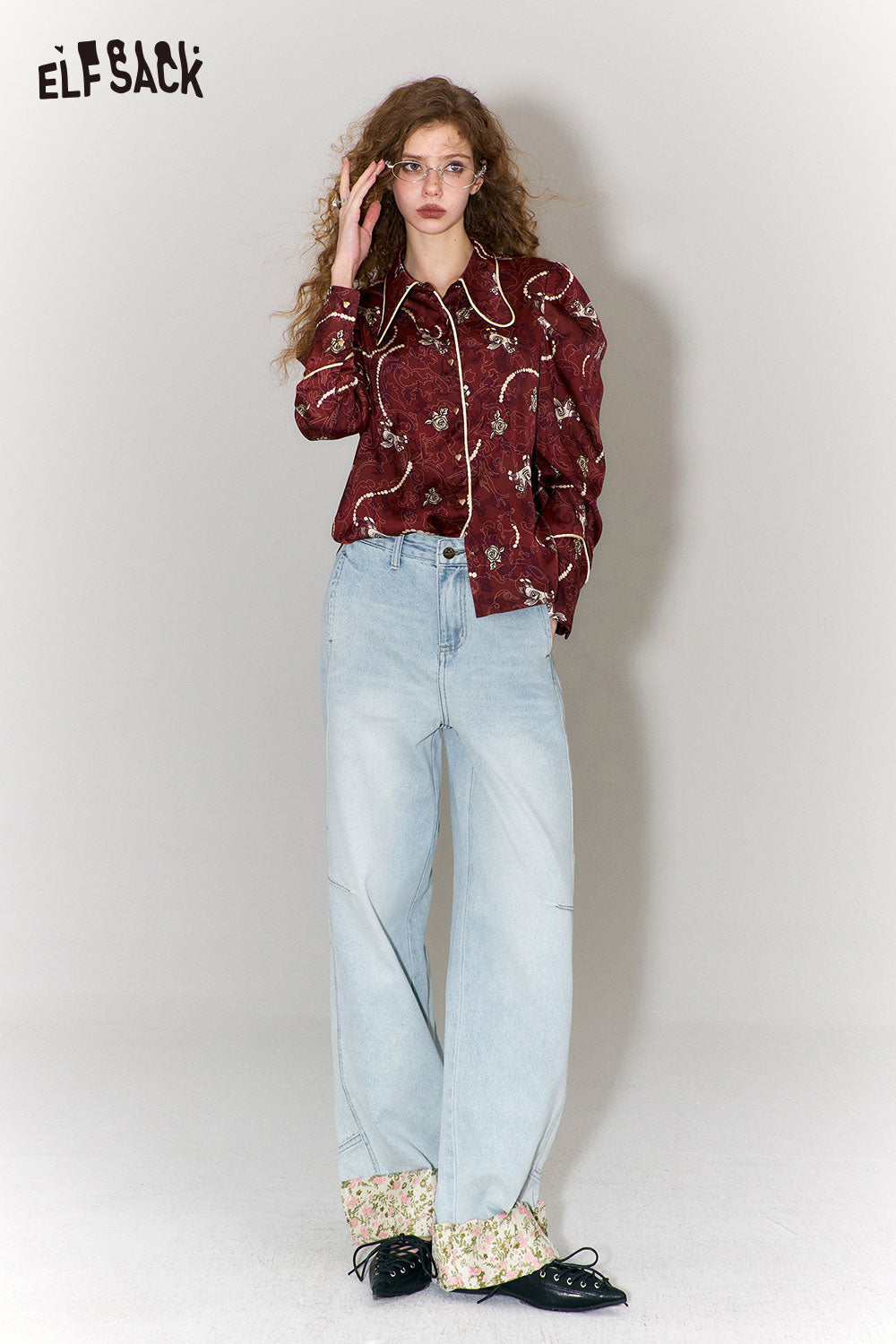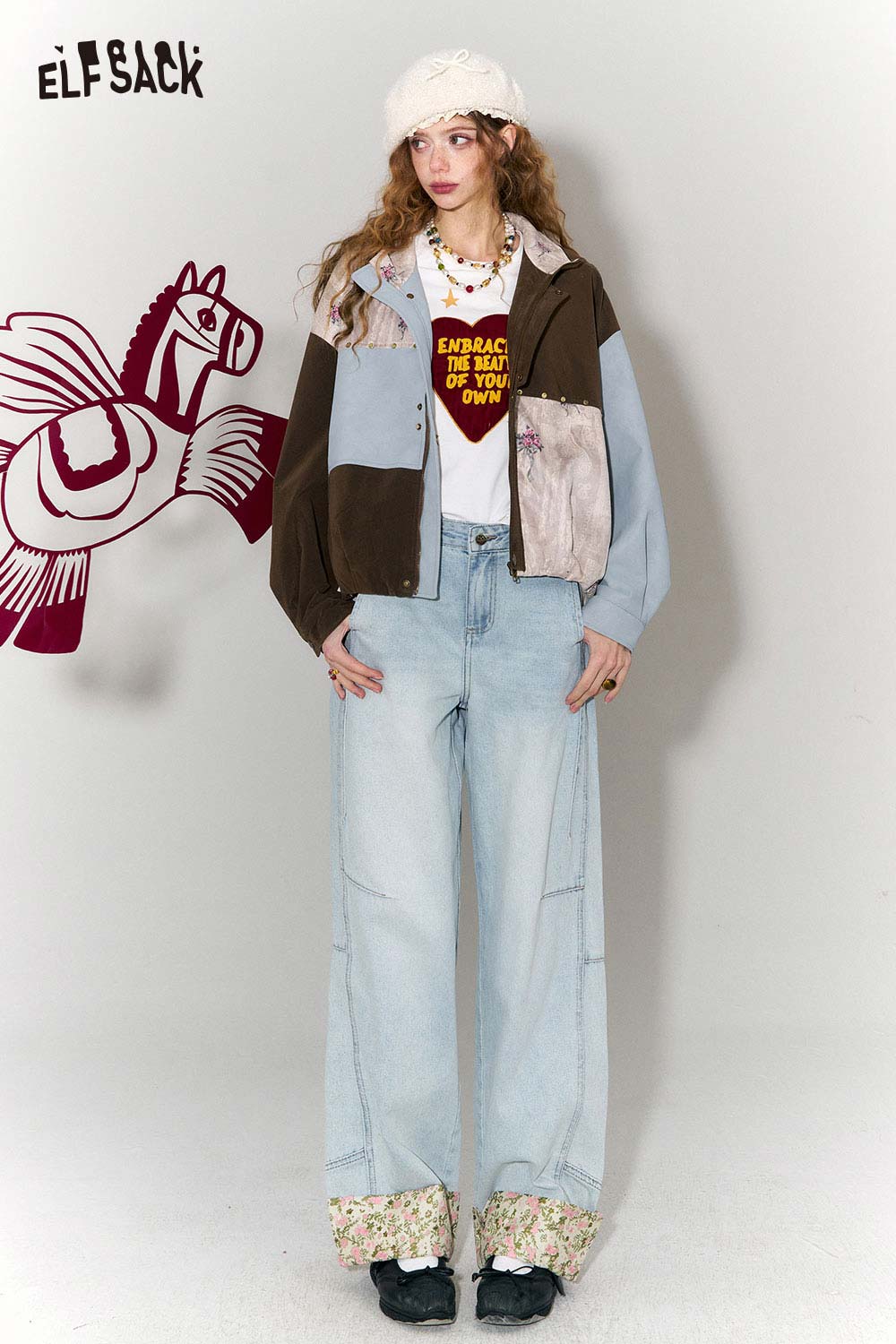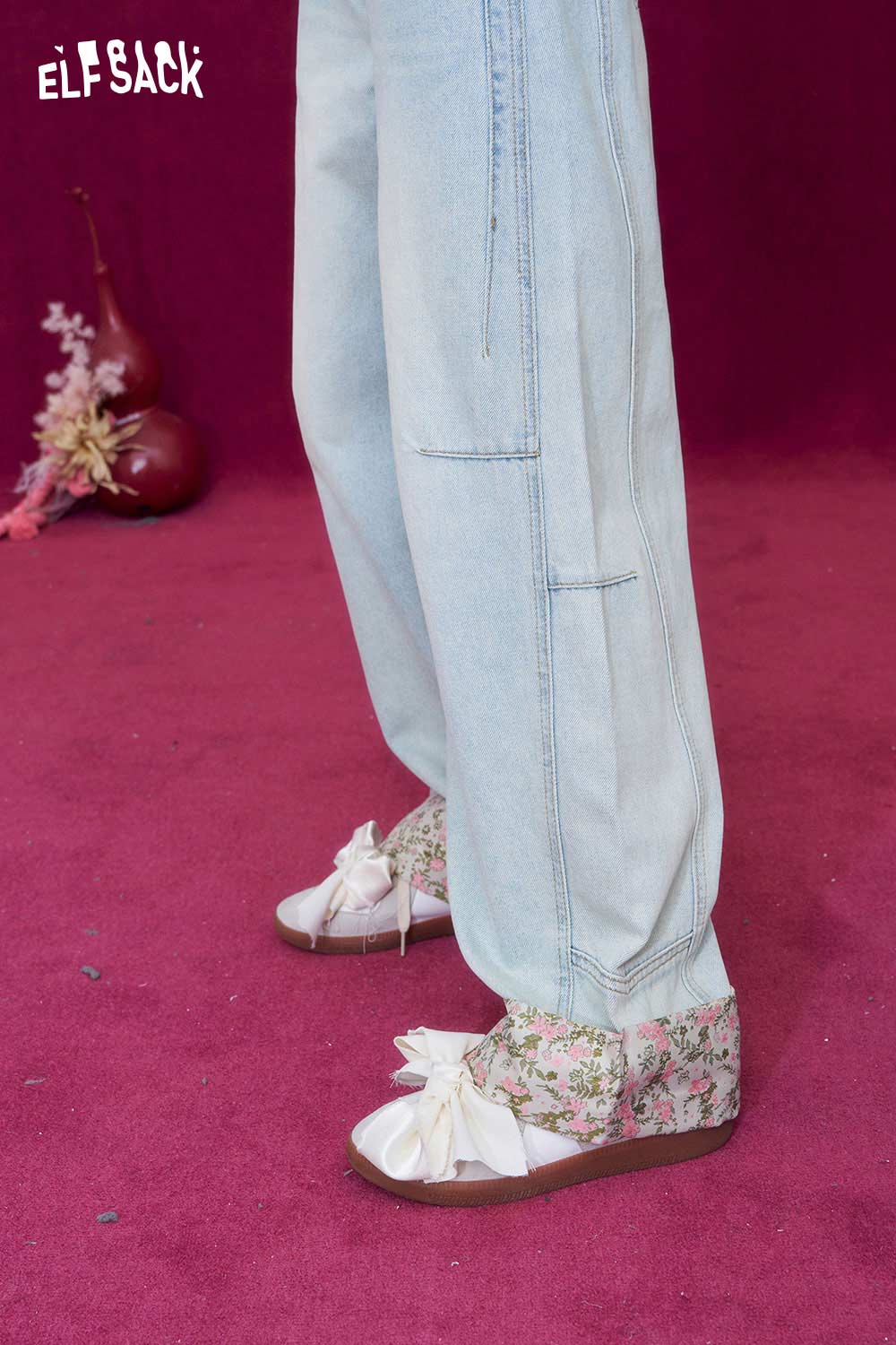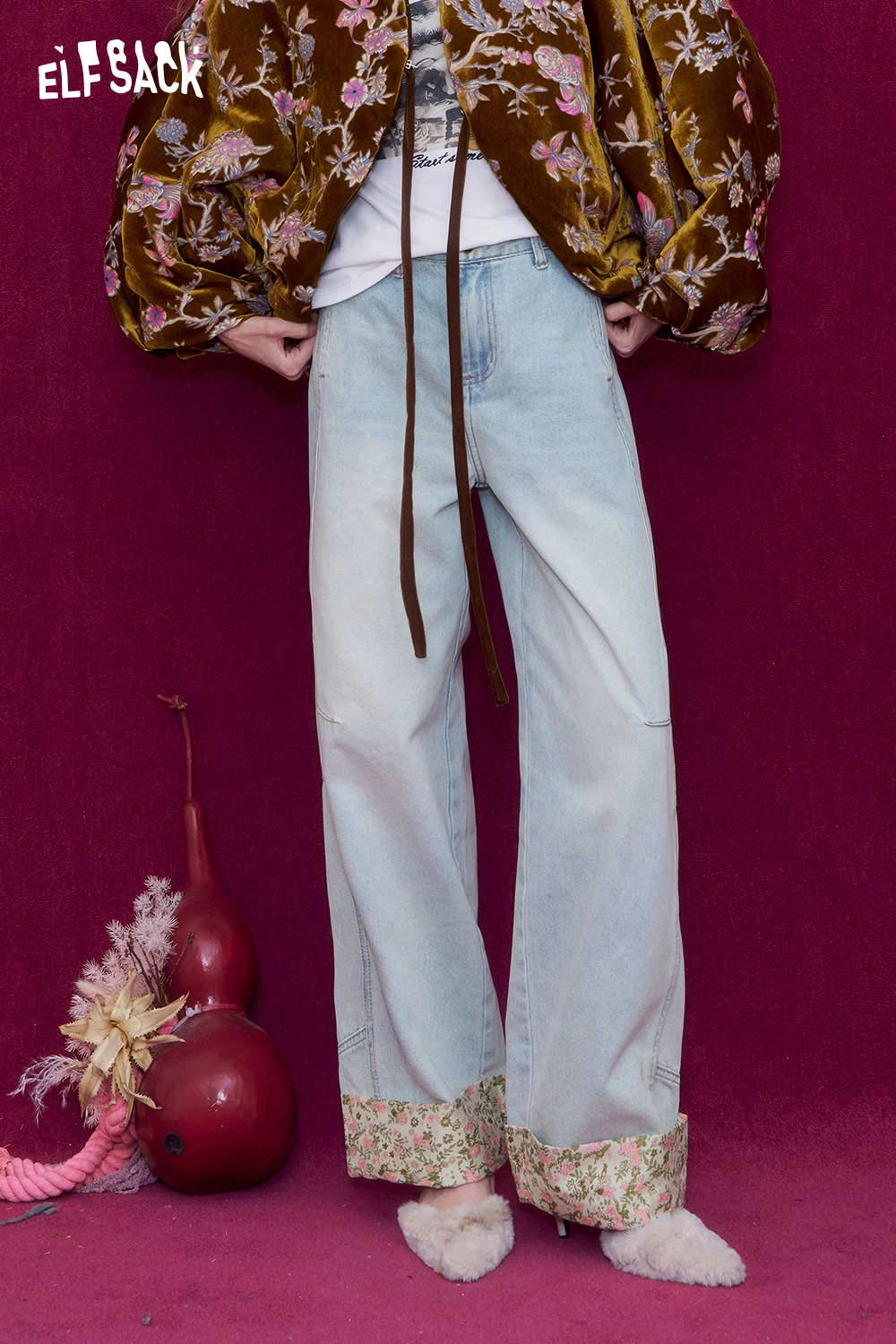 New Oriental Style Floral Hem Patch Straight Leg Jeans