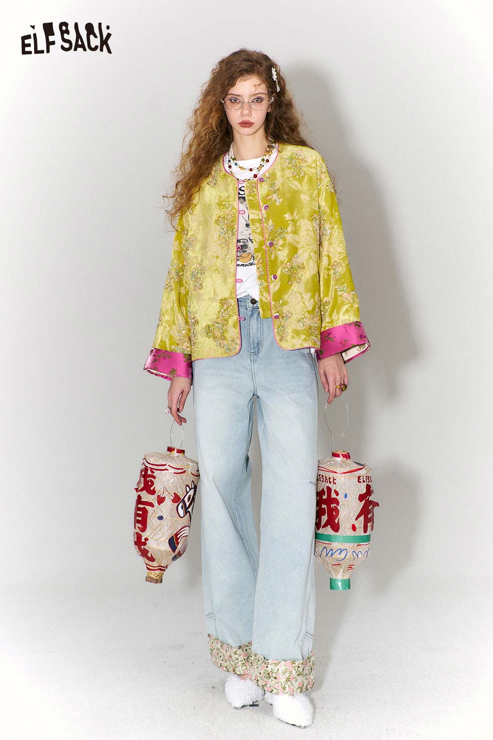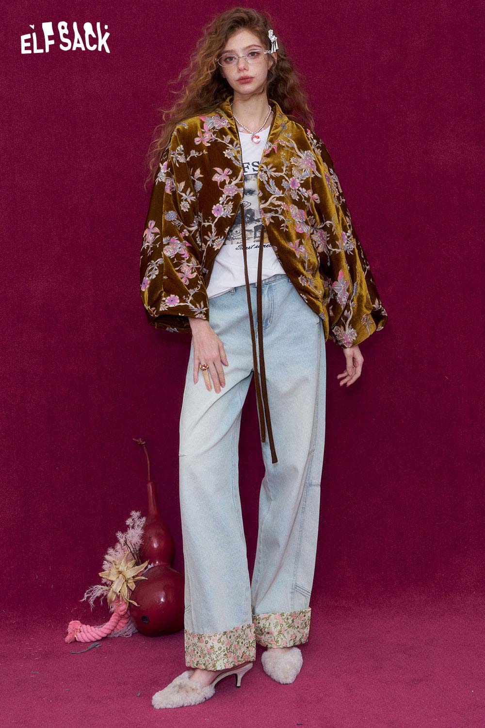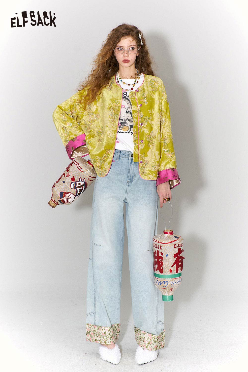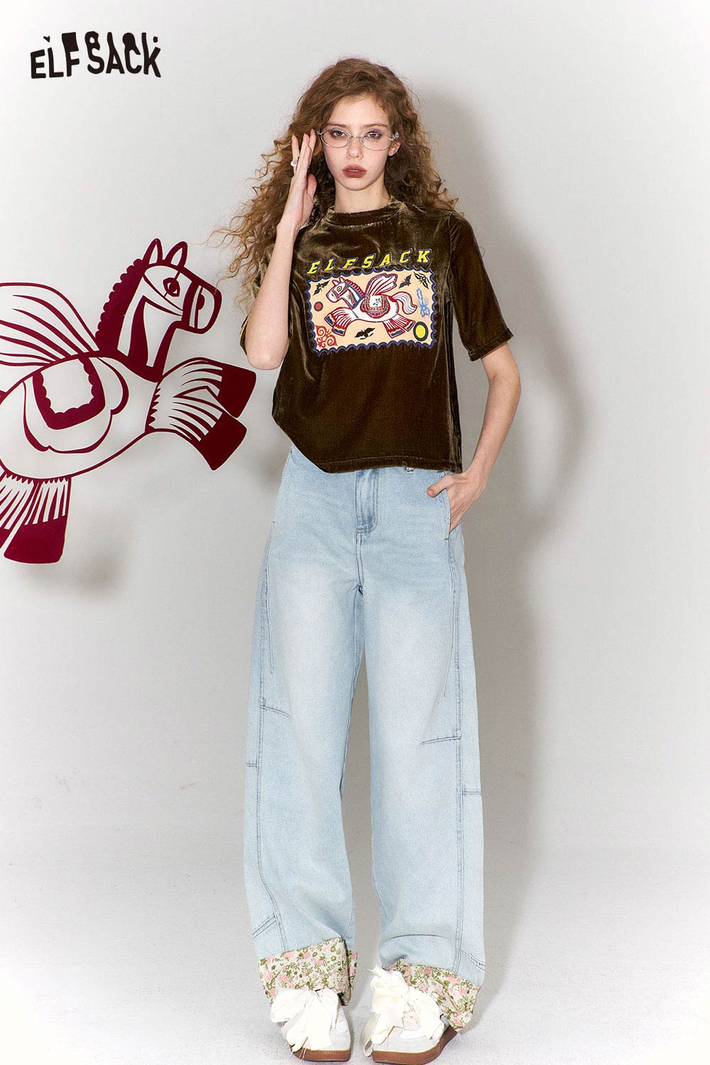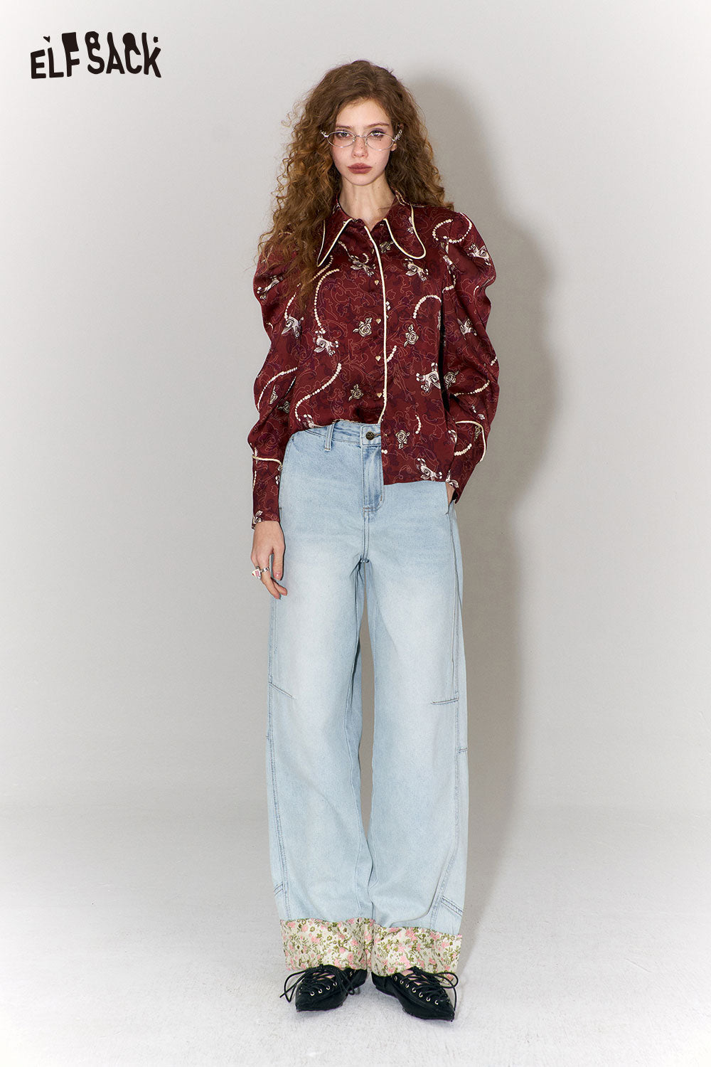 New Oriental Style Floral Hem Patch Straight Leg Jeans