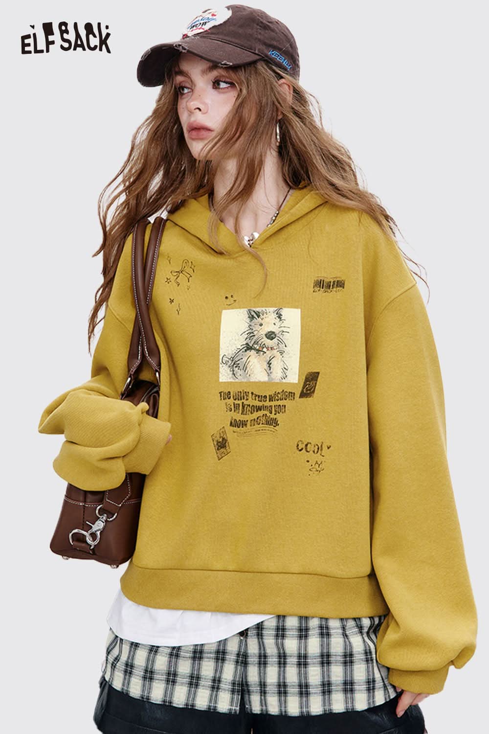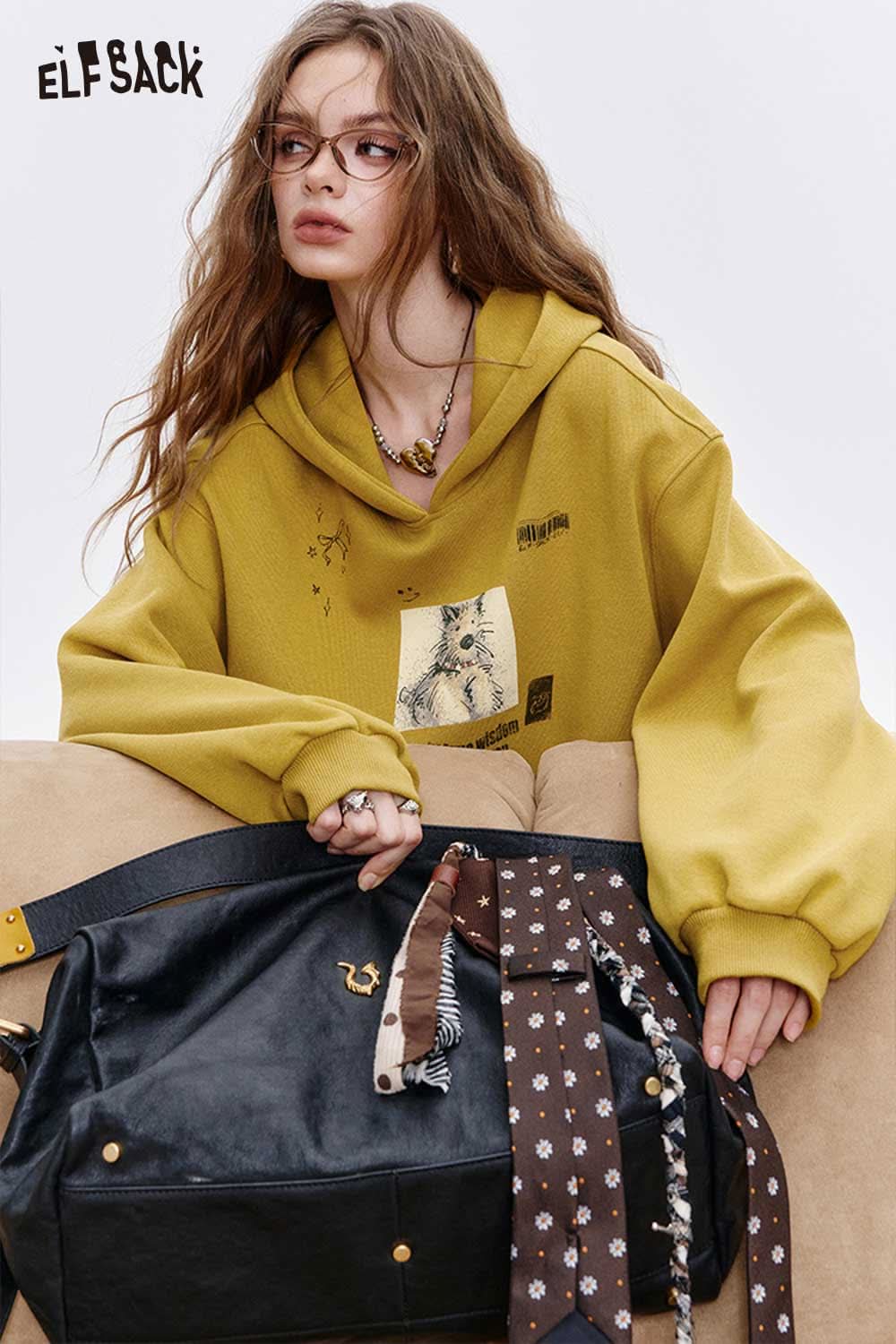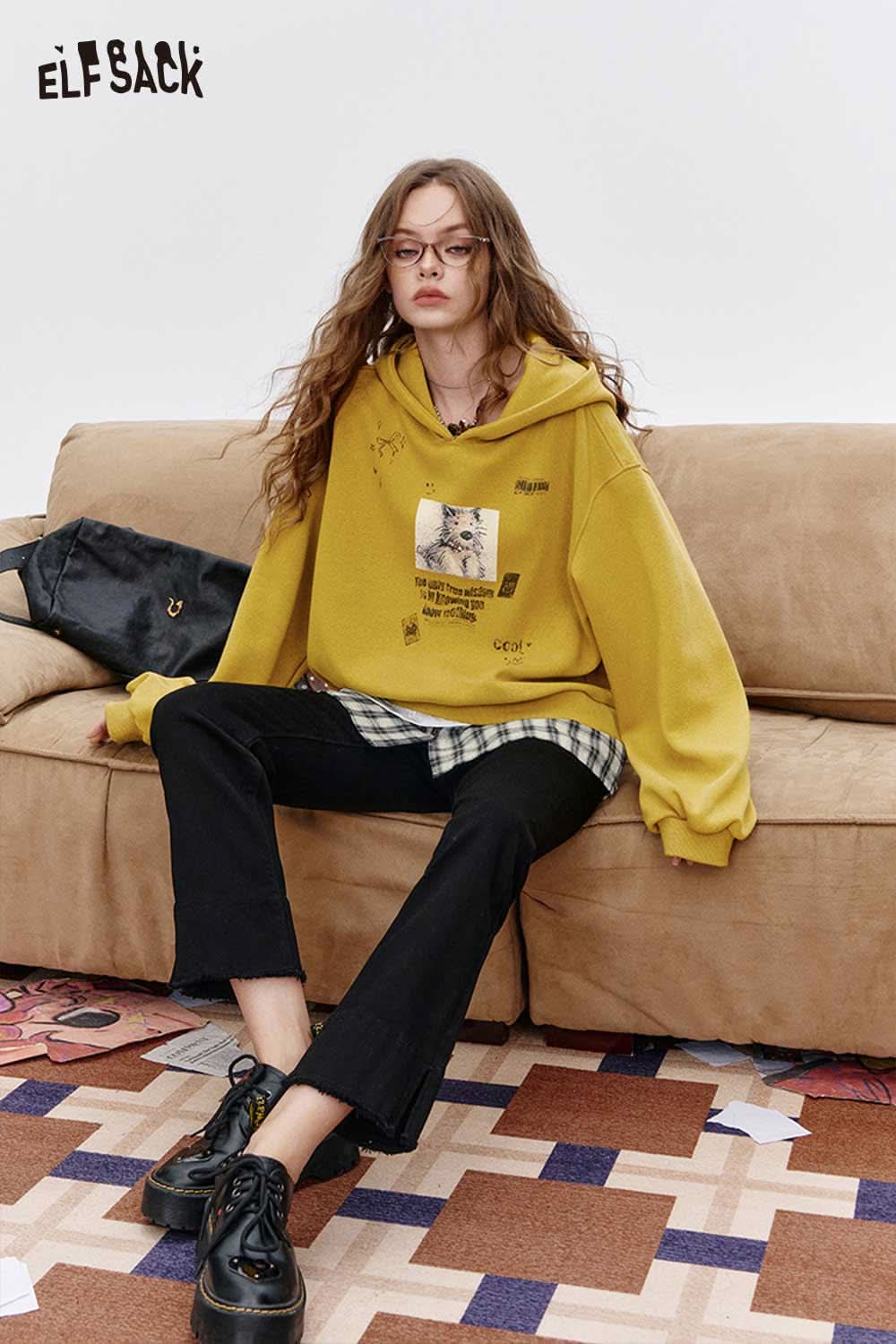 ELFSACK oversized plaid hoodie in yellow with graphic print for a stylish casual look