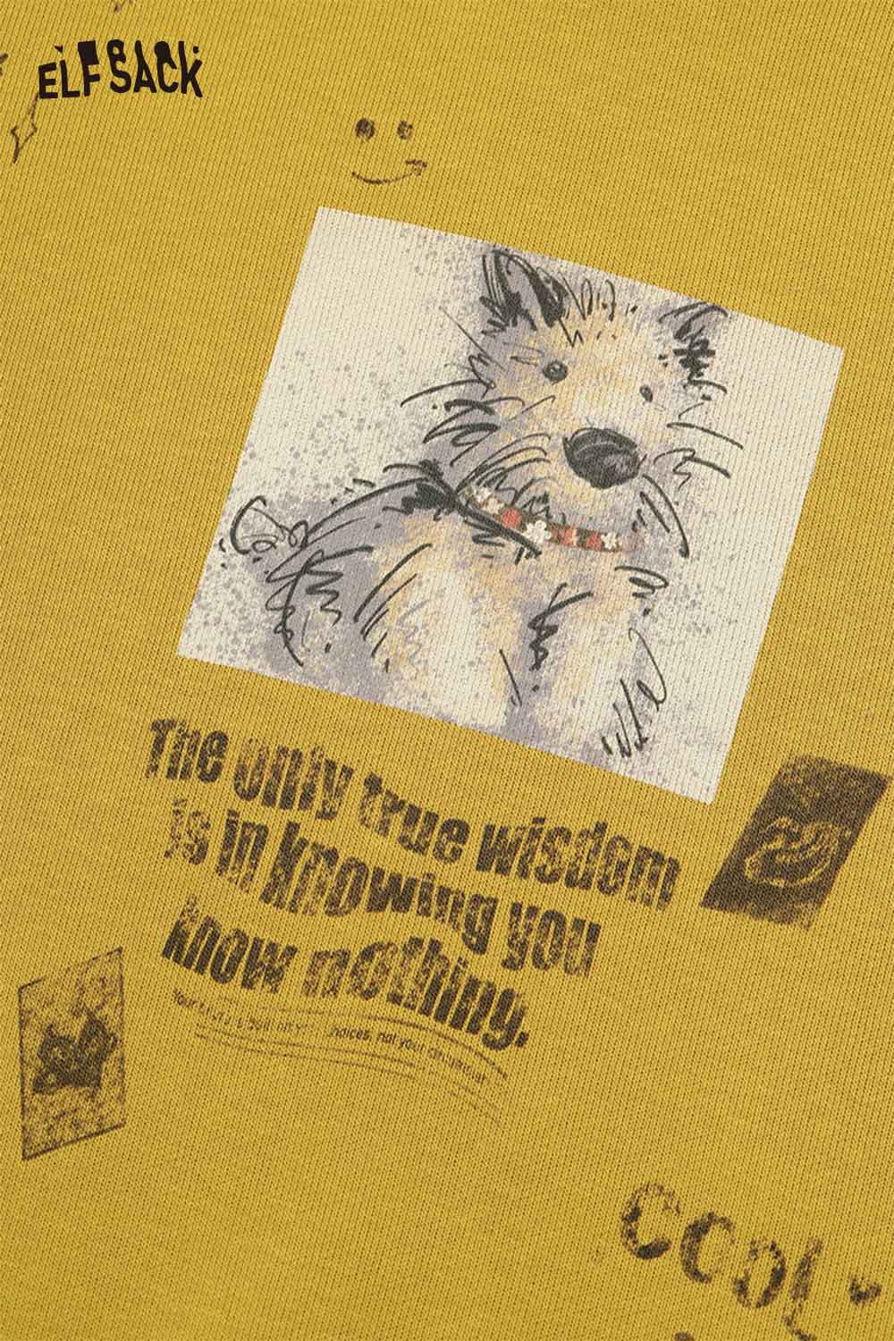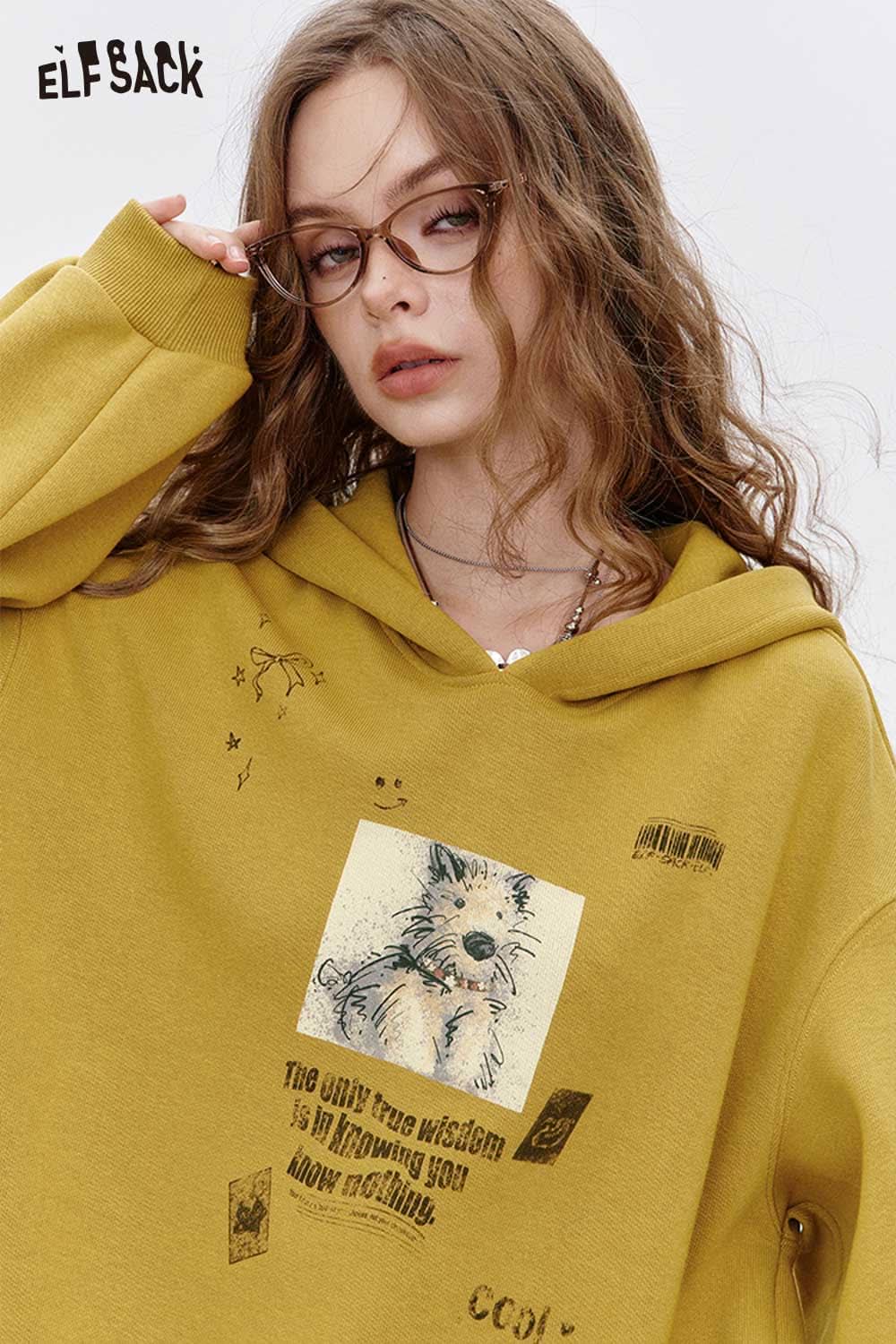 ELFSACK oversized plaid hoodie in yellow with playful dog graphic and text print