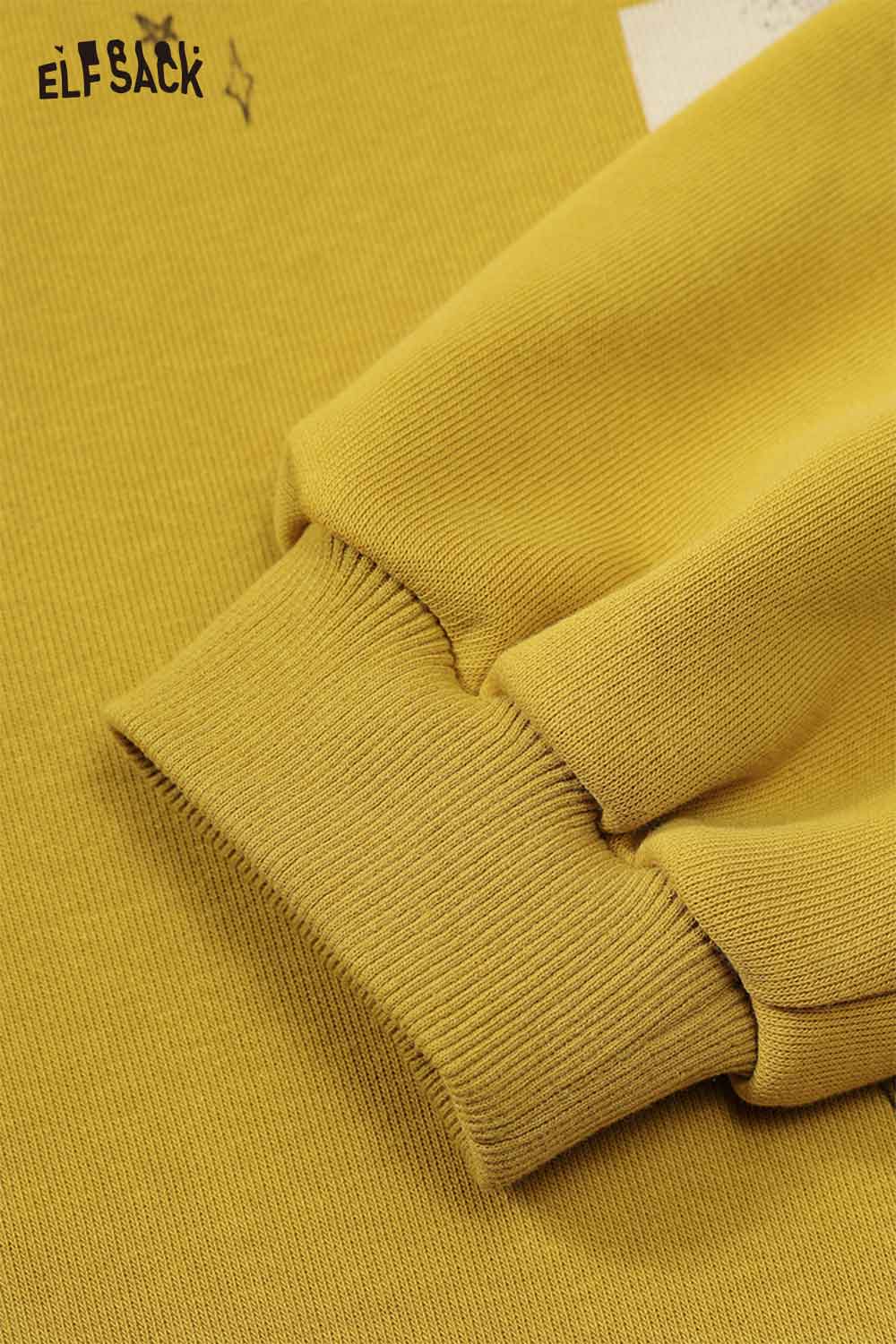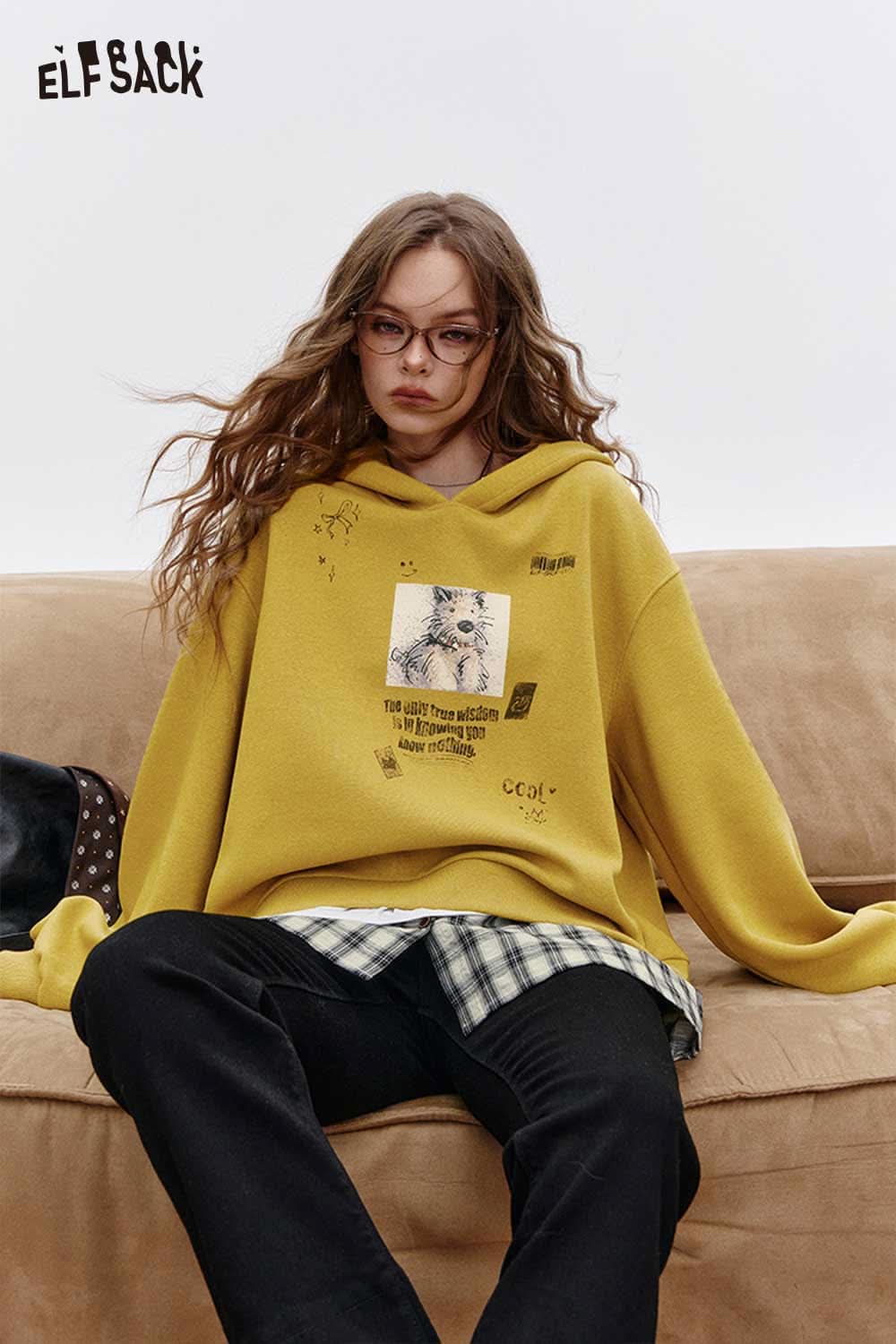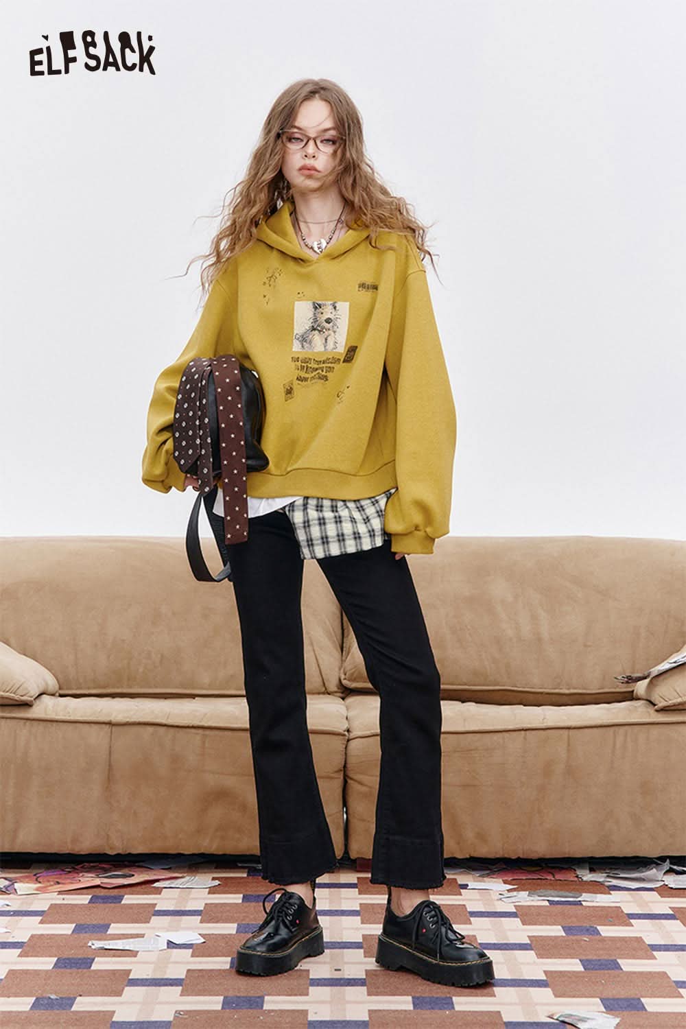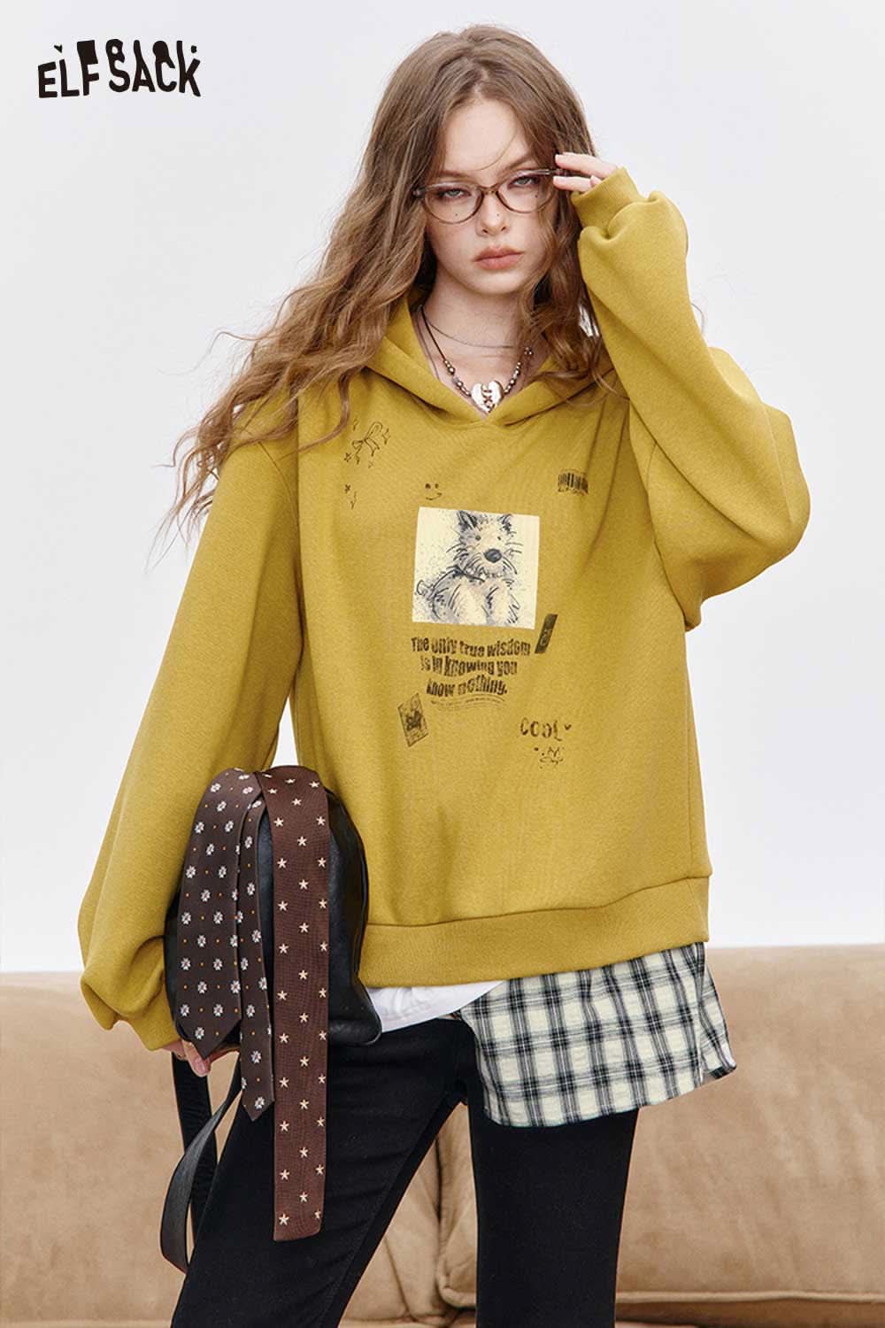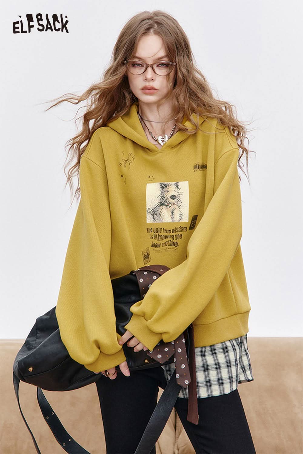 ELFSACK oversized plaid hoodie in mustard yellow featuring playful graphics and a cozy design
